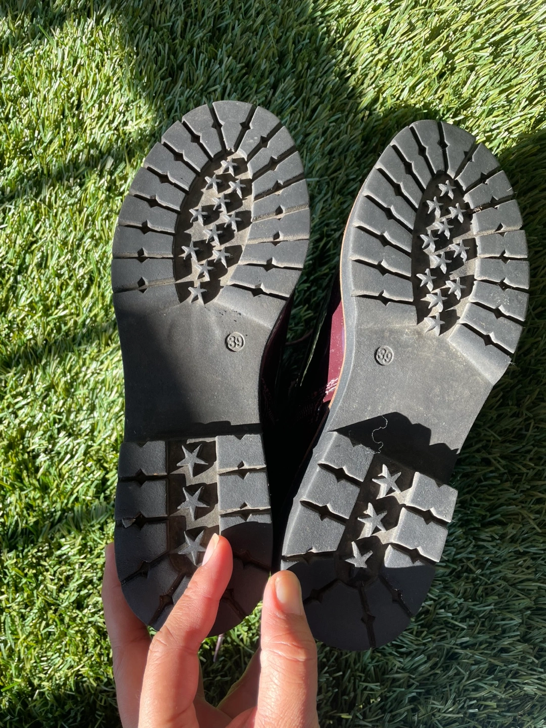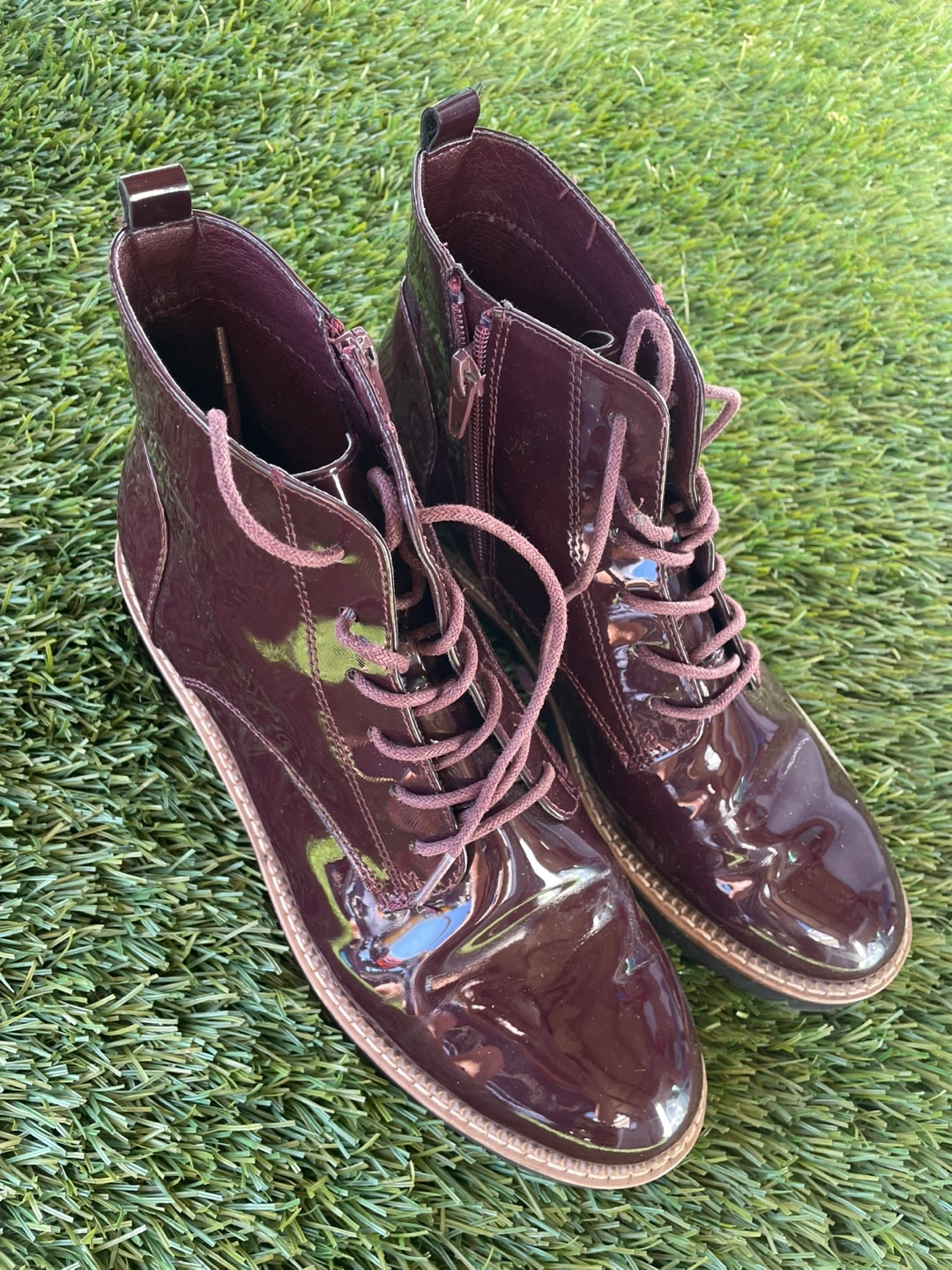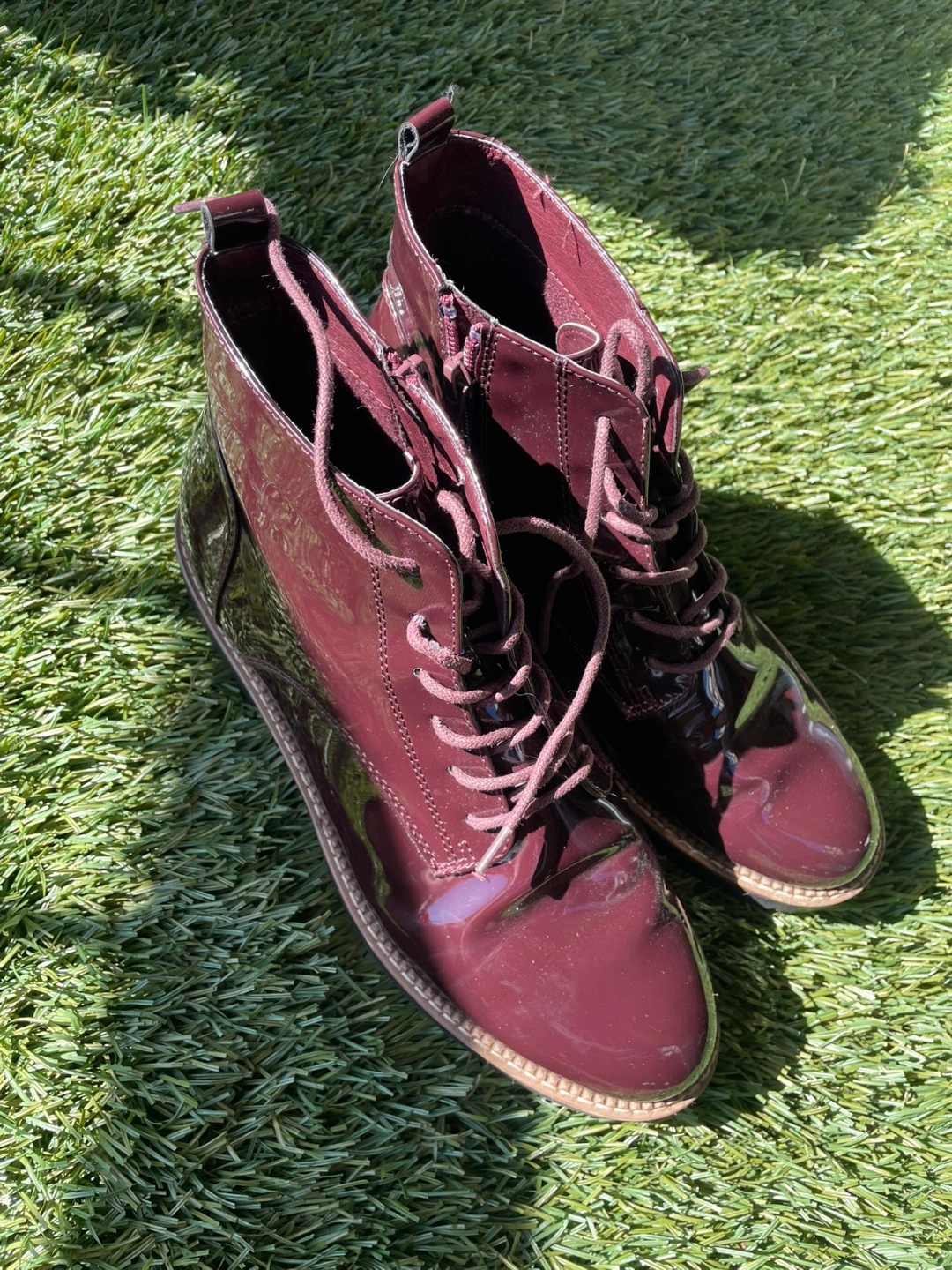 These burgundy patent leather ankle boots are in great condition! They feature a lace-up design with a side zipper for easy on and off. The soles have a unique star pattern. Size 9. These were gifted to me but too big for me.