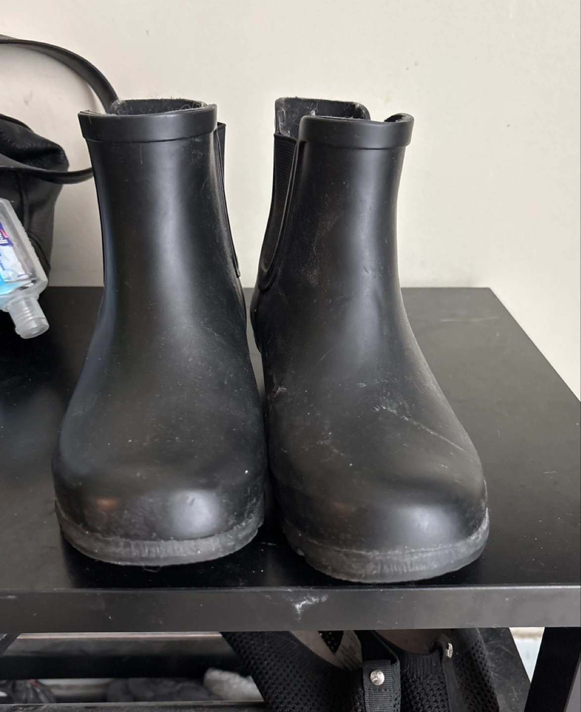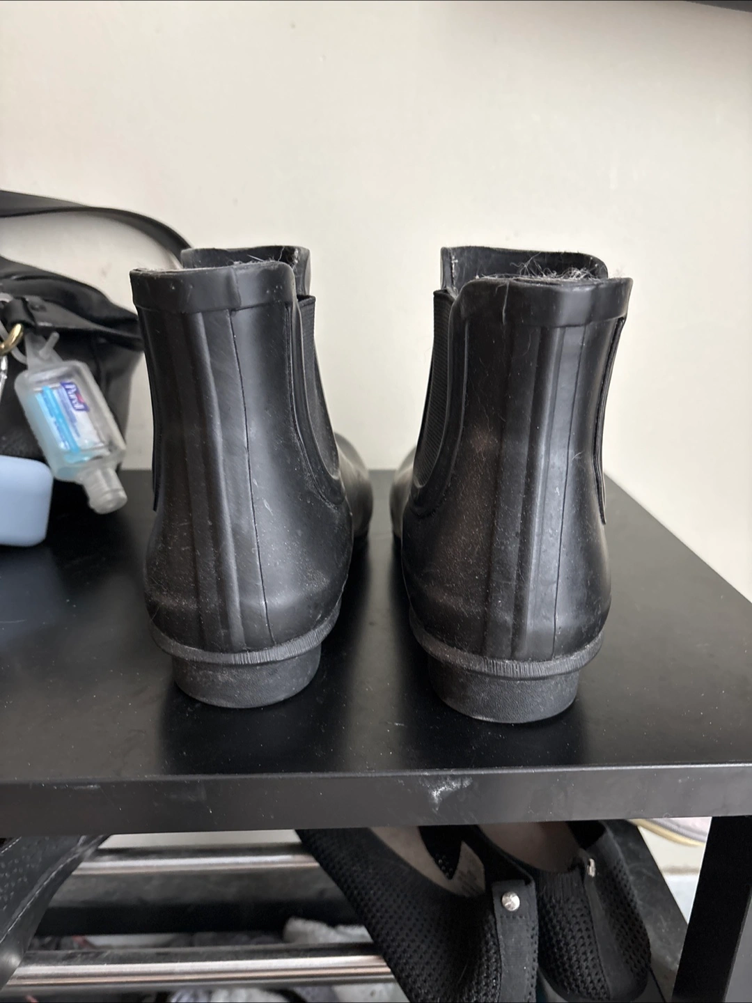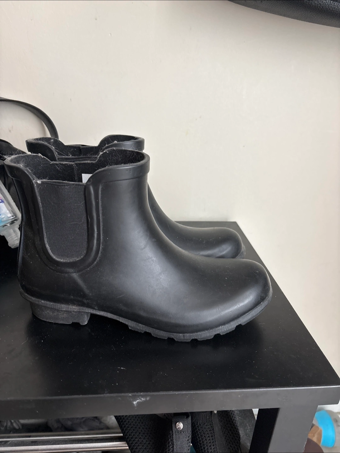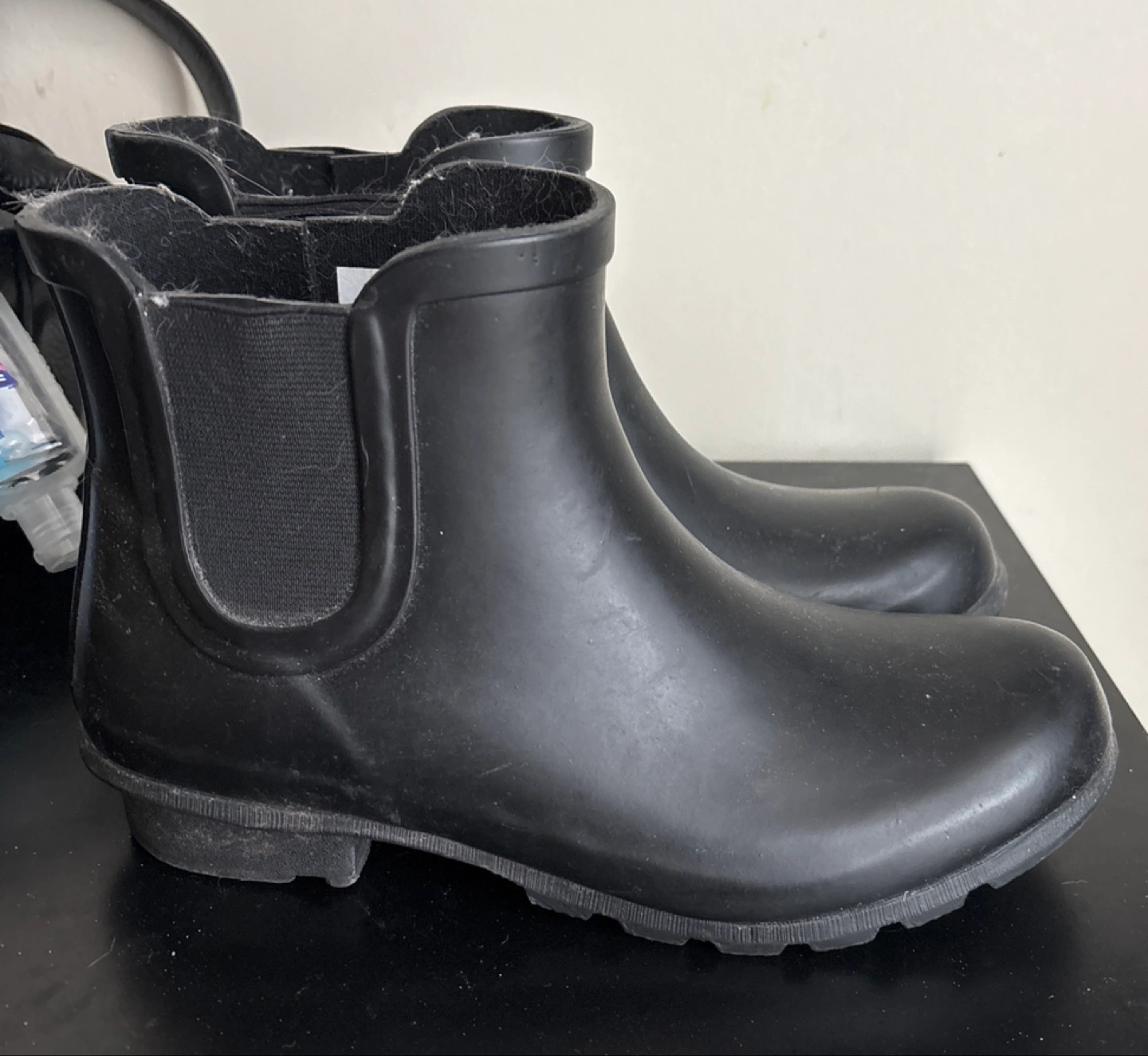 Selling a pair of London Fog black rubber ankle rain boots. They're in good condition and perfect for rainy days!