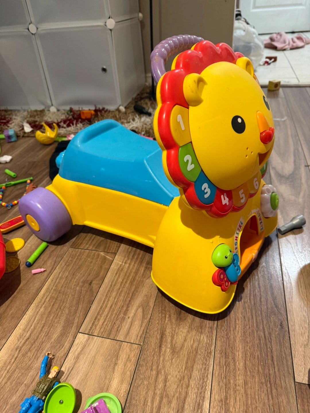 This is a Fisher-Price Lion Walker. It's in good condition and ready for a new home! It's a fun way to help your little one learn to walk and explore. The lion's mane features numbers, and there are other interactive elements to keep your child entertained