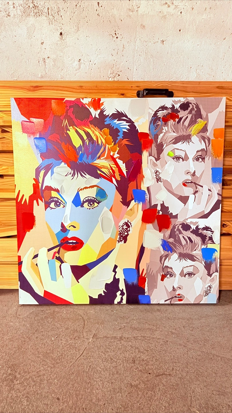 Canvas wall art featuring Audrey Hepburn in a colourful pop art style. Perfect for adding a touch of elegance to any room