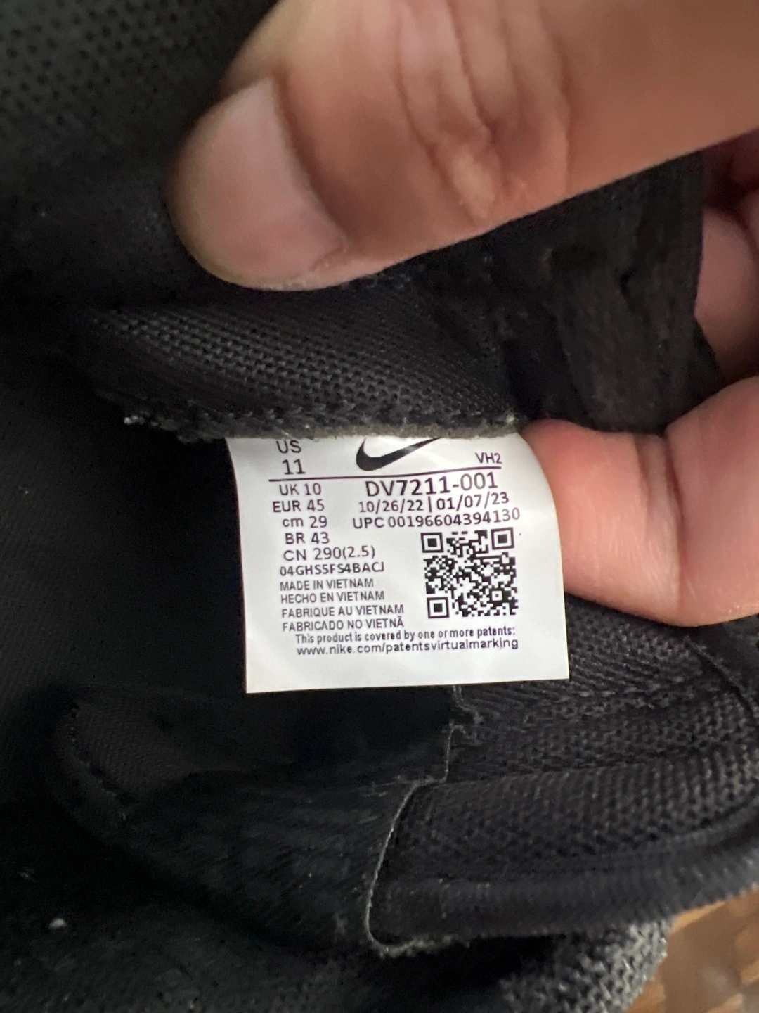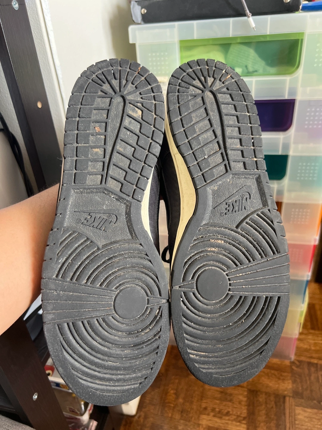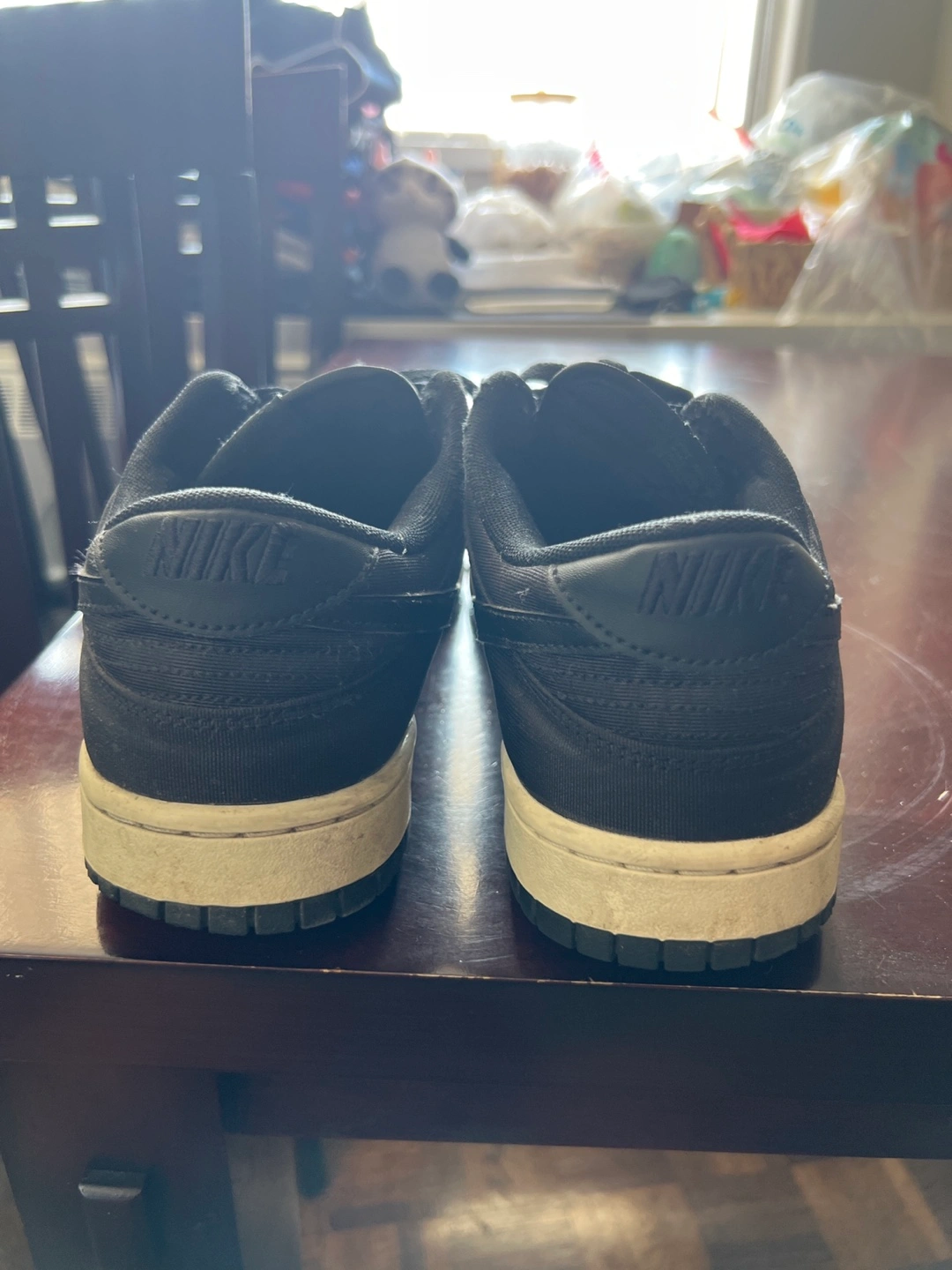 Selling a pair of Nike Dunk Low sneakers in black, size 11 US. They're in good condition with some signs of wear on the soles as shown in the pictures. The manufacturing date is 2022 October 26