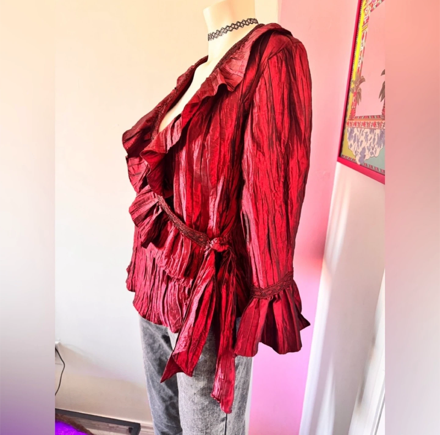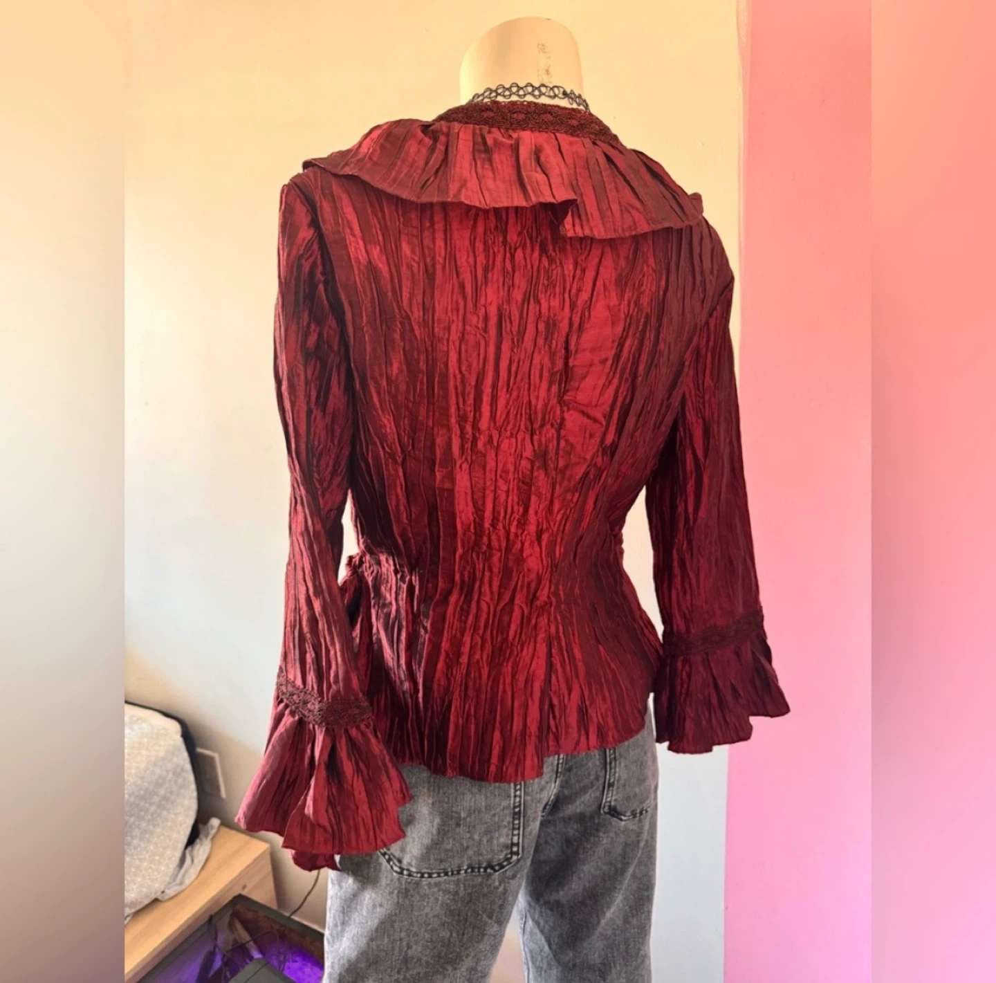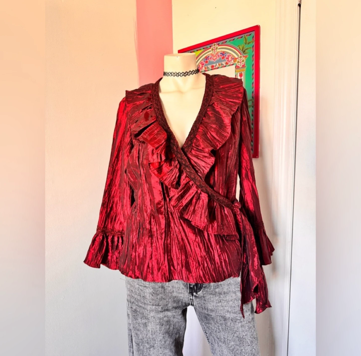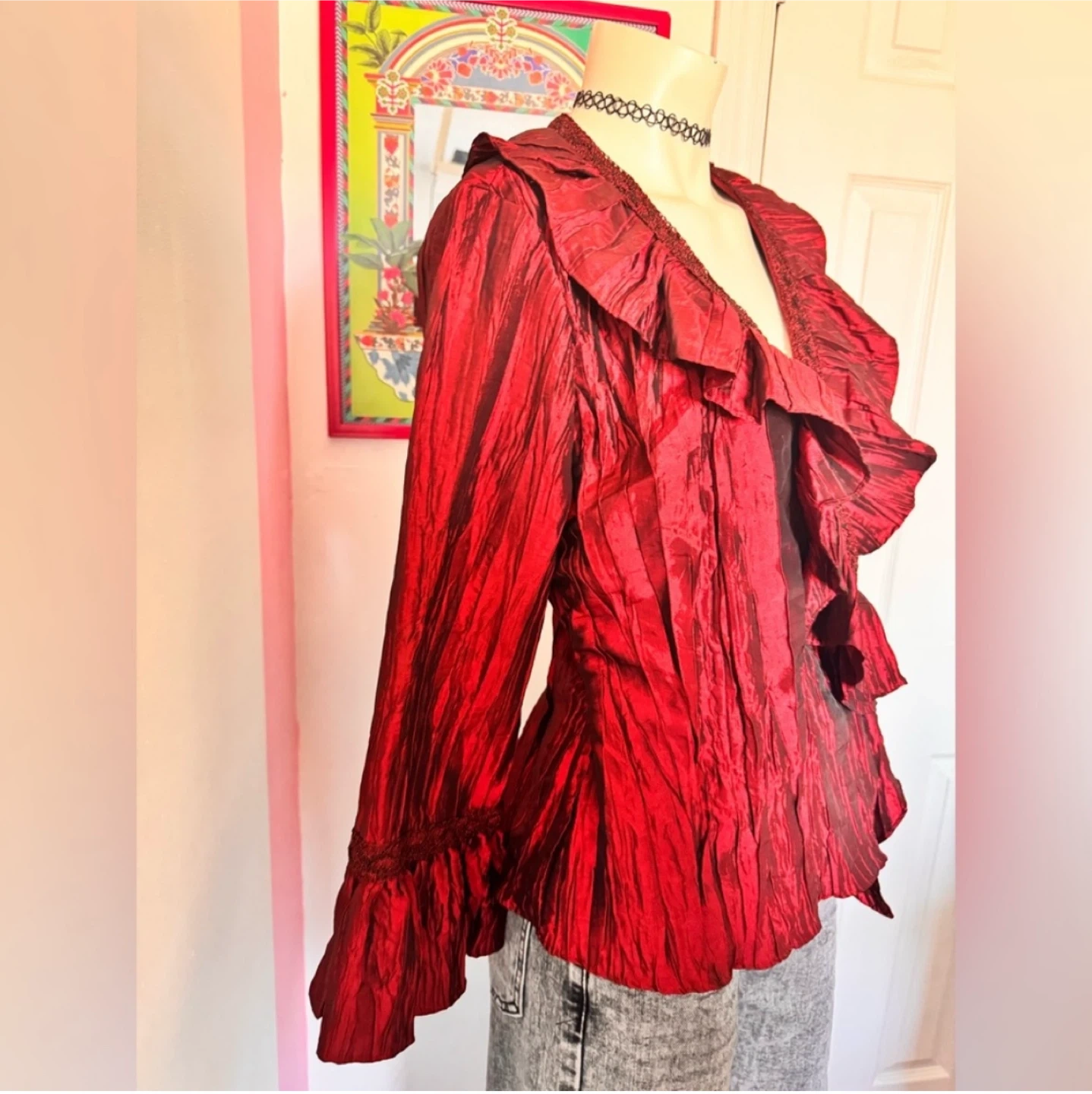 Brand: Jackie Jon Size: 8 Measurements: Length: 24” Pit-to-Pit: 20” Shoulder Width: 8” Sleeve Length: 21” Hem Length: 23” Sleeve Cuff Length: 9” Neckline Depth: 10” Flared Cuff Length: 4.5 Material: Nylon, Polyester Condition: EUC