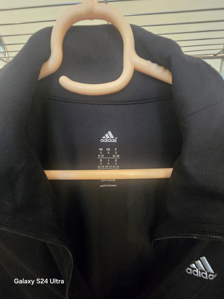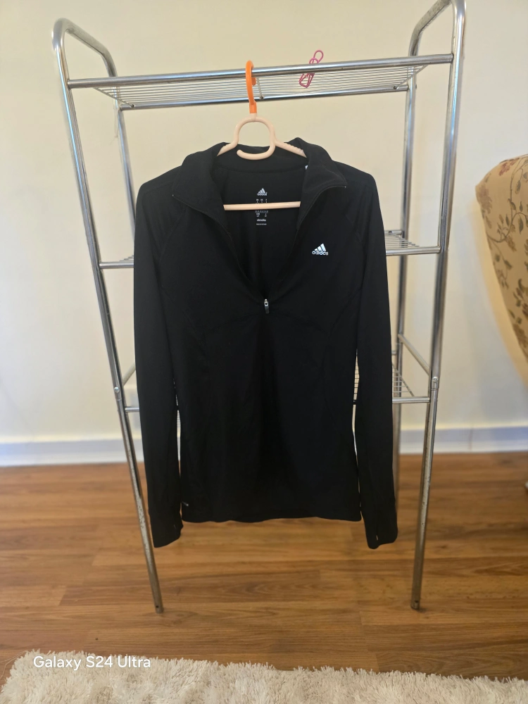 Selling an Adidas black half-zip pullover in size S. It's in great condition and perfect for workouts or casual wear! The material is comfortable and breathable, making it ideal for layering. The Adidas logo is on the chest.