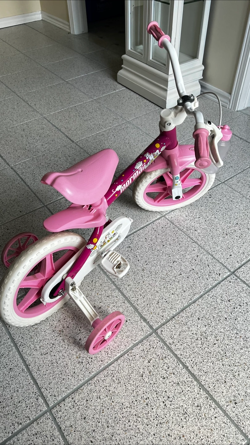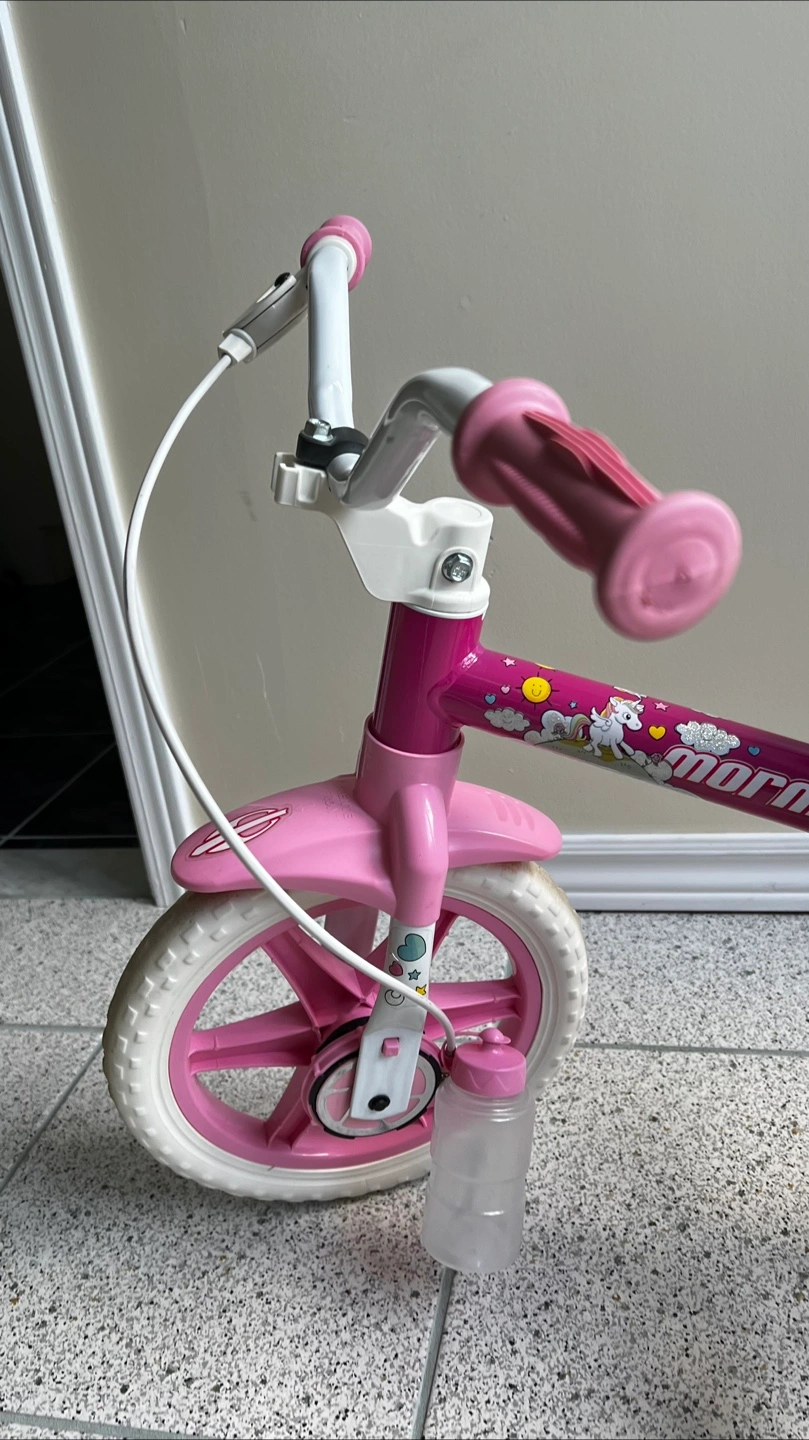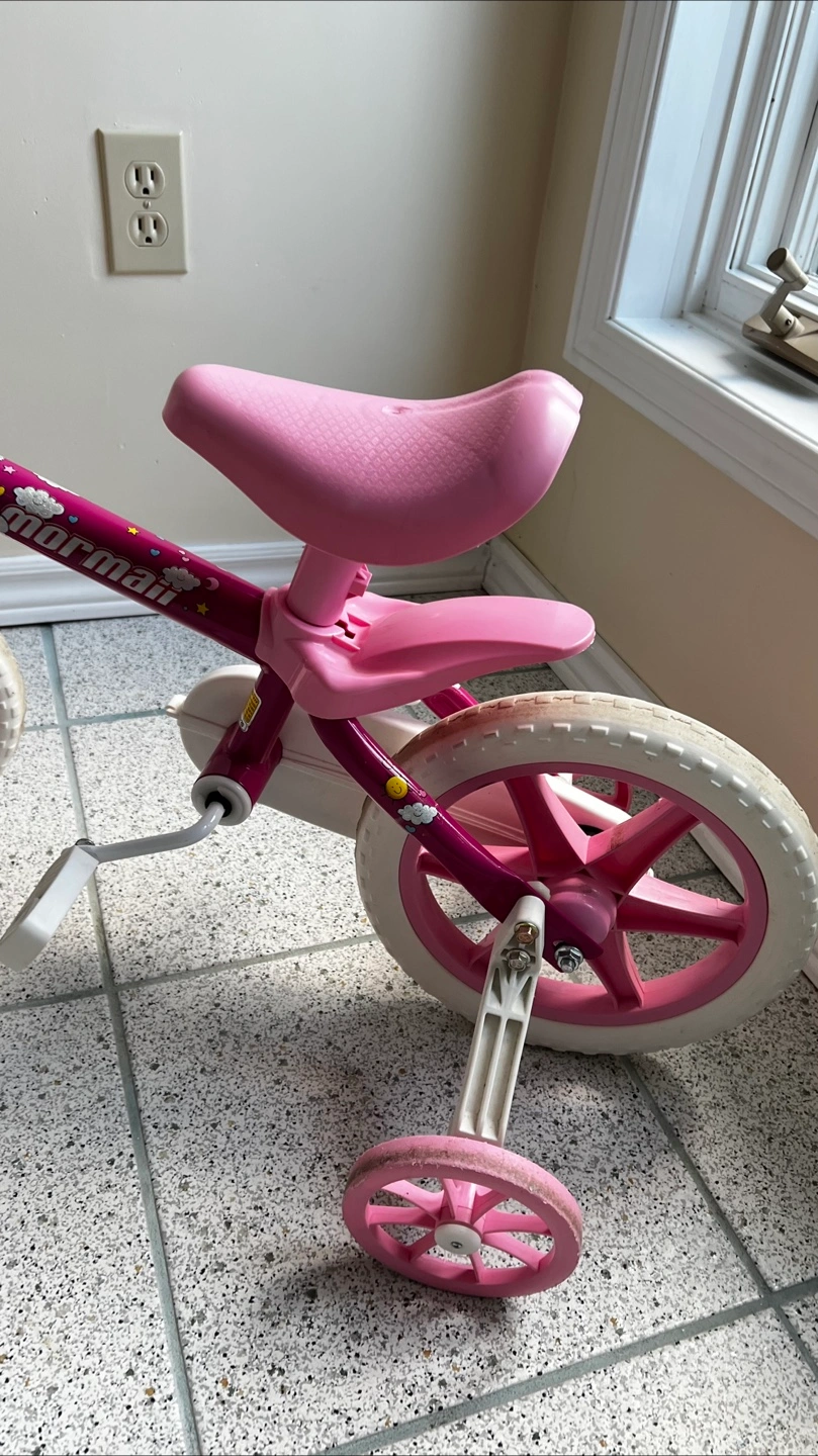 This is a cute pink bike from Mormaii, perfect for a little one learning to ride! It comes with training wheels to help them get started. It has a water bottle holder too!