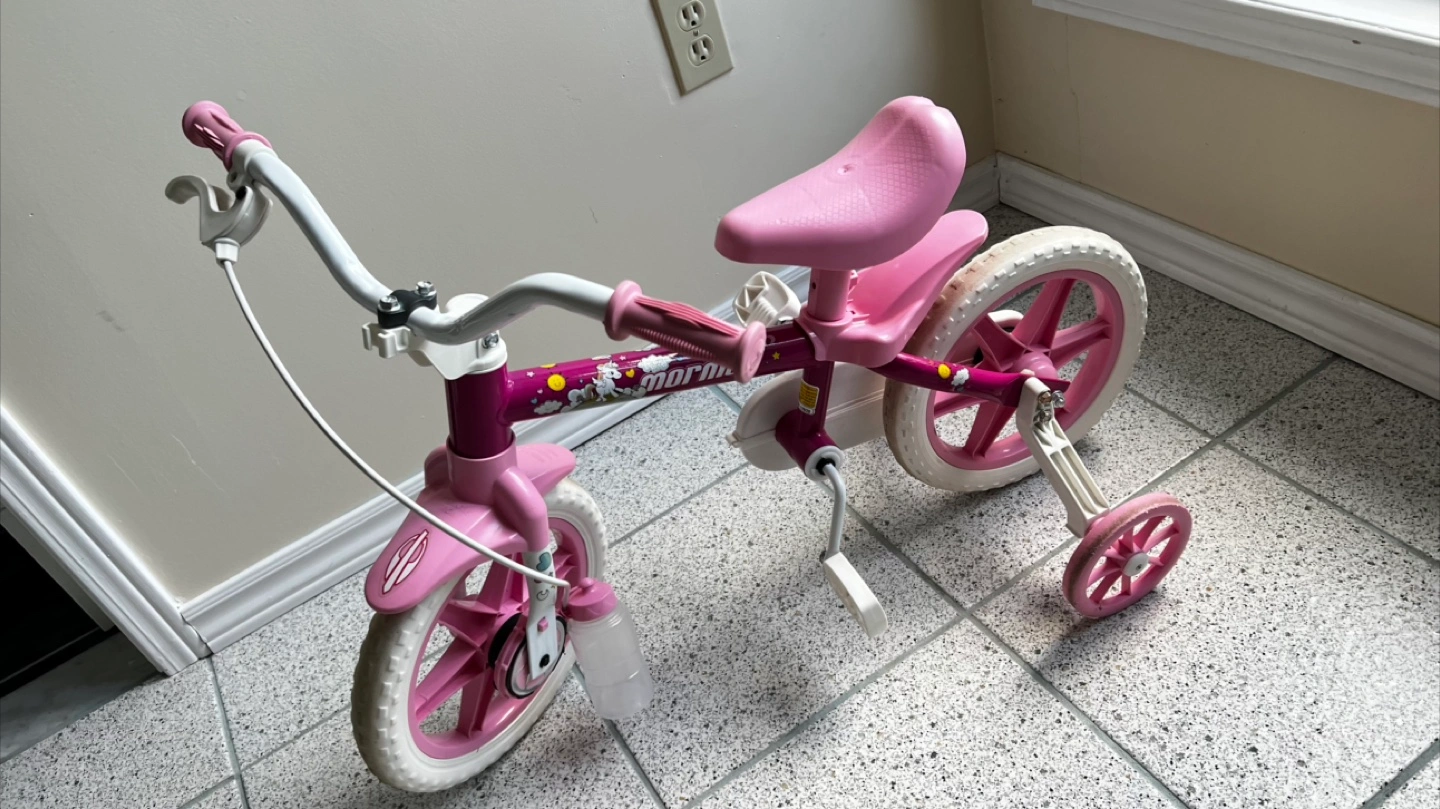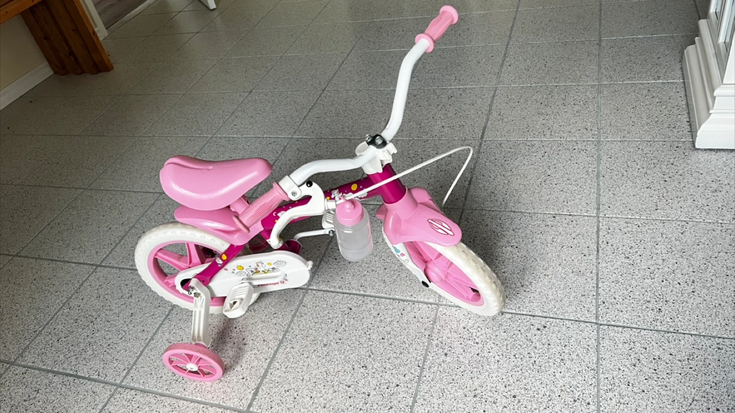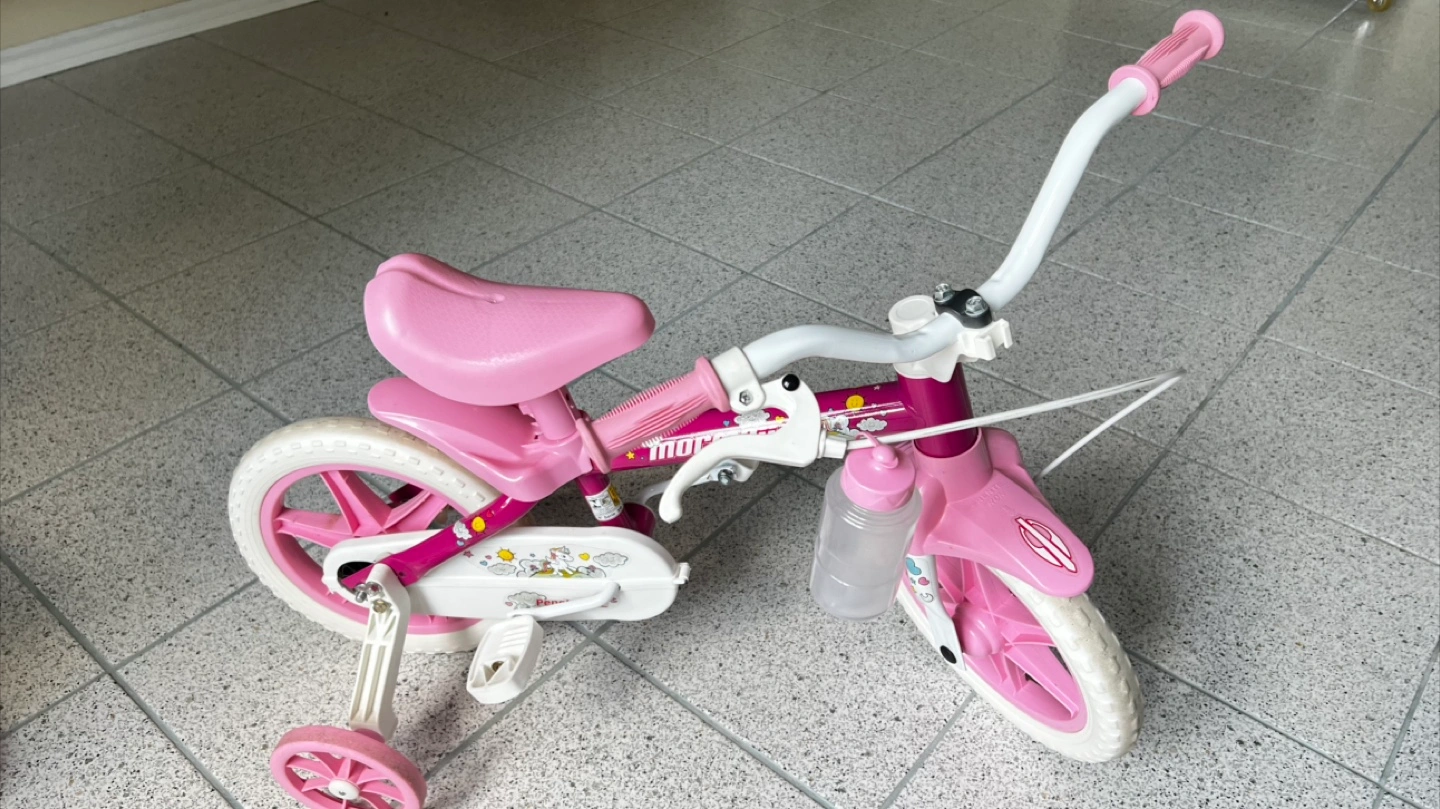 This is a cute pink bike from Mormaii, perfect for a little one learning to ride! It comes with training wheels to help them get started. It has a water bottle holder too!
