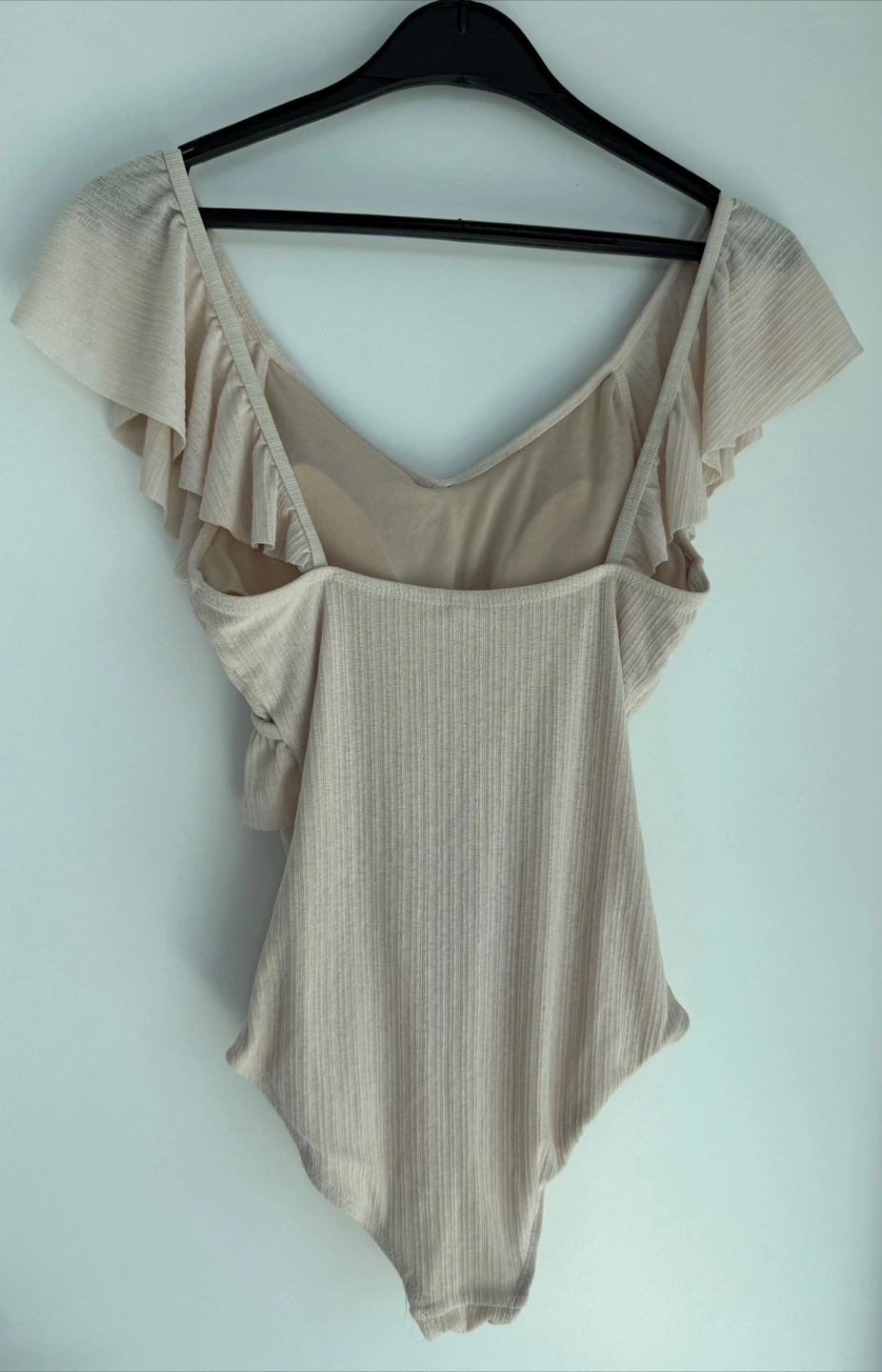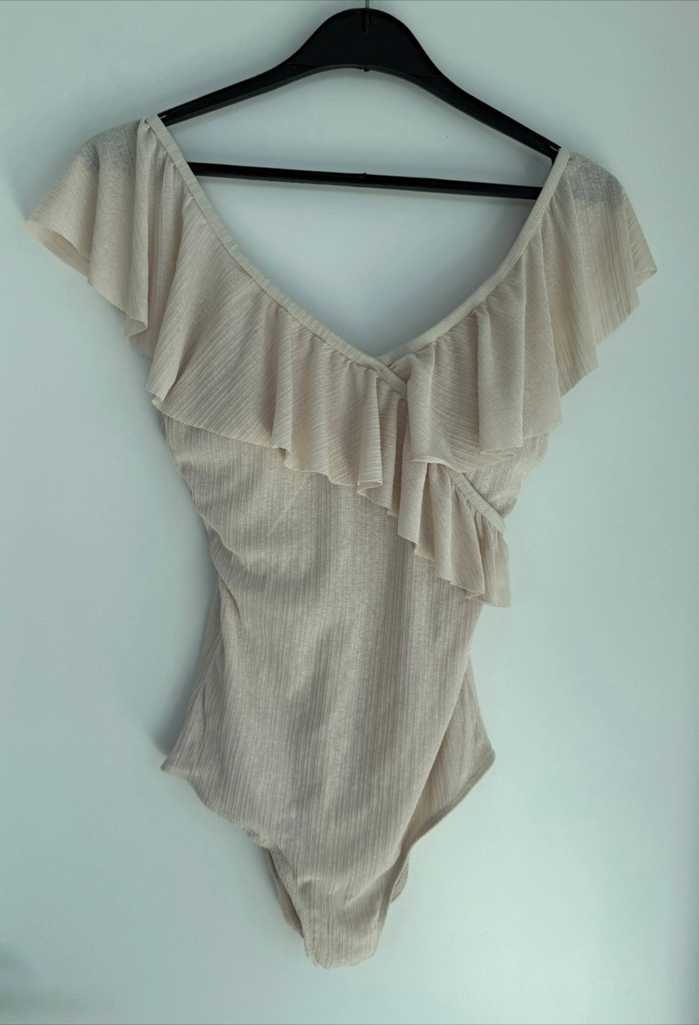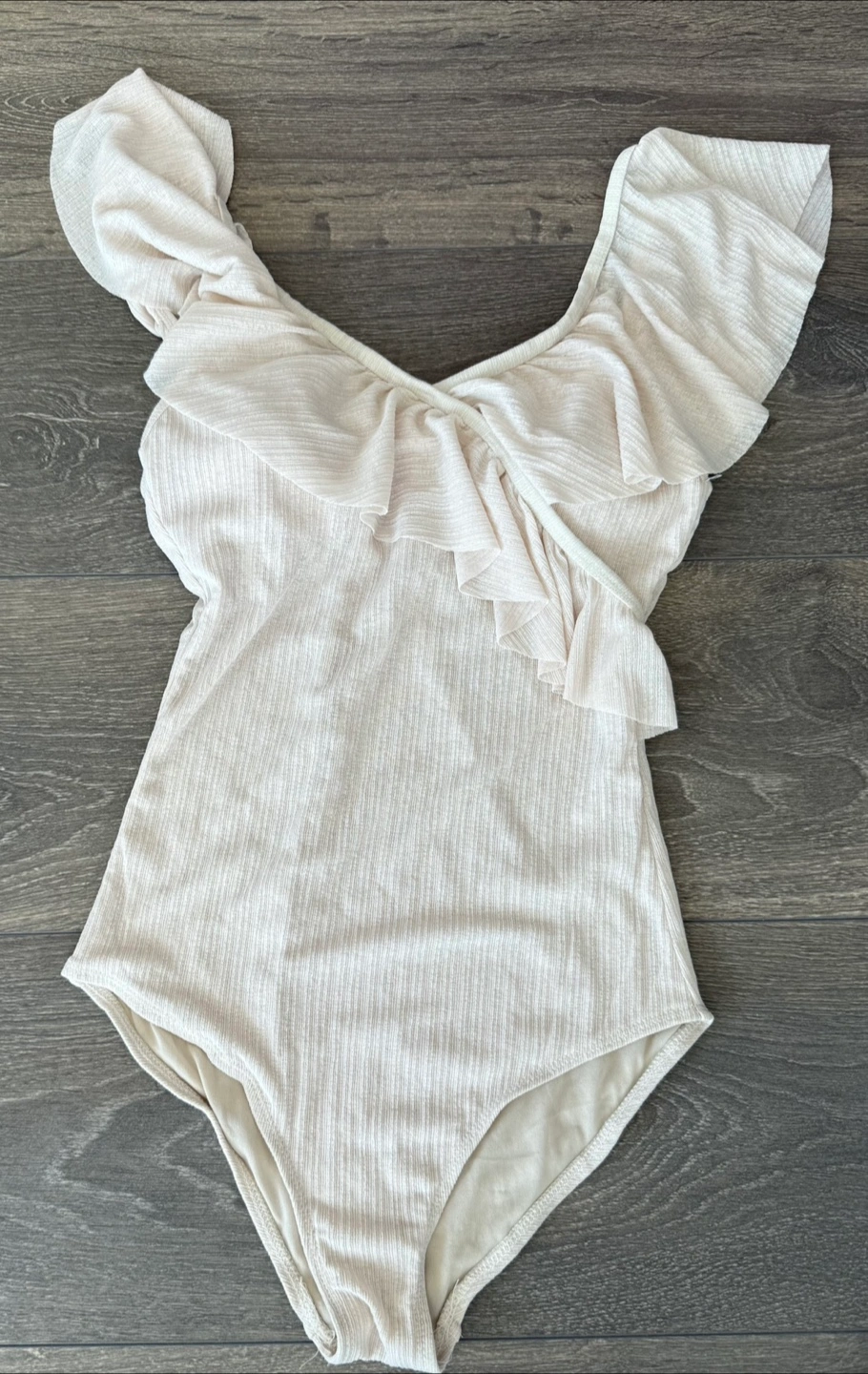 A cute beige swimsuit with a ruffle detail! It's in great condition and ready for a new home