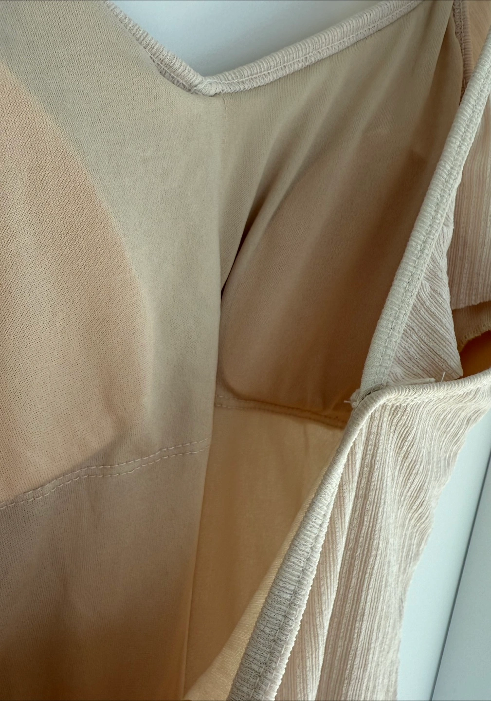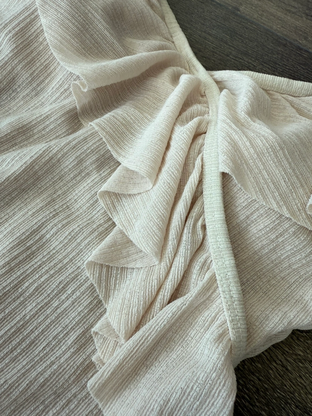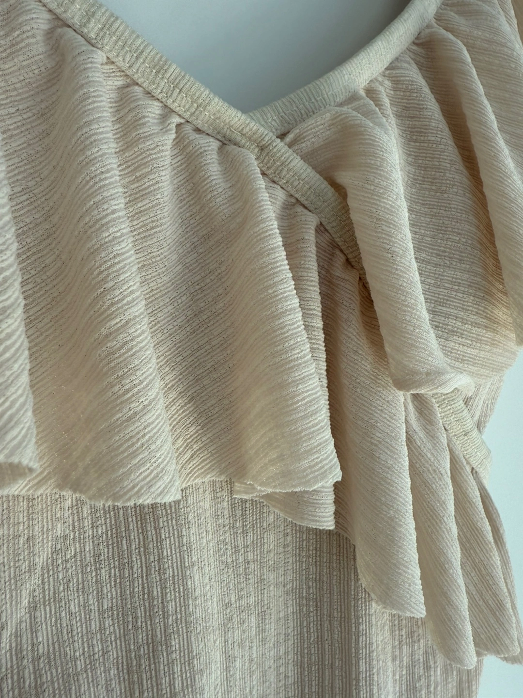 A cute beige swimsuit with a ruffle detail! It's in great condition and ready for a new home