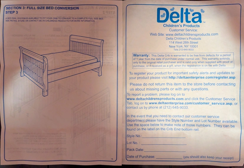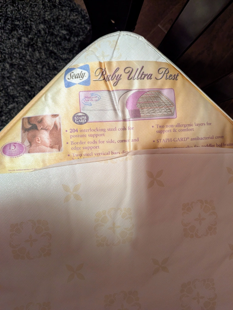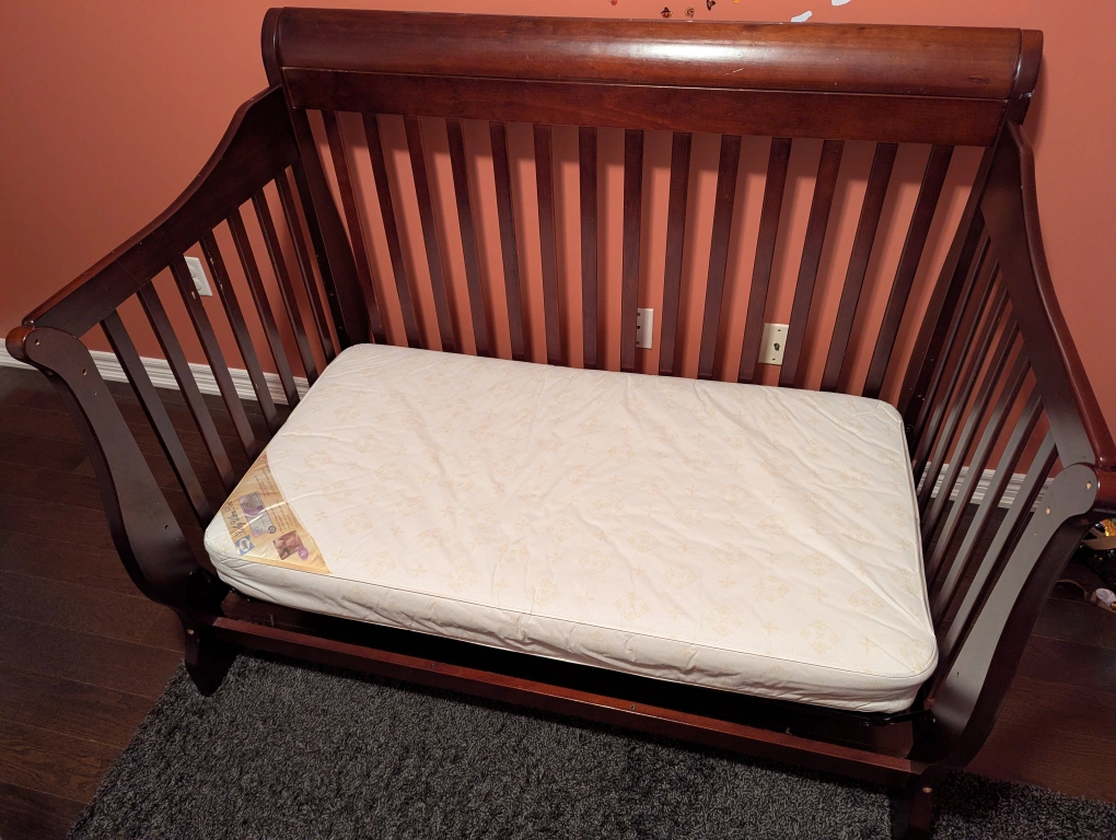 Wooden 4-in-1 Convertible Crib easily converts from crib to toddler bed, daybed and full-size bed. Comes with or without sealy crib mattress. Selling a Delta Children's Products crib that converts to a toddler bed! It comes with a Sealy Baby Ultra Rest mattress. Also included are the assembly instructions. The crib has a minimum dimension of 51 5/8 in (1310 mm) in length, 27 1/4 in (690 mm) in width and 4 in (100 mm) in thickness. Amazon has the exact same crib priced at $526.76. link: https://a.co/d/0oyAaaj
