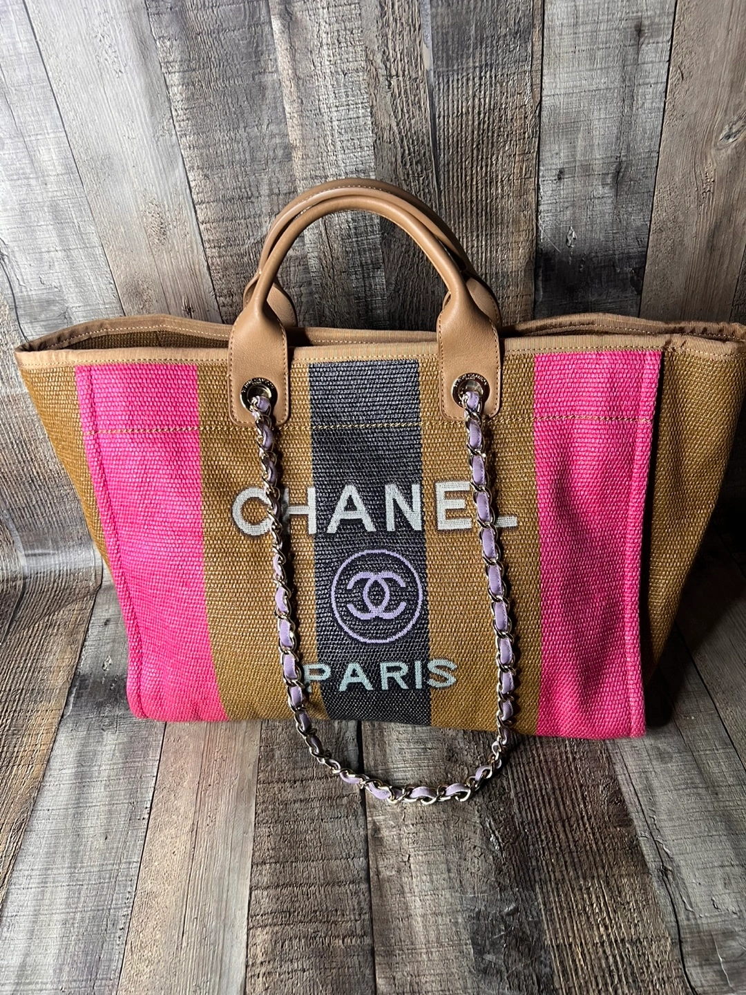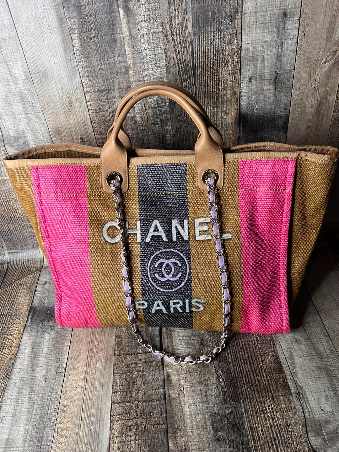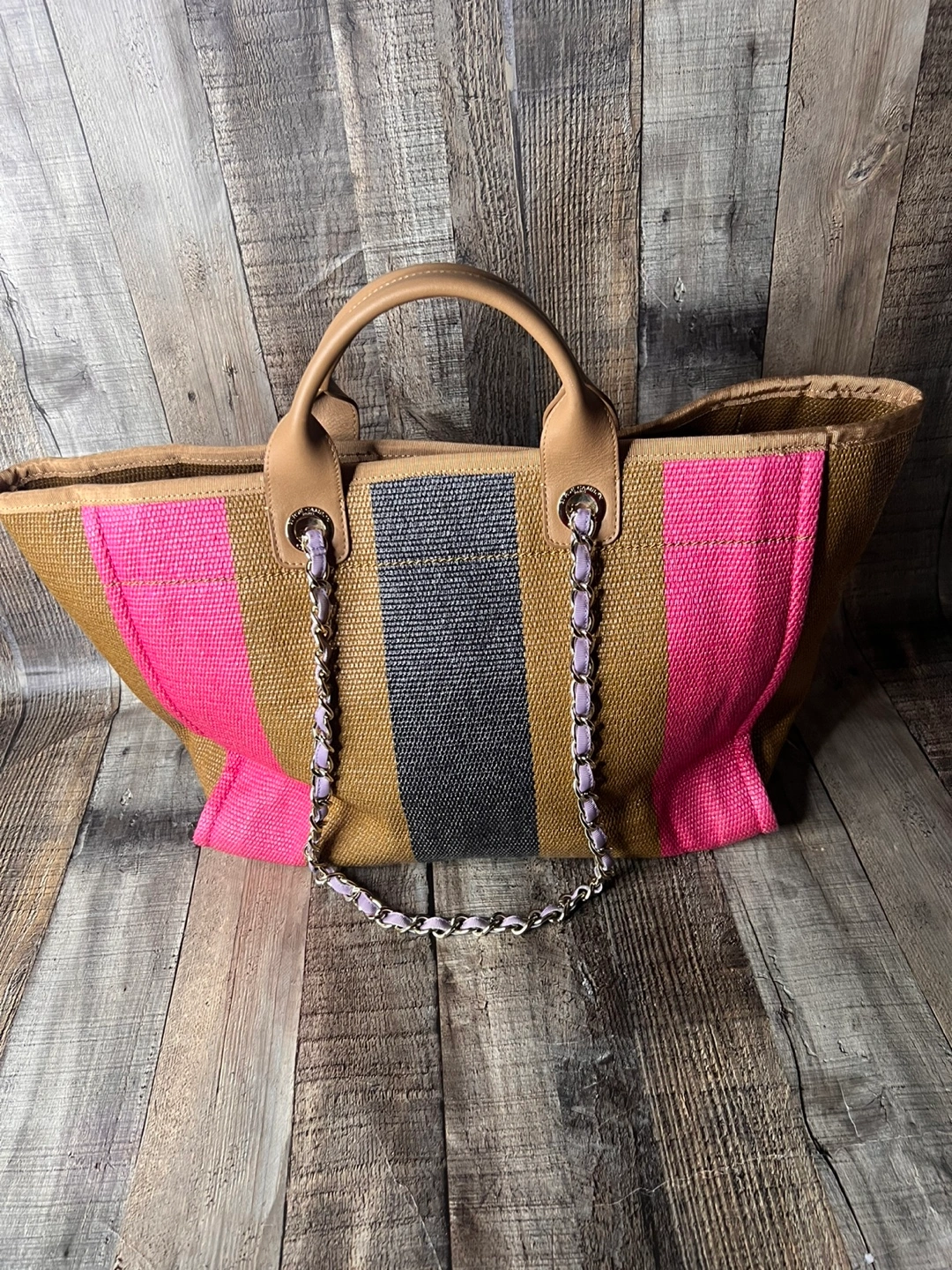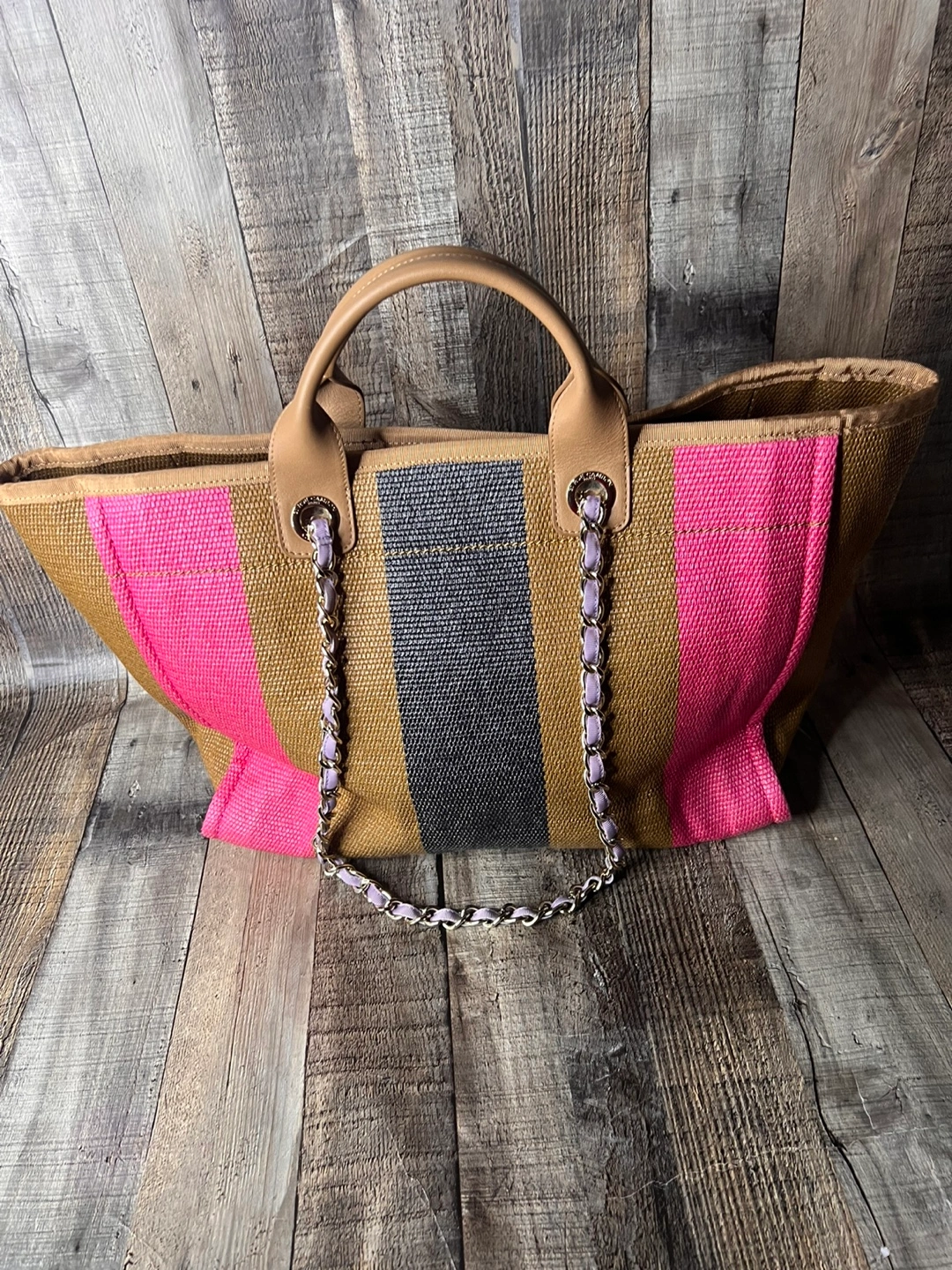 This is a stylish Chanel Paris tote bag! It features a unique design with pink, brown, and black stripes. The bag has leather handles and a chain detail, making it both fashionable and functional. Price reflects authenticity.