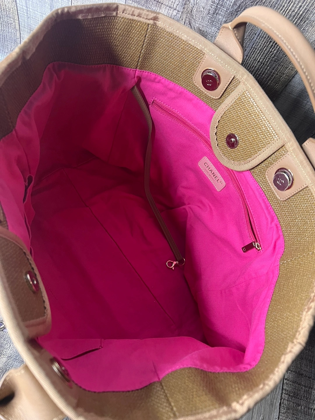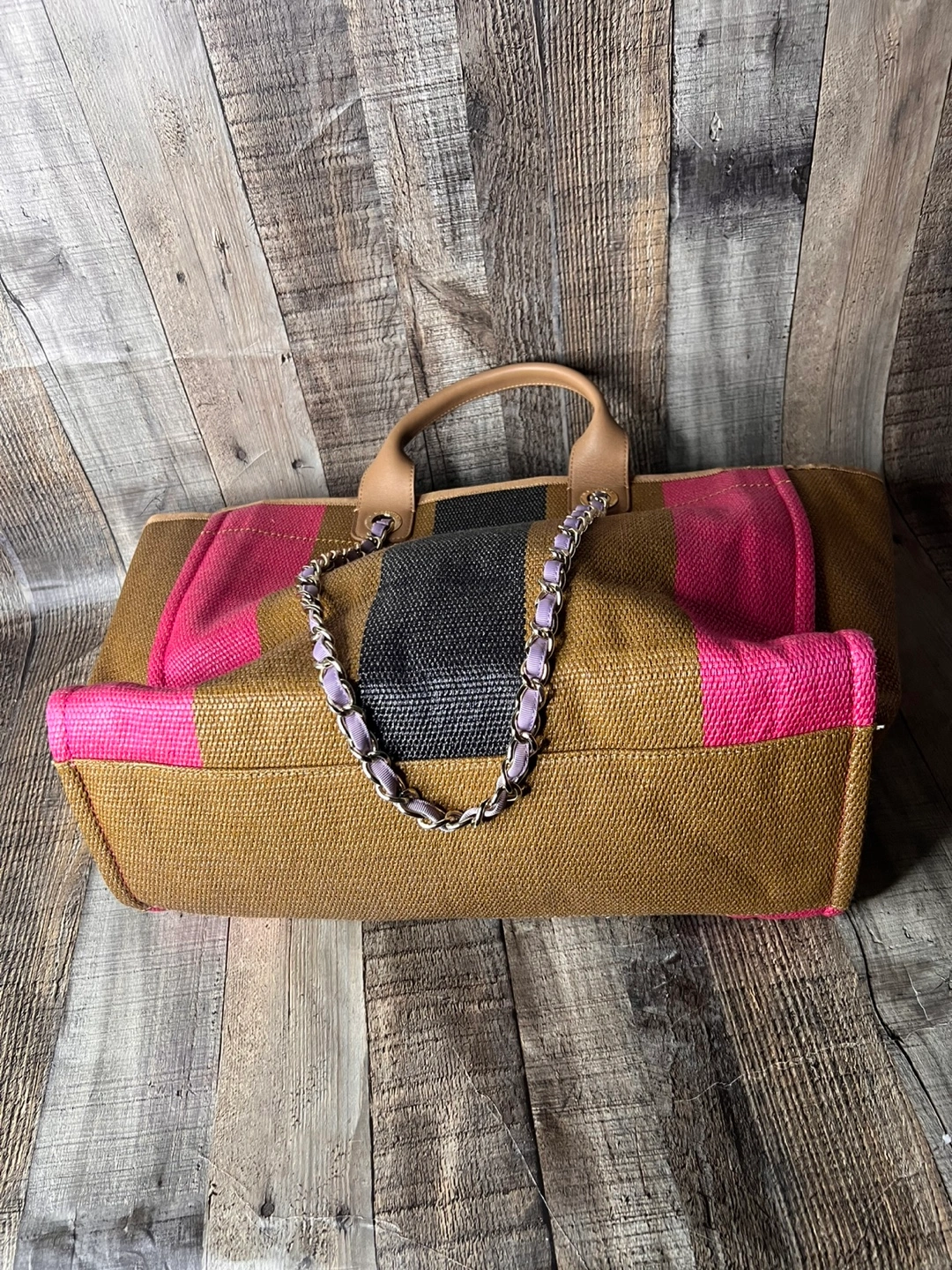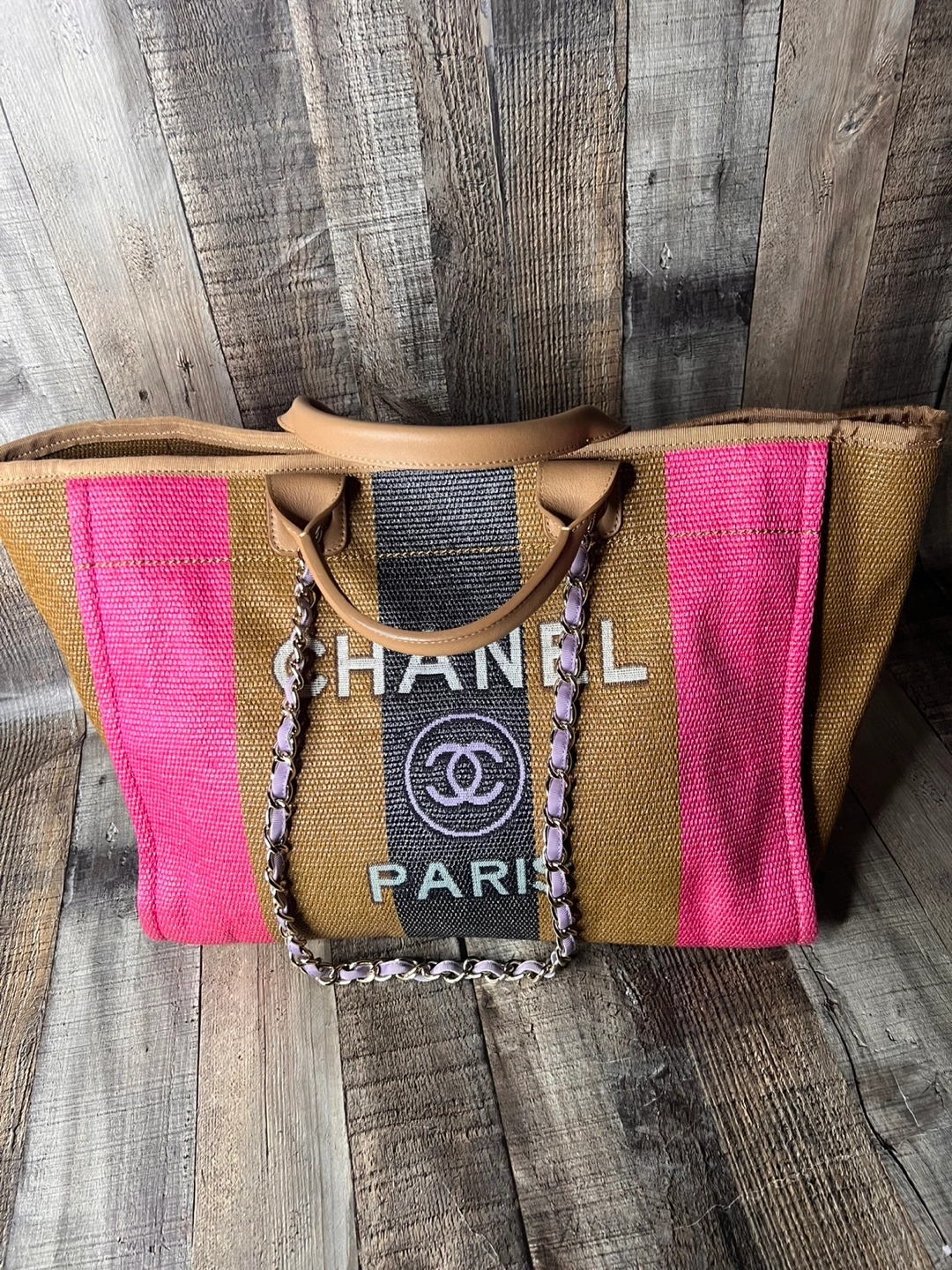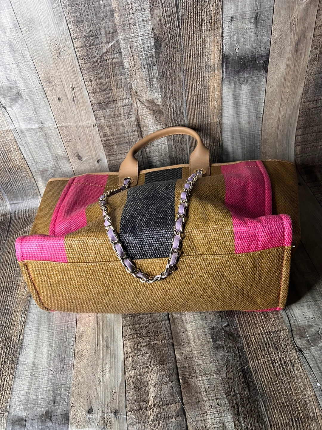 This is a stylish Chanel Paris tote bag! It features a unique design with pink, brown, and black stripes. The bag has leather handles and a chain detail, making it both fashionable and functional. Price reflects authenticity.