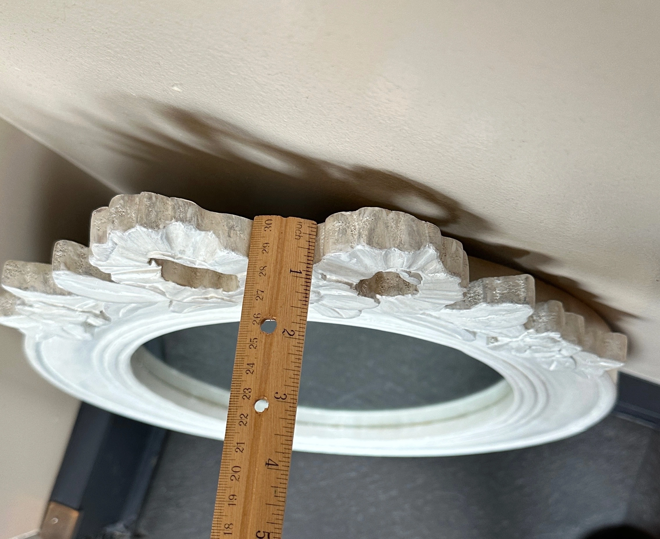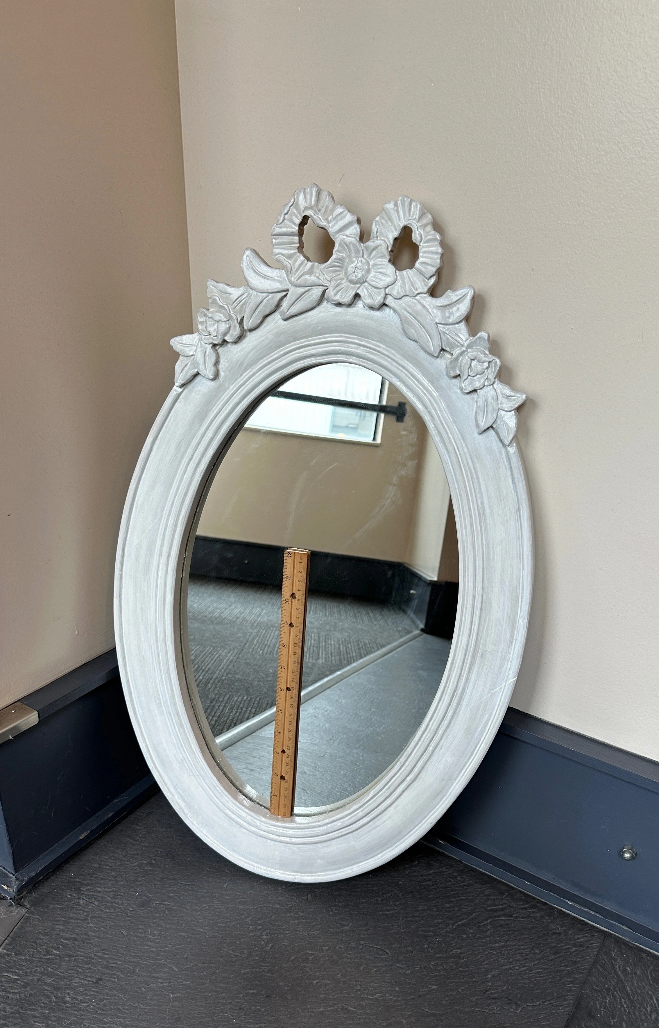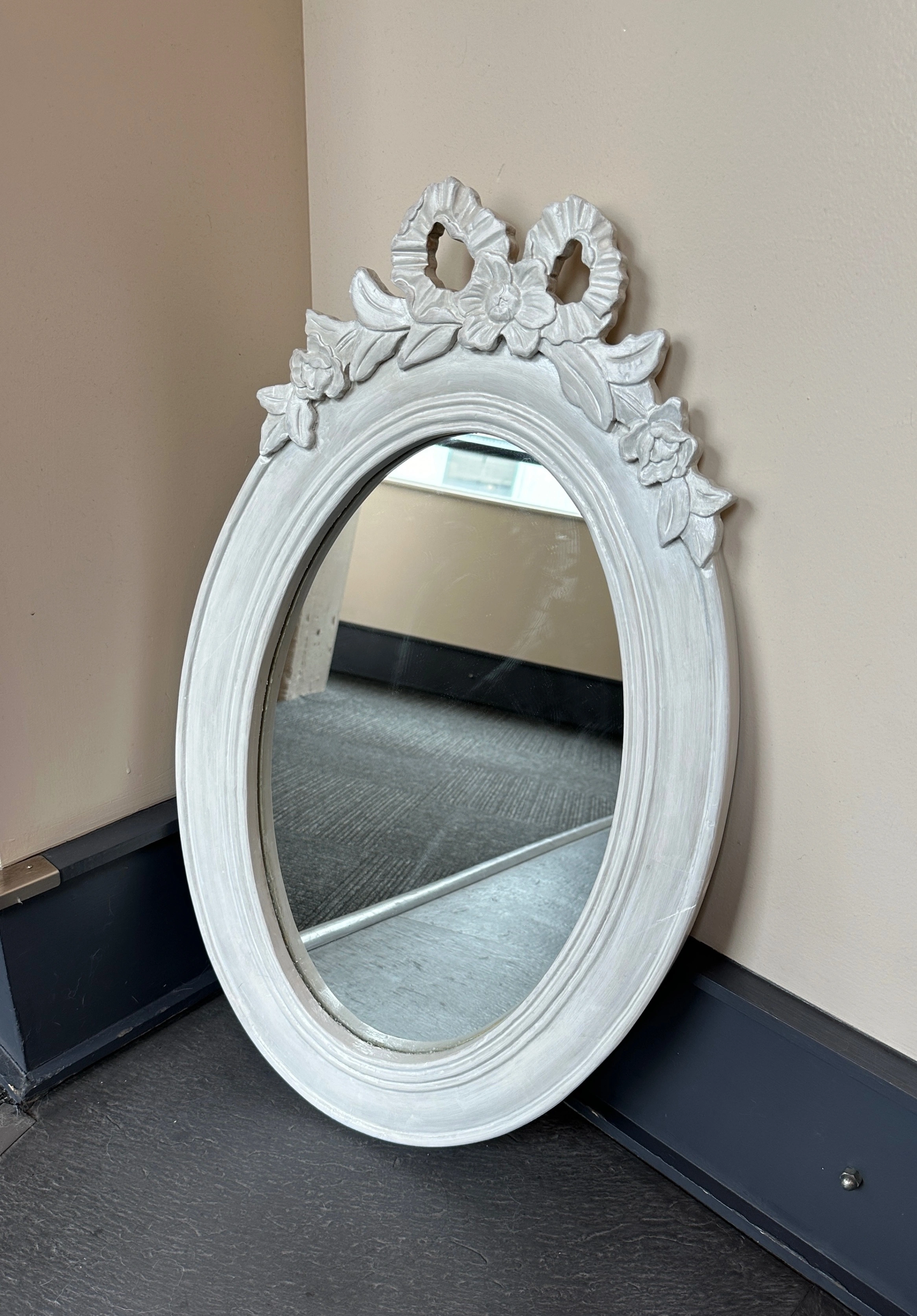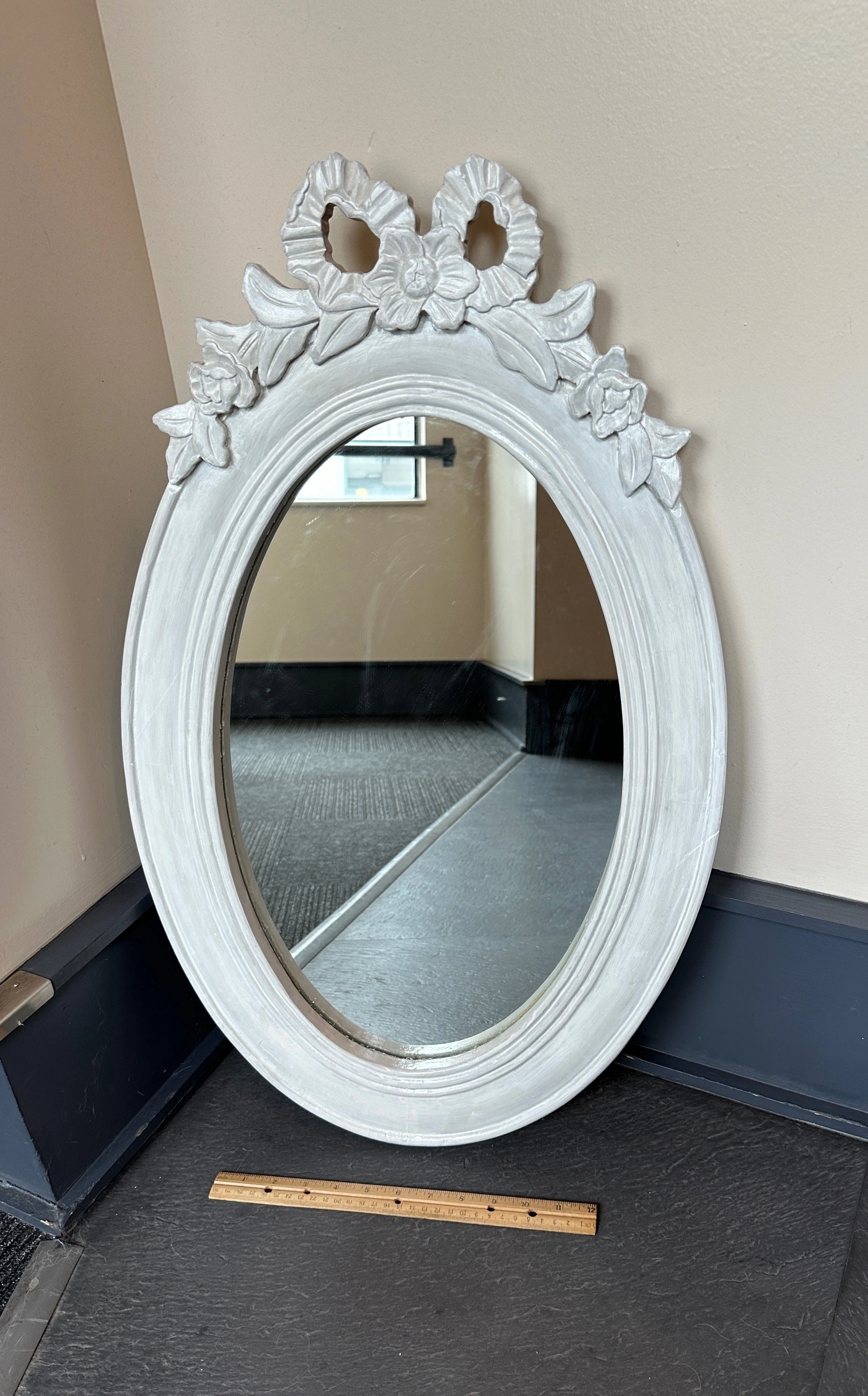 Vintage plywood oval mirror w/ girly carved details, fresh coat of white paint, shabby Parisian chic! - some faint scuffs/indents 28 ¼" x 17 ¼" overall 19 ½" x 12" mirror 12" ruler in the photos for scale CASH ONLY PICK UP @ 108 mutual st (Page One Cafe) a block from Eaton Centre/Dundas Stn
