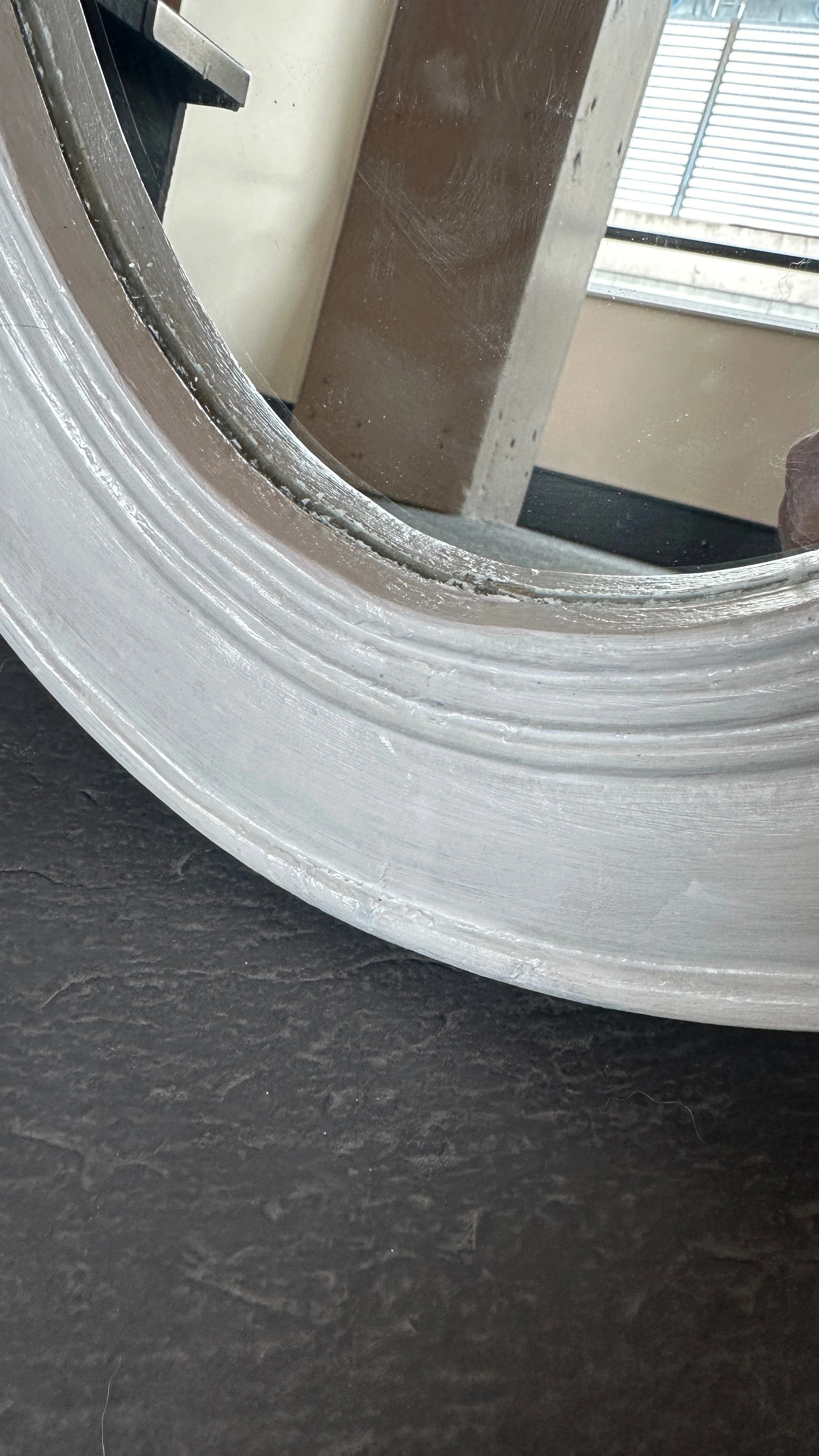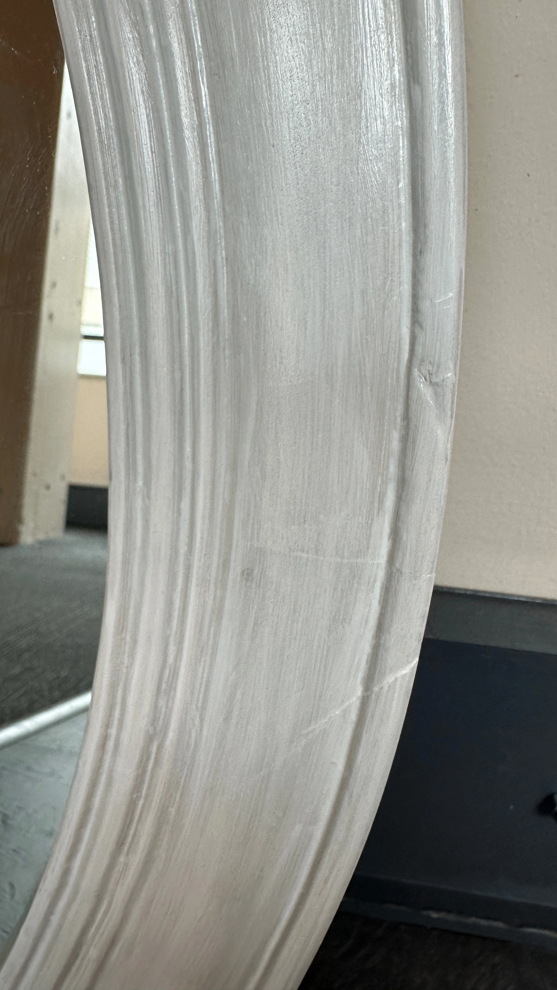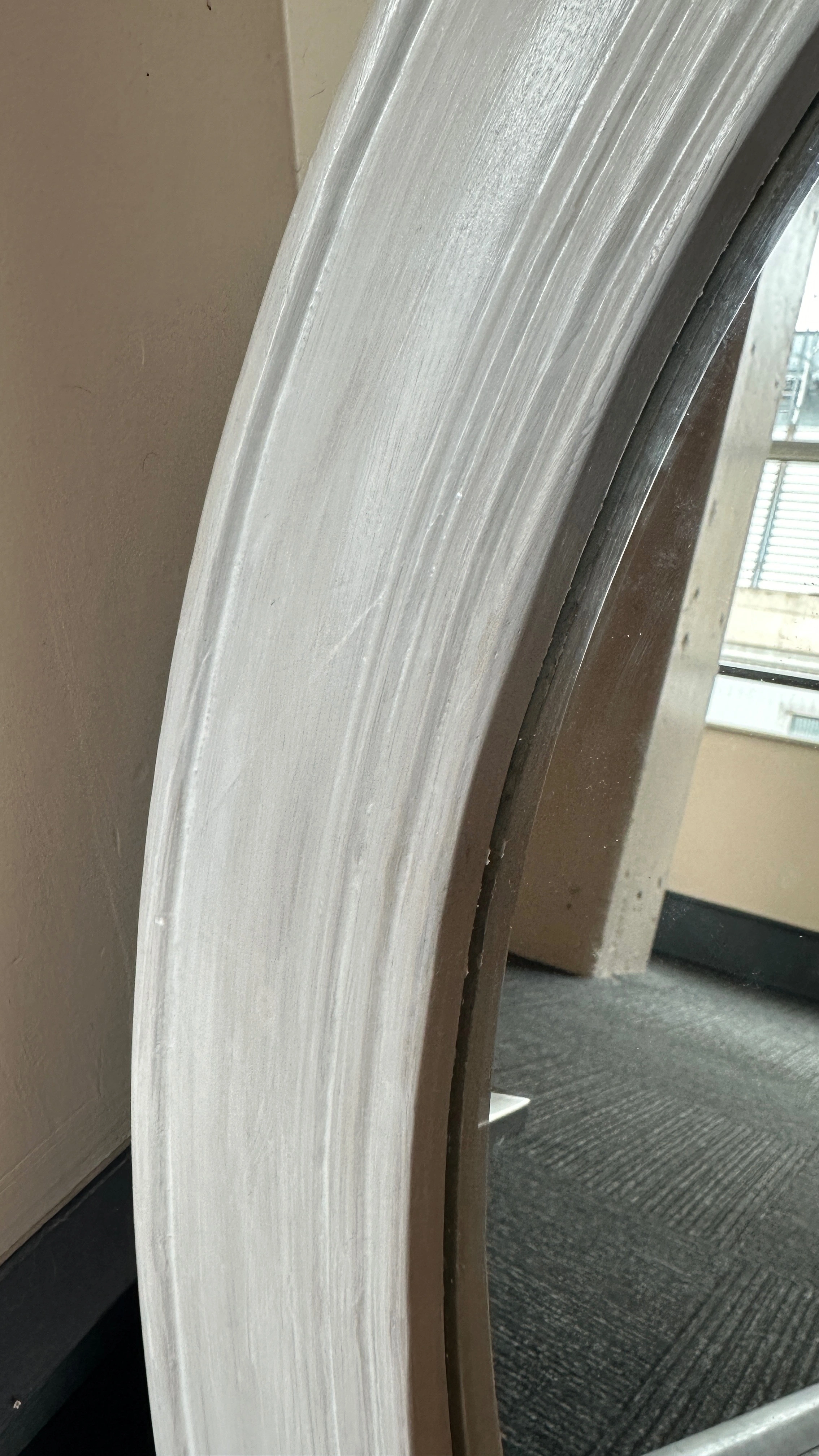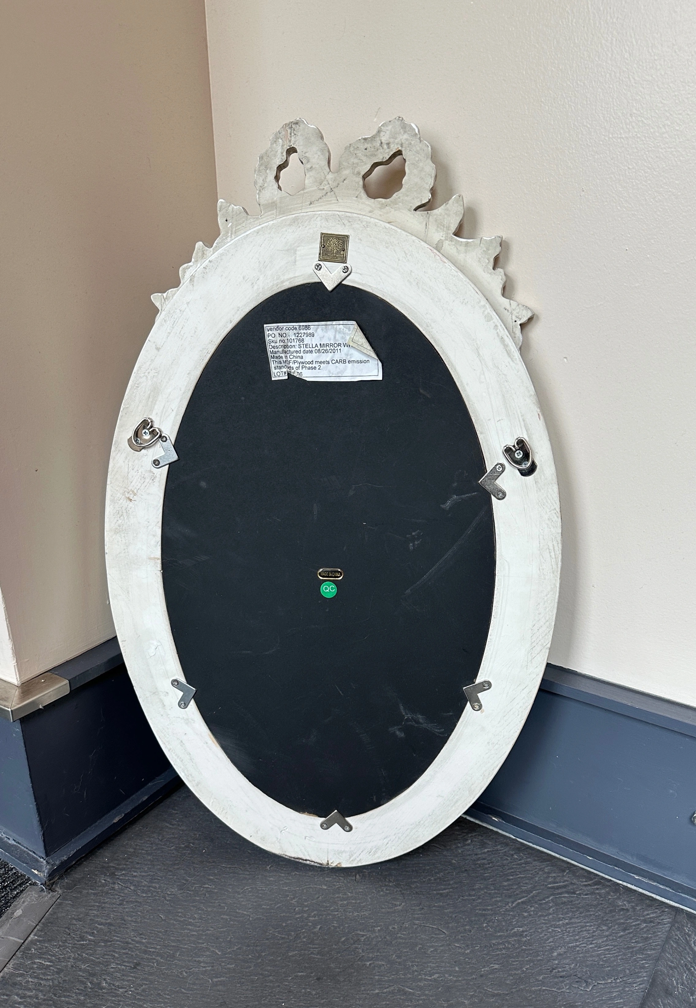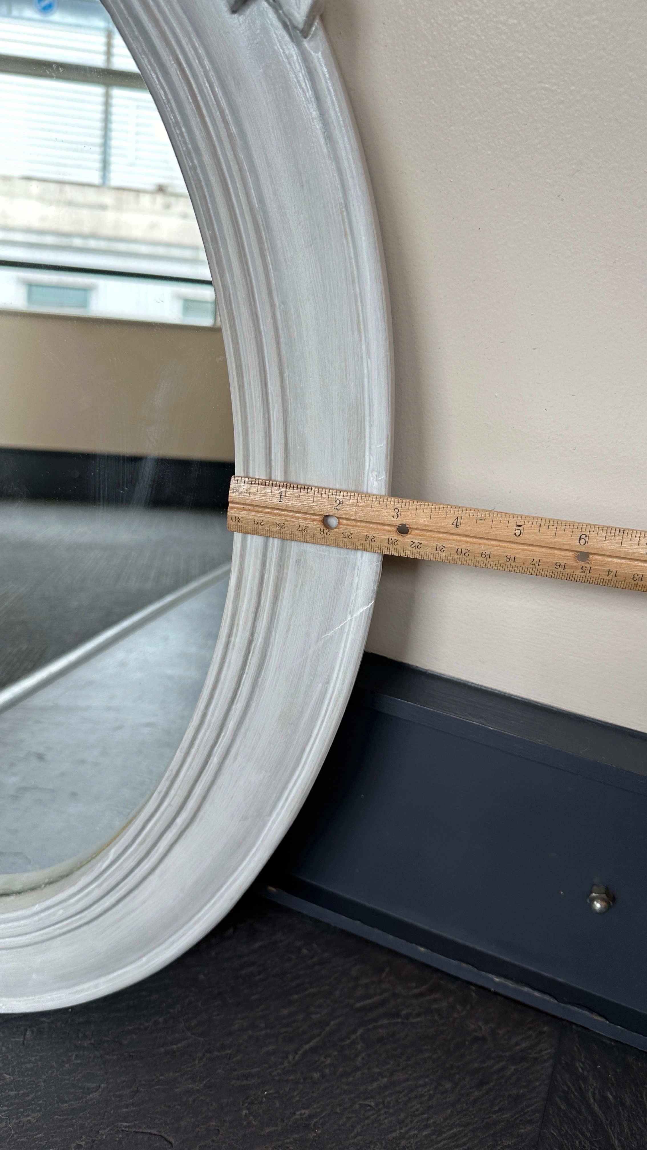 Vintage plywood oval mirror w/ girly carved details, fresh coat of white paint, shabby Parisian chic! - some faint scuffs/indents 28 ¼" x 17 ¼" overall 19 ½" x 12" mirror 12" ruler in the photos for scale CASH ONLY PICK UP @ 108 mutual st (Page One Cafe) a block from Eaton Centre/Dundas Stn