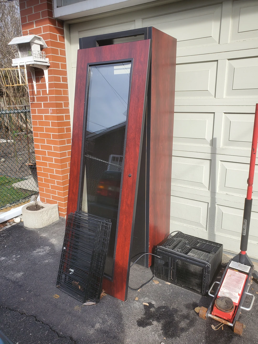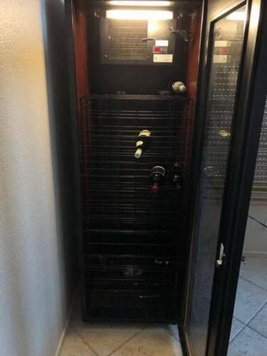 I believe it holds up to 110 bottles. Still works but stopped blowing cold air . Has been taken apart and placed outside in a covered area for easy pick up. All racks and hardware screws are present. Has not been inspected so I dont know what the issue is. We bought a new one already. Pick up location Dufferin & Eglinton area Bansley ave.