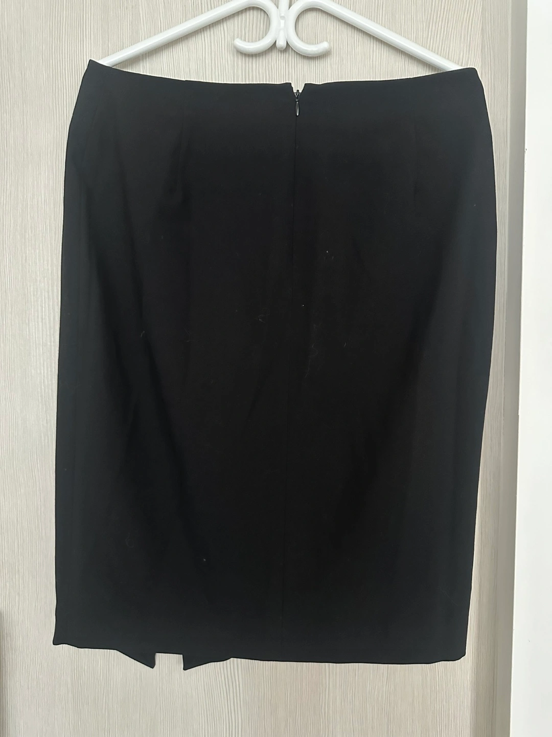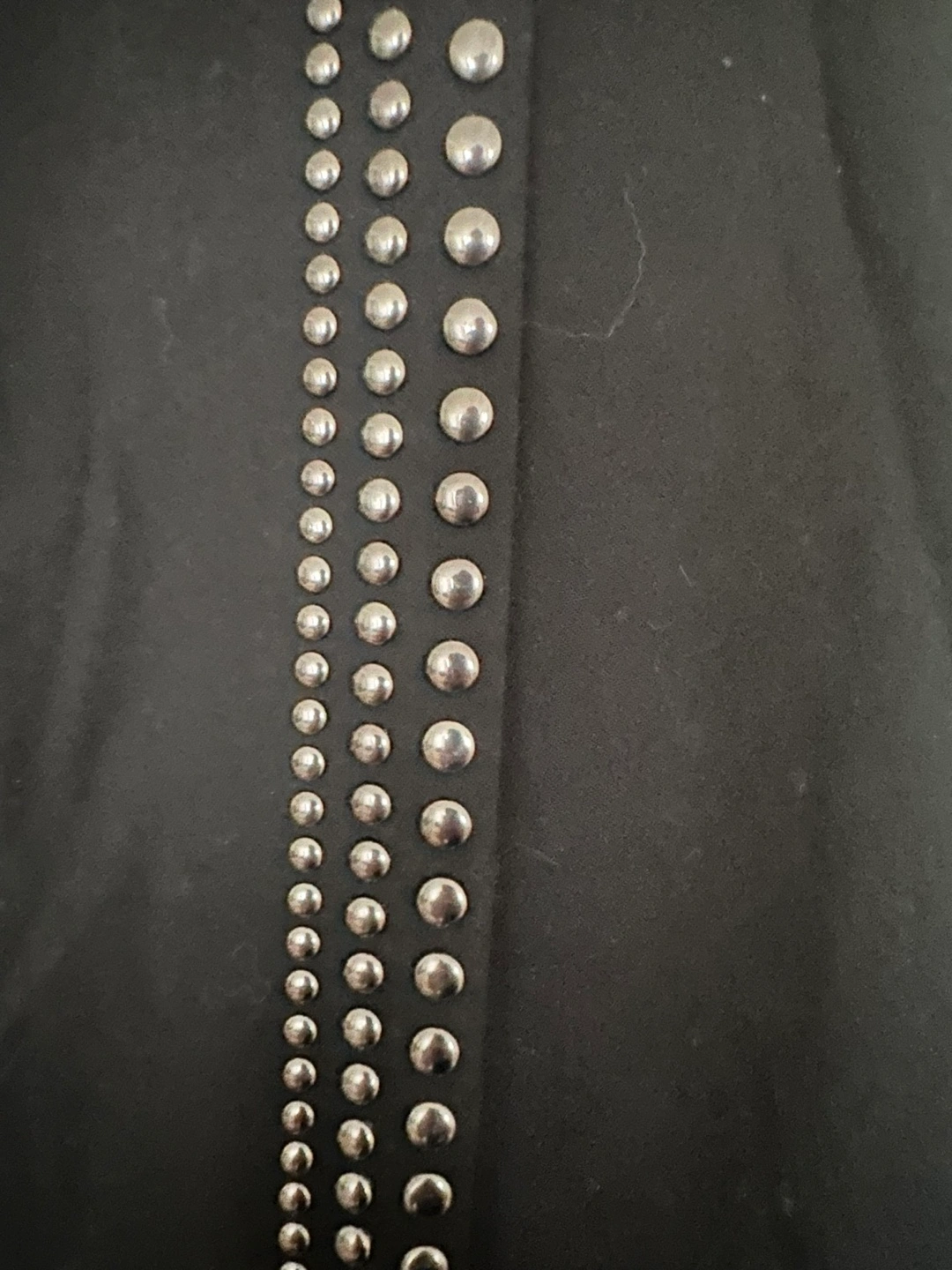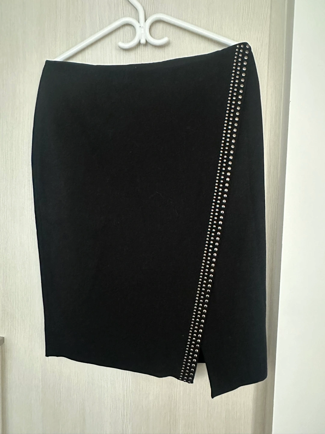 Selling a Calvin Klein black skirt in size 10. It has a stylish design with silver stud detailing along the side. Perfect for dressing up or down!