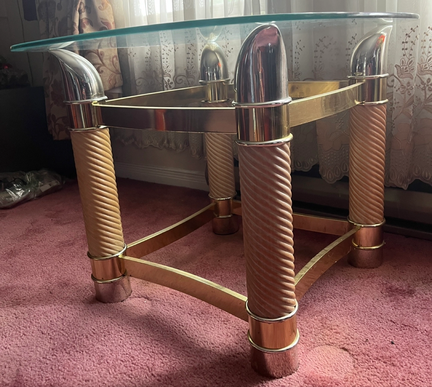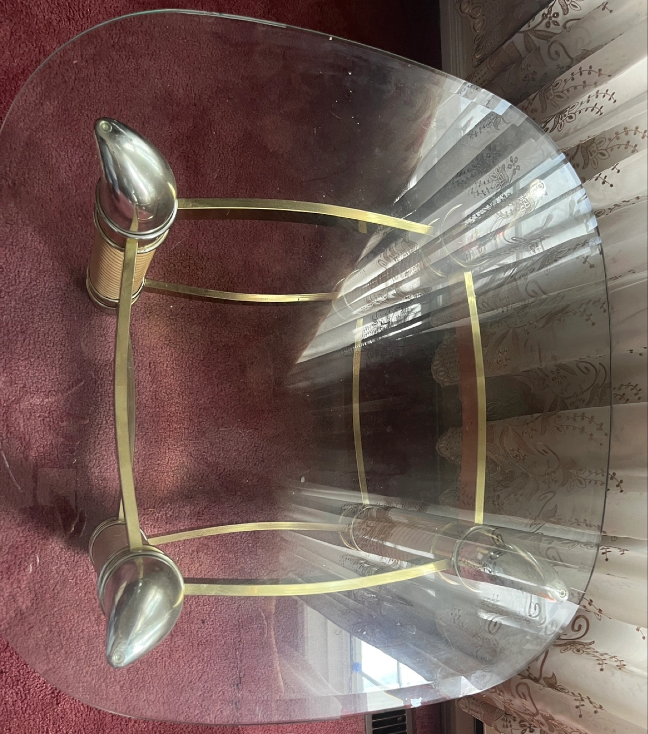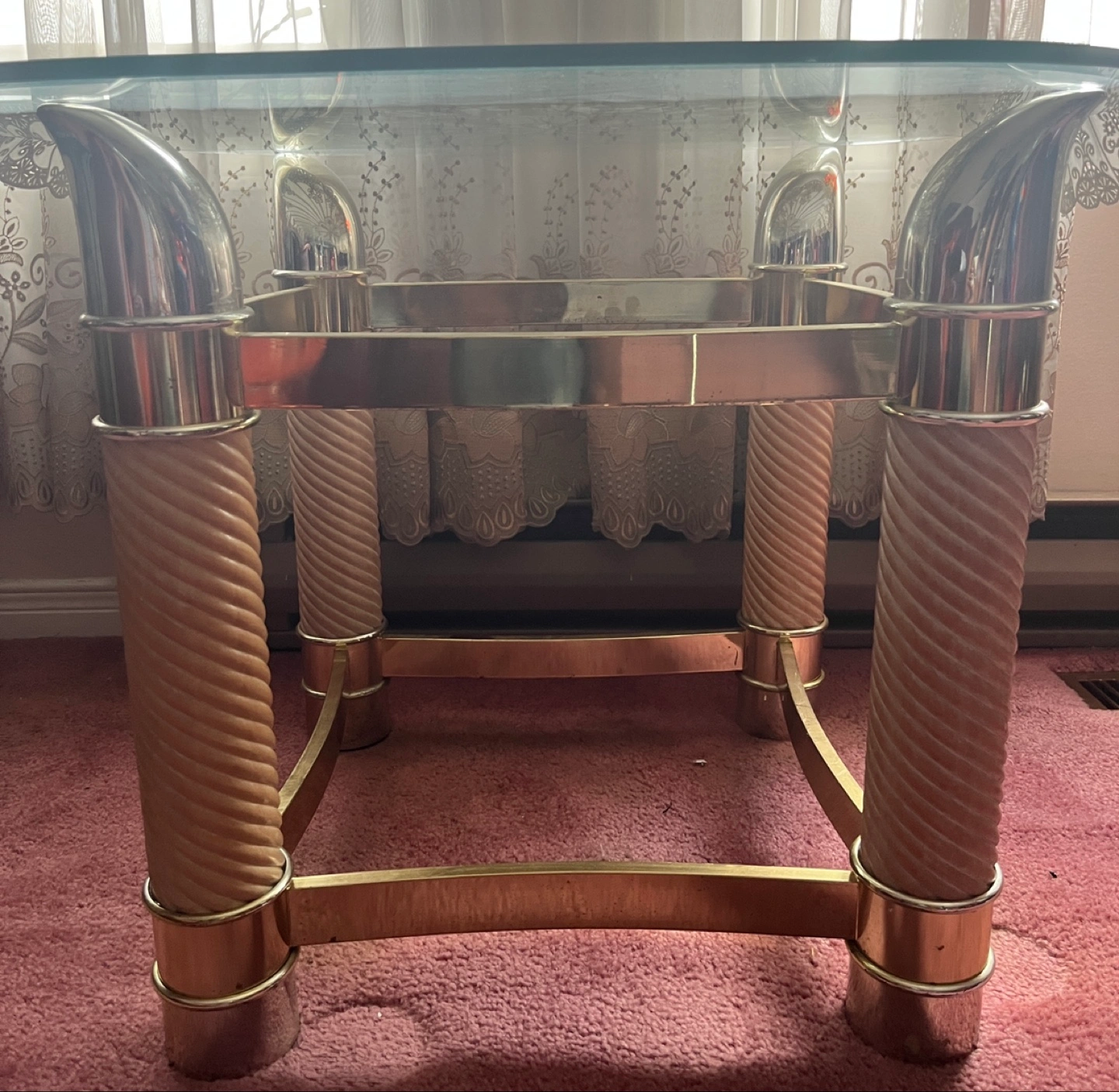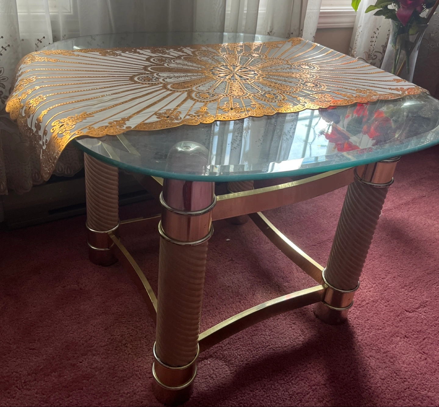 SET OF 2!!! Selling a unique glass top coffee table with a gold-tone metal frame and decorative legs. It's a sturdy and stylish piece that would look great in any living room! 25$ for one 40$ for two price negotiationable originally 100 each