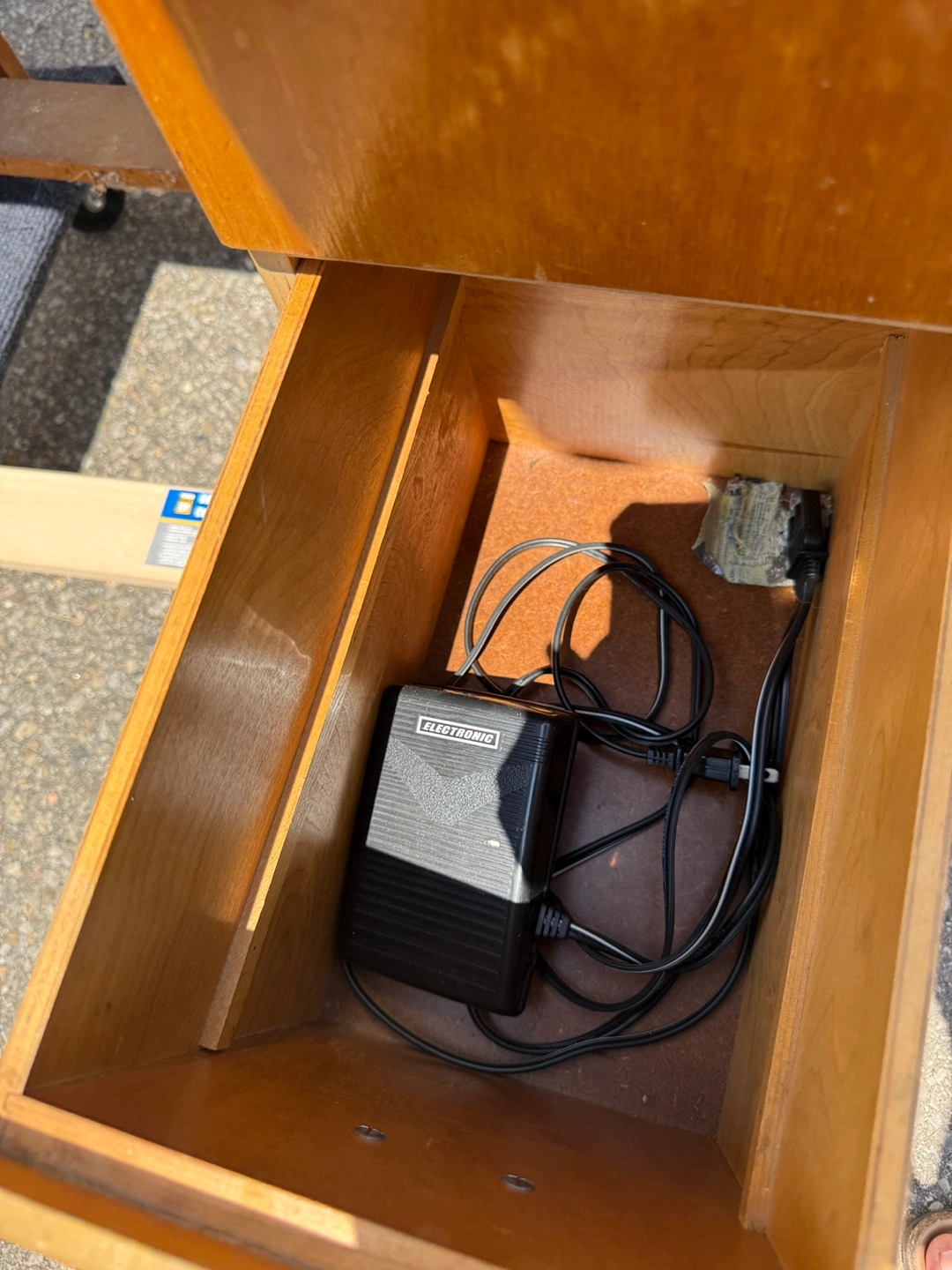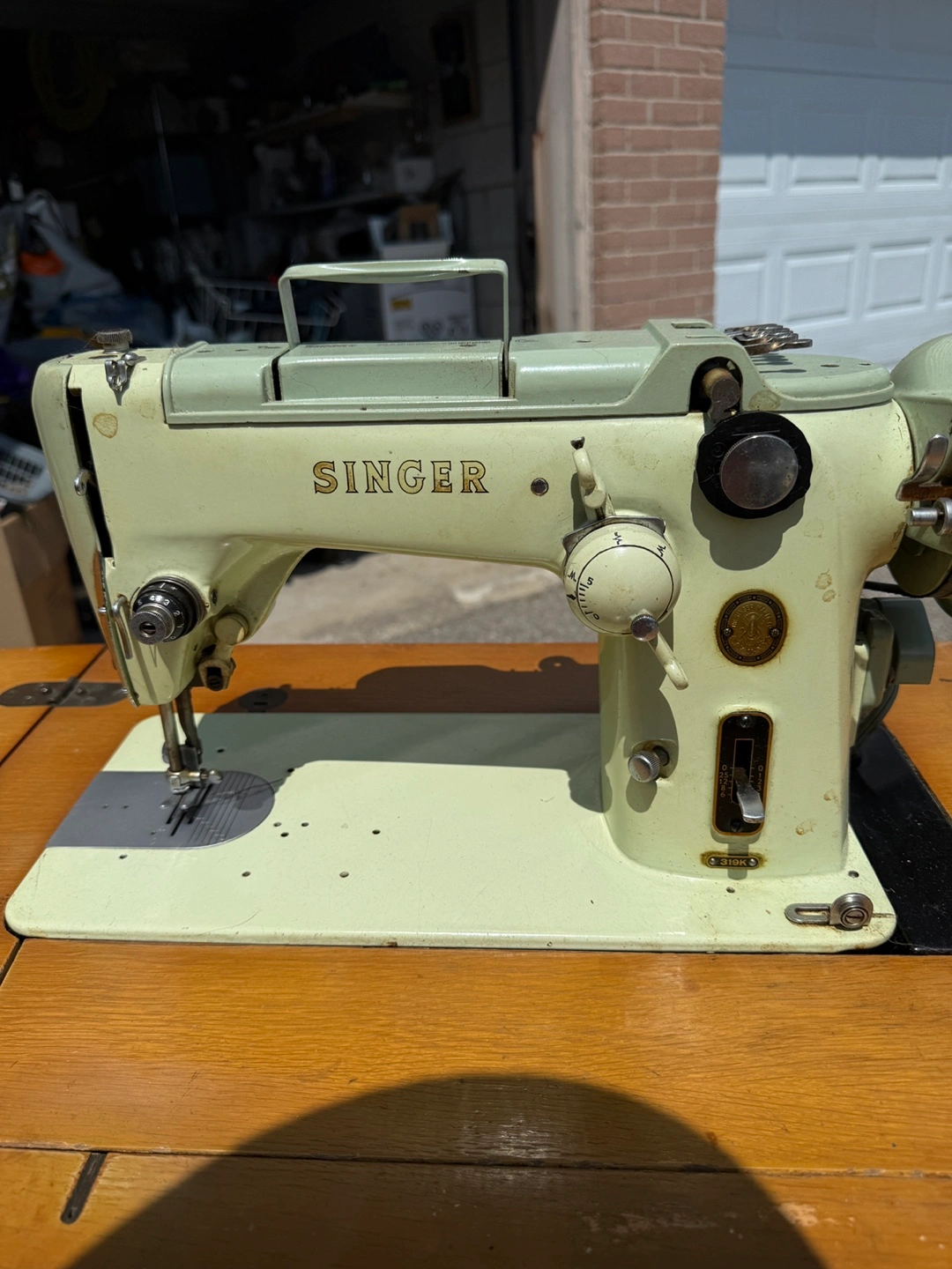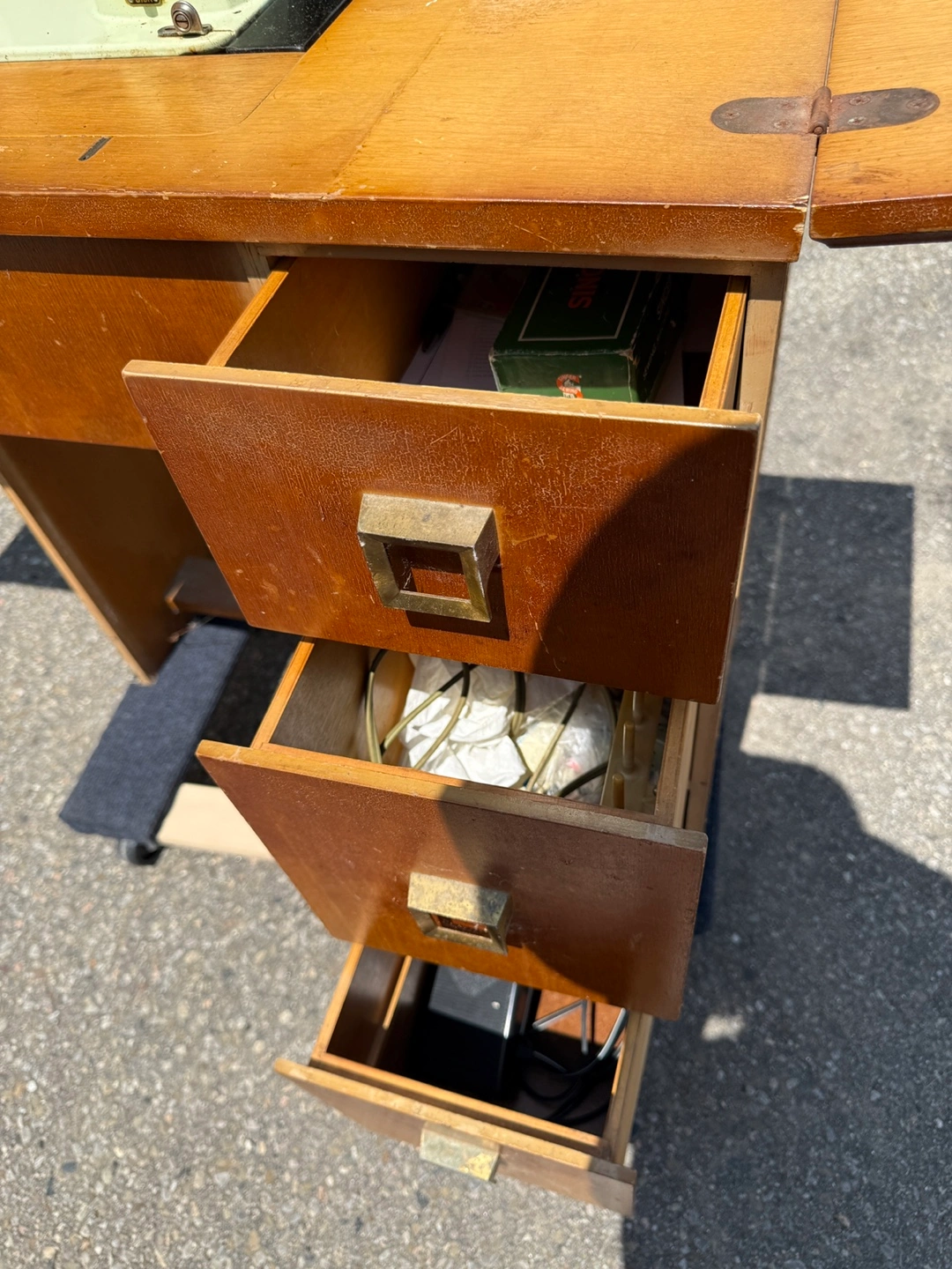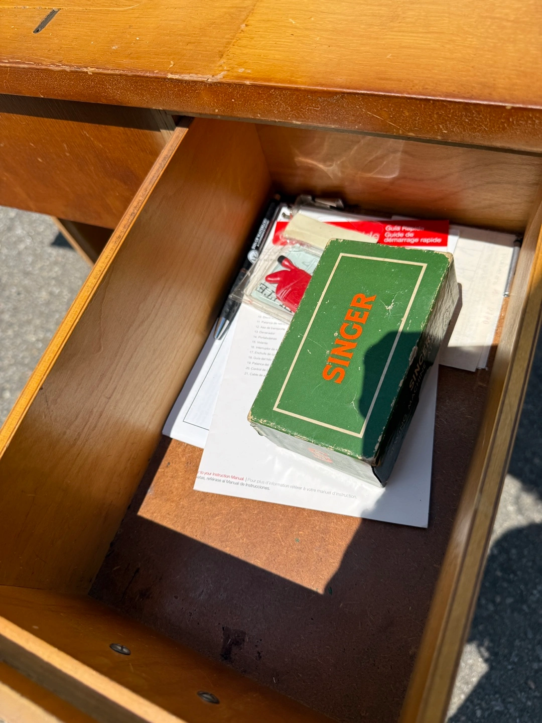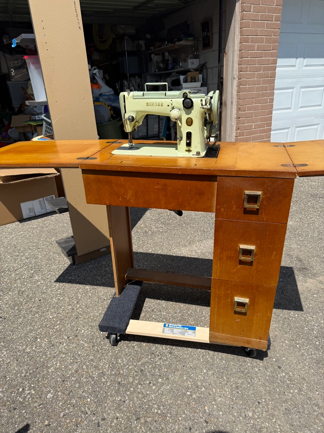 This Singer sewing machine comes with a desk, offering a blend of vintage charm and functionality for sewing enthusiasts. This classic machine features a durable build and smooth operation, perfect for various sewing projects. It includes a foot pedal and some accessories, ready for immediate use. The desk provides ample space for your materials and tools, making it an ideal addition to any sewing room. In great condition and you can come and try it out to see if it’s right for you! Additional details include: * Model: Singer * Includes: Foot pedal, accessories * Desk: Included with storage drawers
