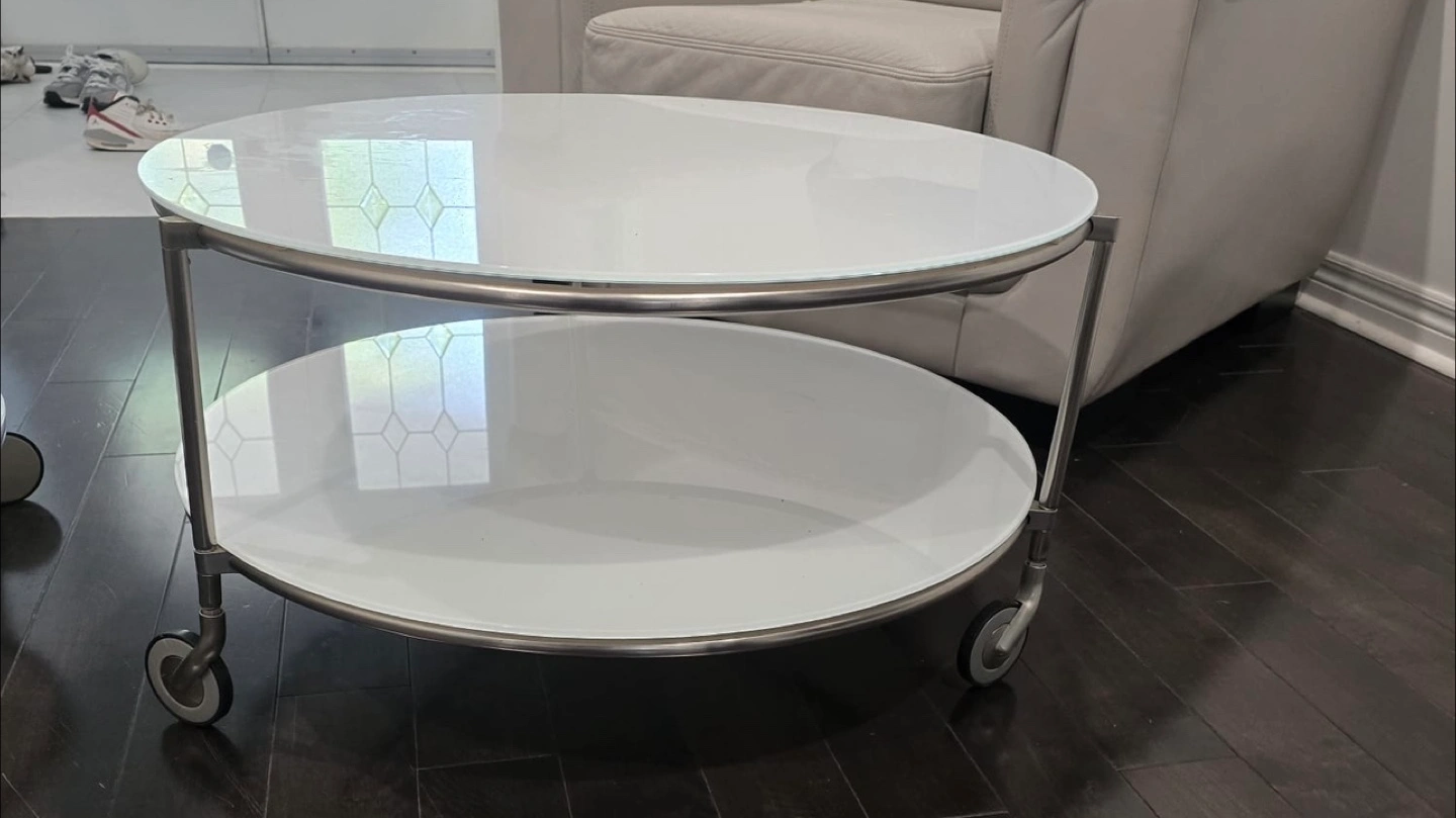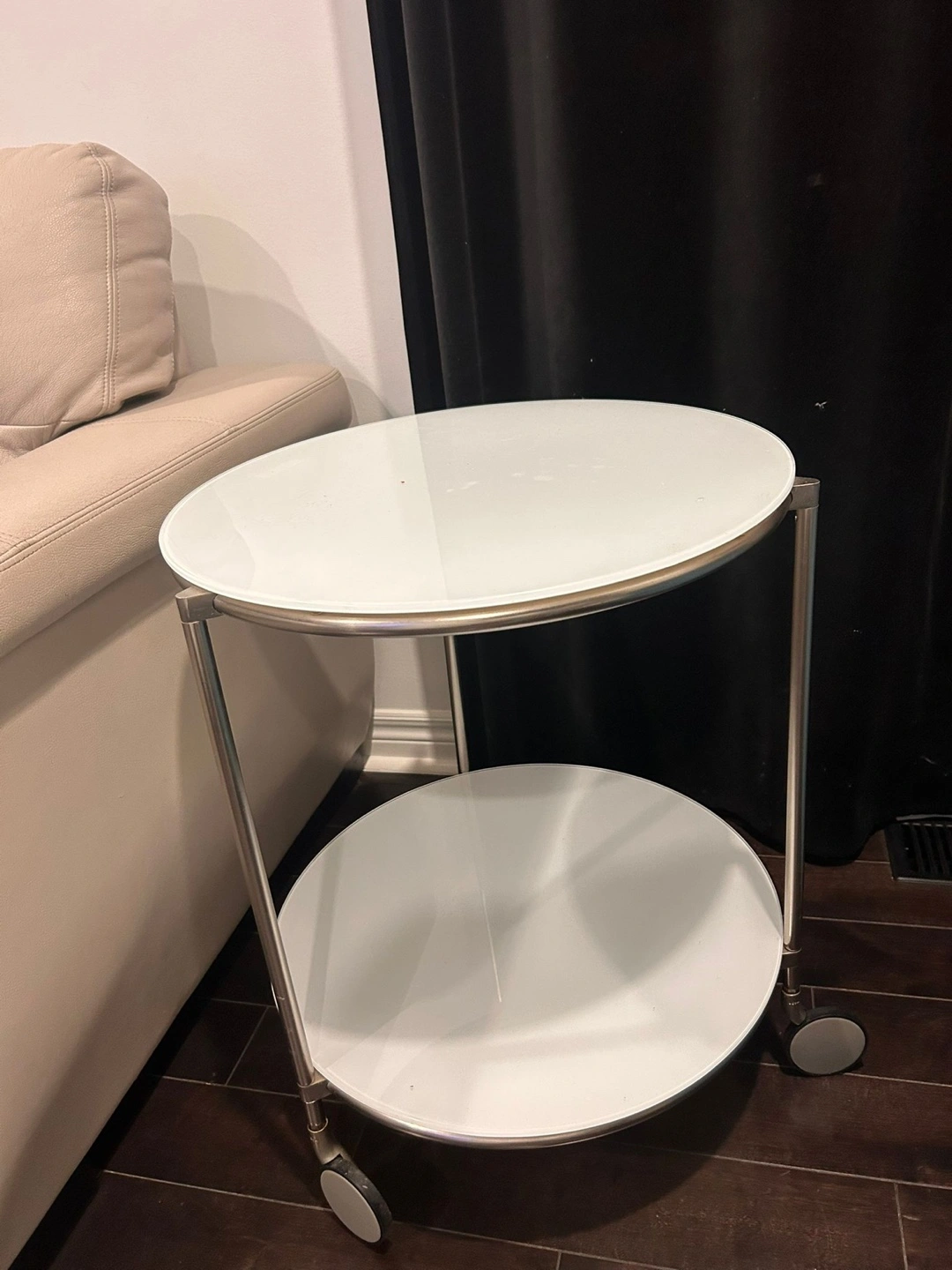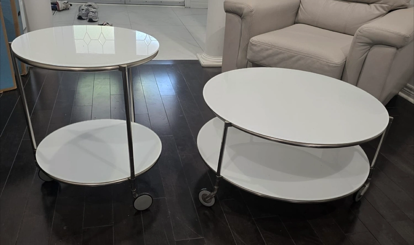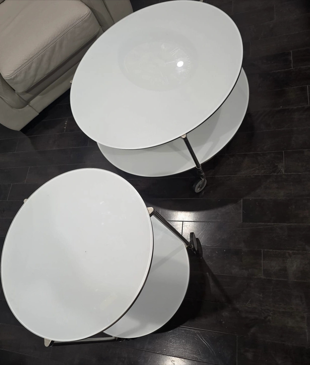 Selling a set of two side tables with white glass tops. They're in great shape and have a sleek, modern look. Perfect for adding a touch of elegance to your living space!
