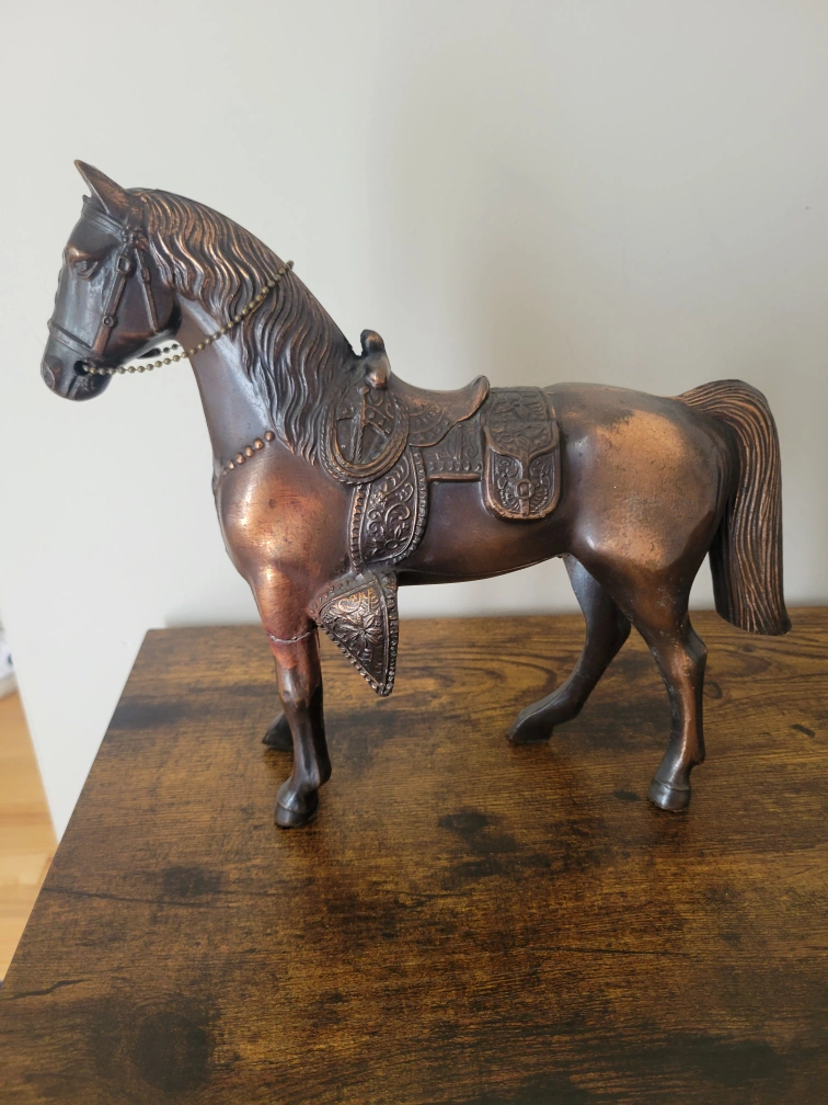 A beautiful vintage horse figurine, perfect for adding a touch of classic charm to your home decor. It has a lovely bronze-like finish and intricate detailing, especially on the saddle and bridle. This piece would look great on a bookshelf or mantelpiece!