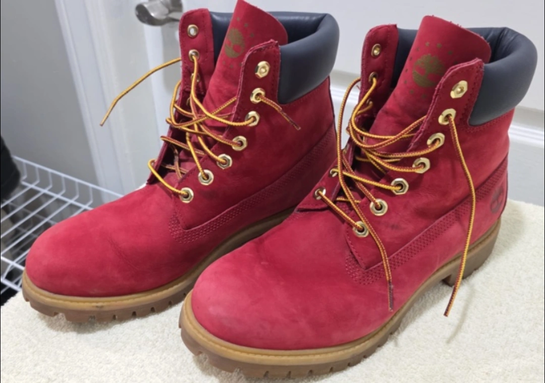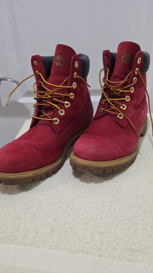 Classic Timberland boots in a vibrant red colour! These are a women's size 10. They're in great shape and ready for a new home. Perfect for adding a pop of colour to your wardrobe or braving the Canadian elements do not have original box selling $85 obo