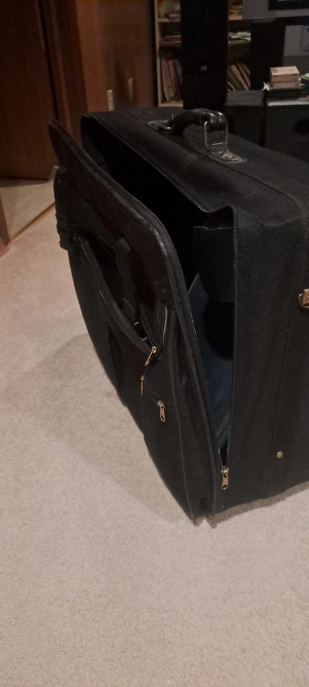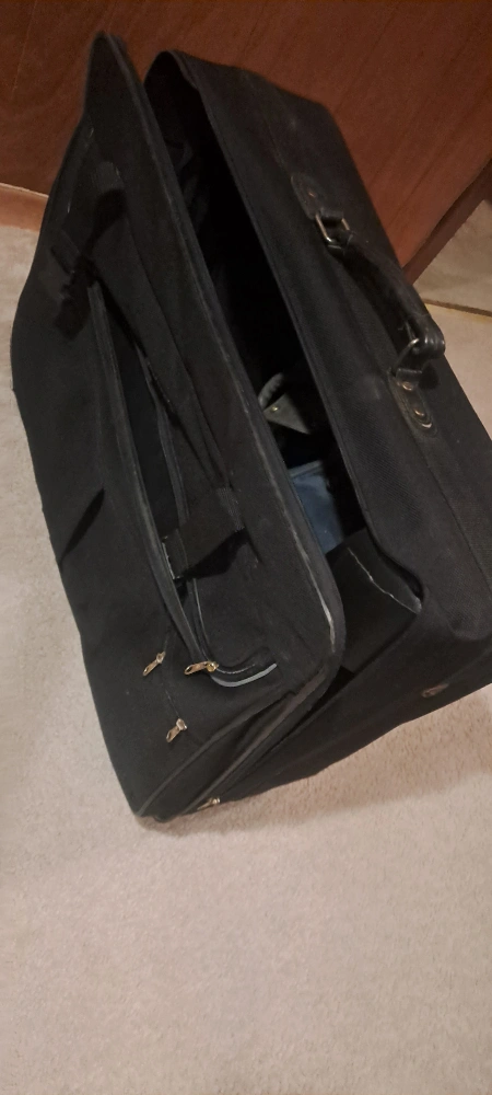 Selling a black wheeled samsolite luggge.It's in good condition and ready to help you travel with your suits and dresses! It features multiple zippered compartments for organization and a convenient handle for easy transport w 26 in h 10 in depth 8 in