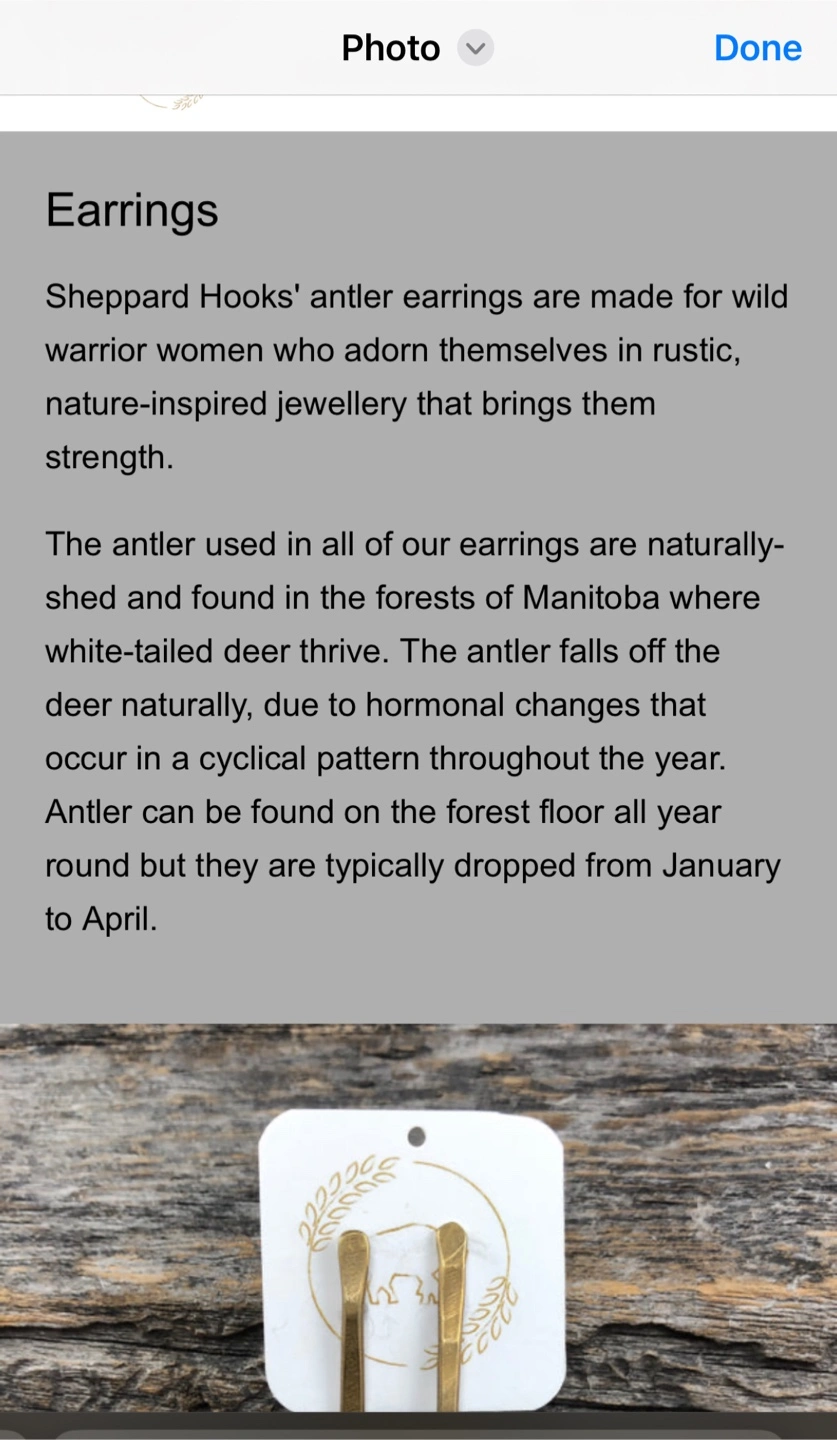 These unique earrings from Sheppard Hook feature naturally-shed antler found in Manitoba's forests, making them a beautiful, nature-inspired accessory They are handmade and each pair is unique . Located in Osborne Village with easy accessible driveway for pickup . These gorgeous antler earrings are made in Manitoba by Sheppards Hooks . They are brand new and never worn . Reg retail is 65.00 They would make for a very special gift for yourself or a friend . There is no little card like on the website but they are boxed and ready for their new home . Accepting etransfer or cash
