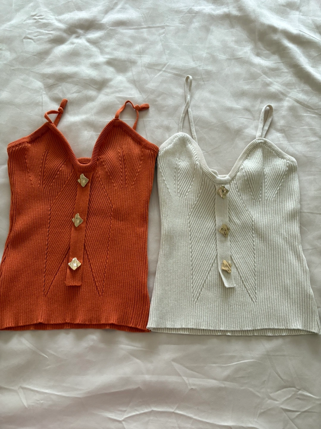 Selling two adorable knit tank tops! One is a lovely burnt orange colour, and the other is a soft white. Both have cute button details and are in great condition. Perfect for layering or wearing on their own!