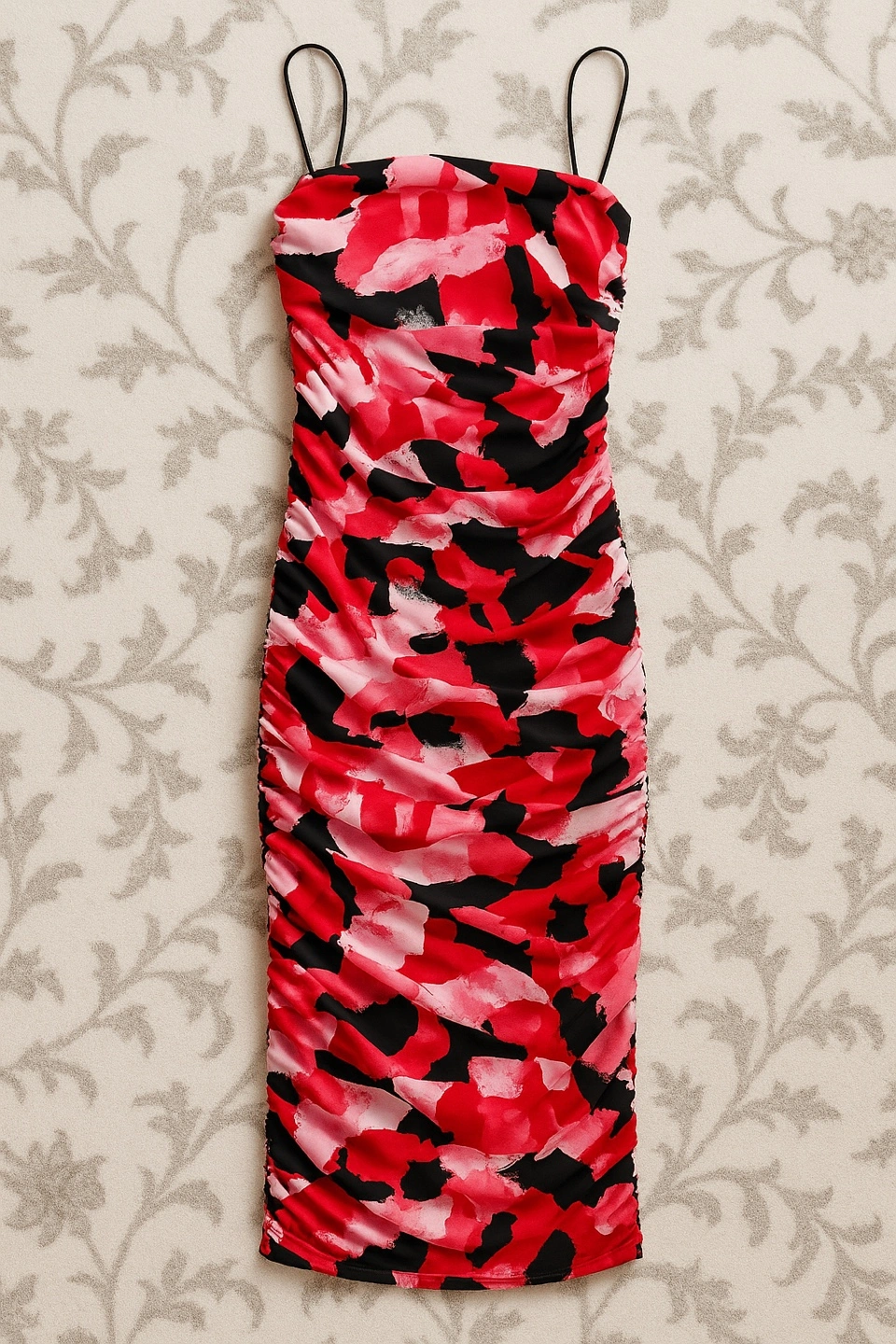 Selling a cute dress with a vibrant red and black abstract print! It's ruched for a flattering fit and has thin black straps. Perfect for a night out or a special occasion