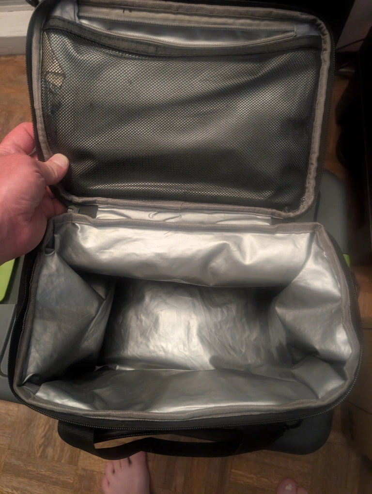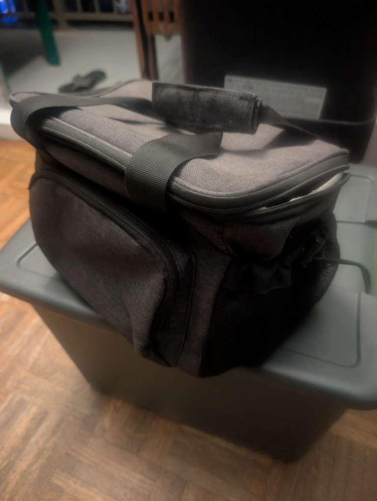Here's a grey insulated lunch bag! The ice bag zipper in the lid is broken, but it's in good shape otherwise.