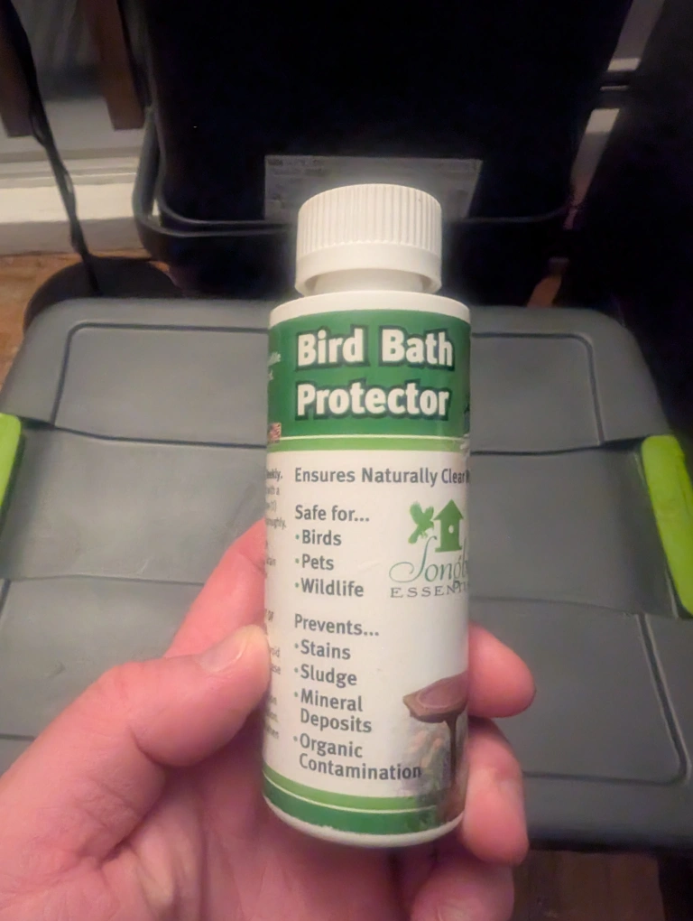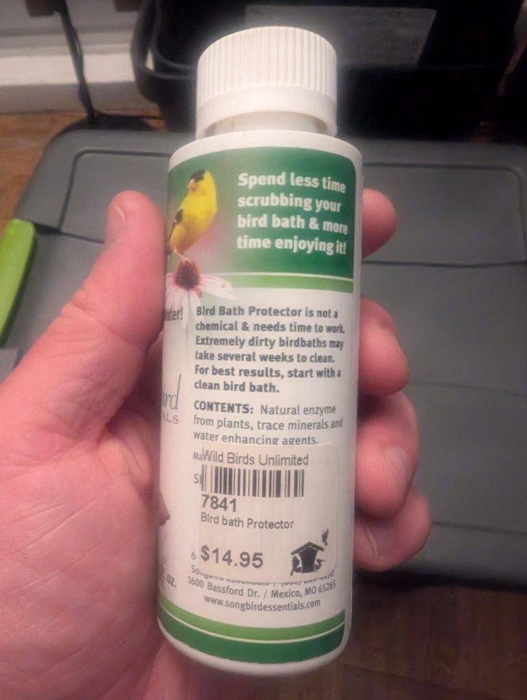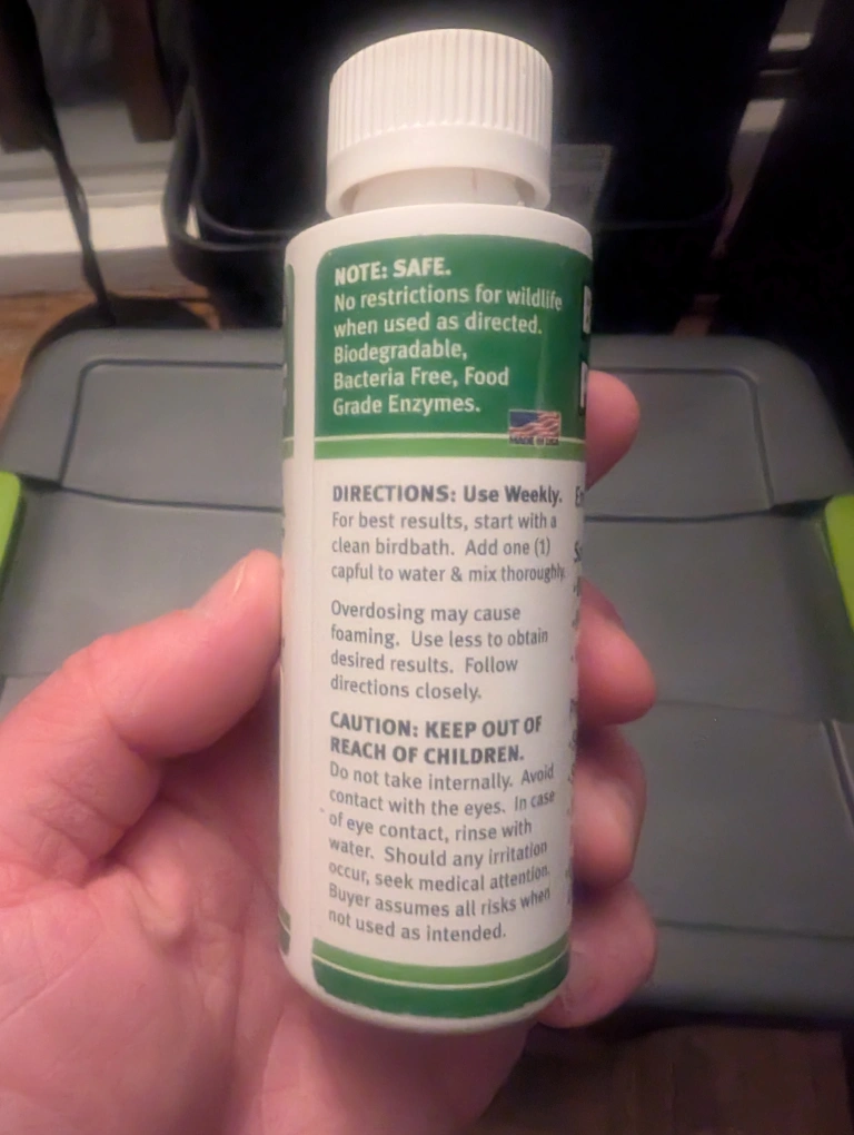 Keep your bird bath clean and healthy with Songbird Essentials Bird Bath Protector! It's a natural enzyme formula that helps prevent stains, sludge, mineral deposits, and organic contamination. Safe for birds, pets, and wildlife. 99% full.
