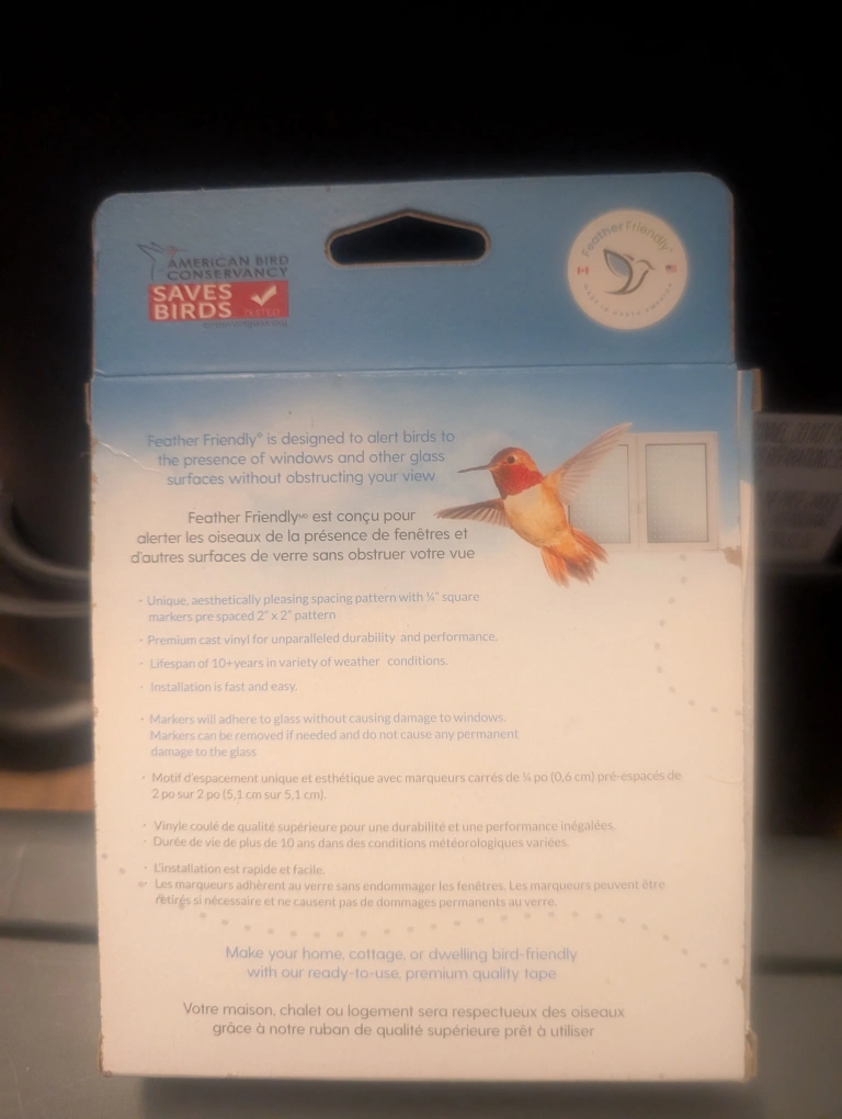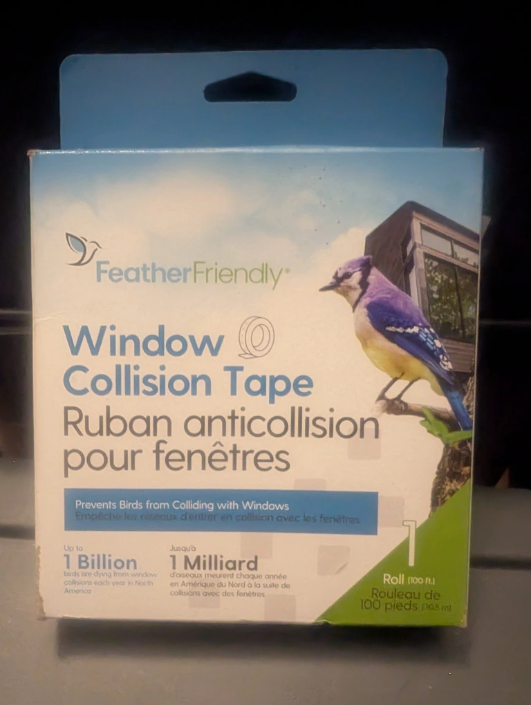 Selling half a roll of Feather Friendly window collision tape! This tape helps prevent birds from colliding with windows by alerting them to the presence of glass surfaces. It's easy to install and can be removed without damaging the glass. Each roll contains 100 feet (30.5 m) of tape.