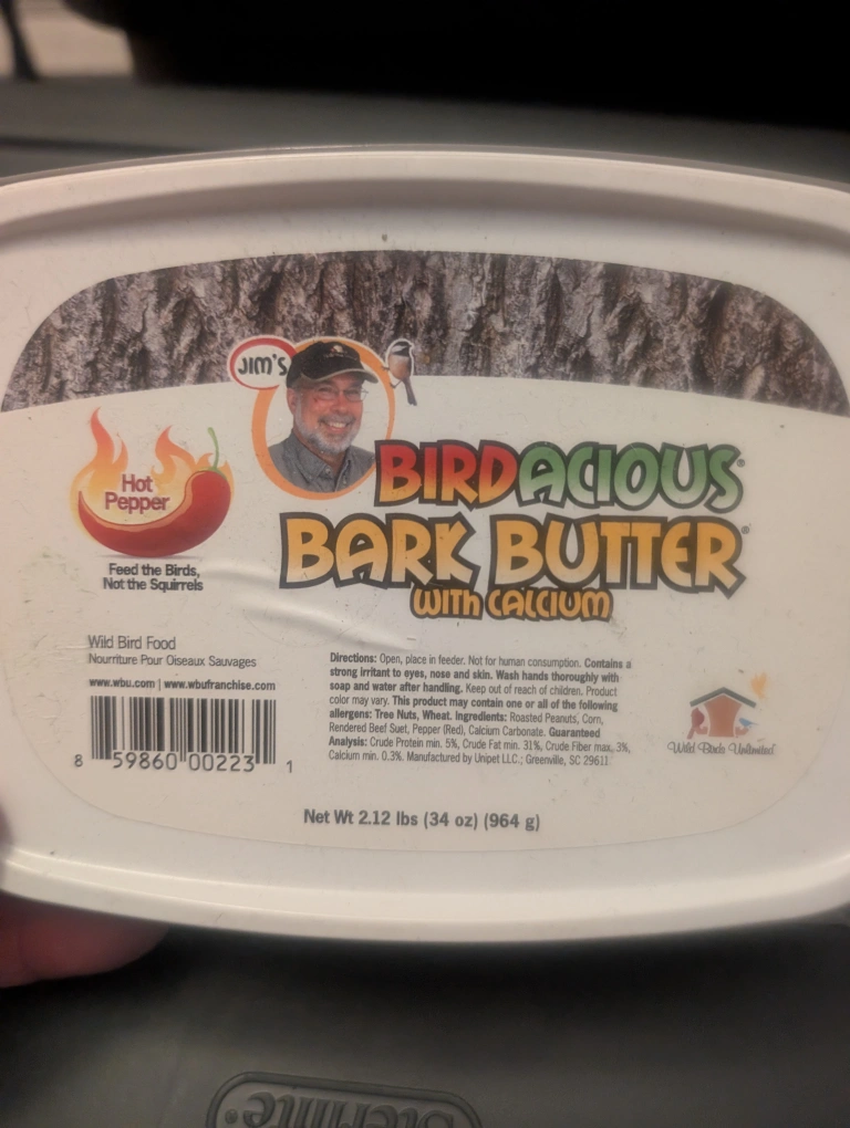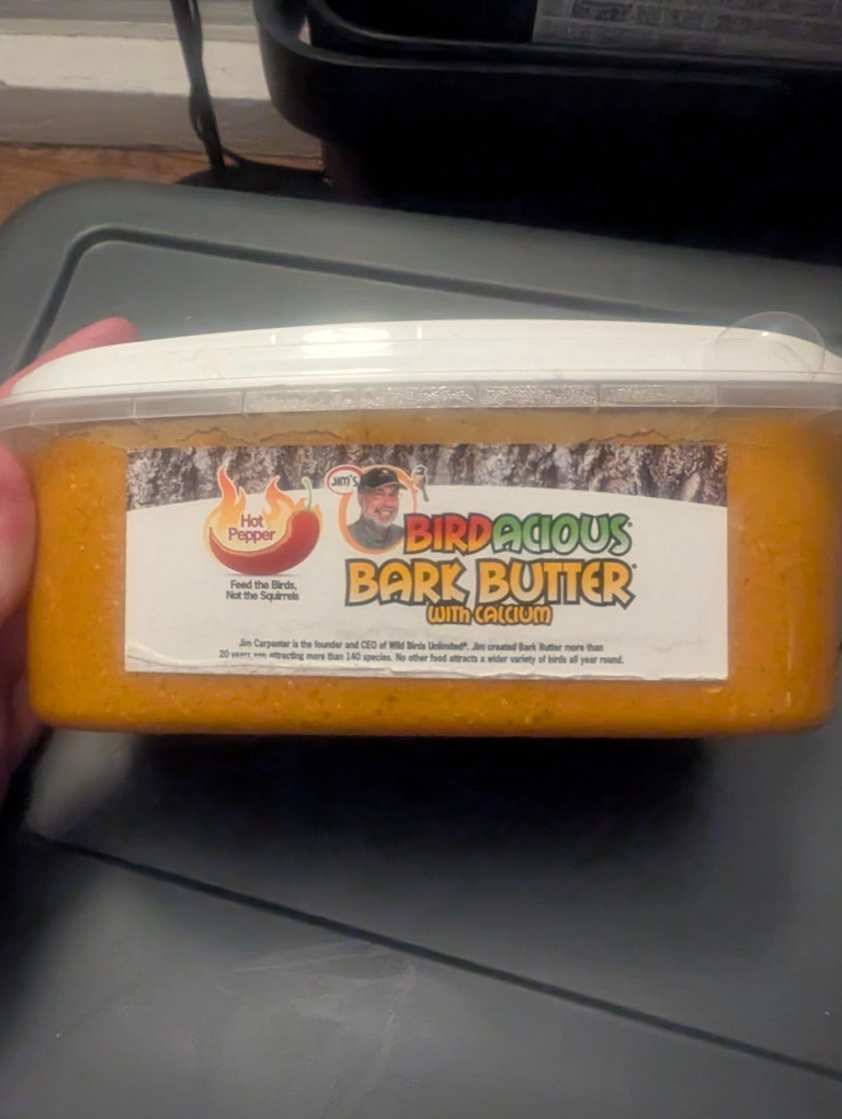 Selling a container of Birdacious Bark Butter with Calcium (99% full). It's a nutritious wild bird food that attracts a variety of birds all year round. Infused with hot peppers, this bark butter is squirrel/mammal proof, lesving more for visiting birds.