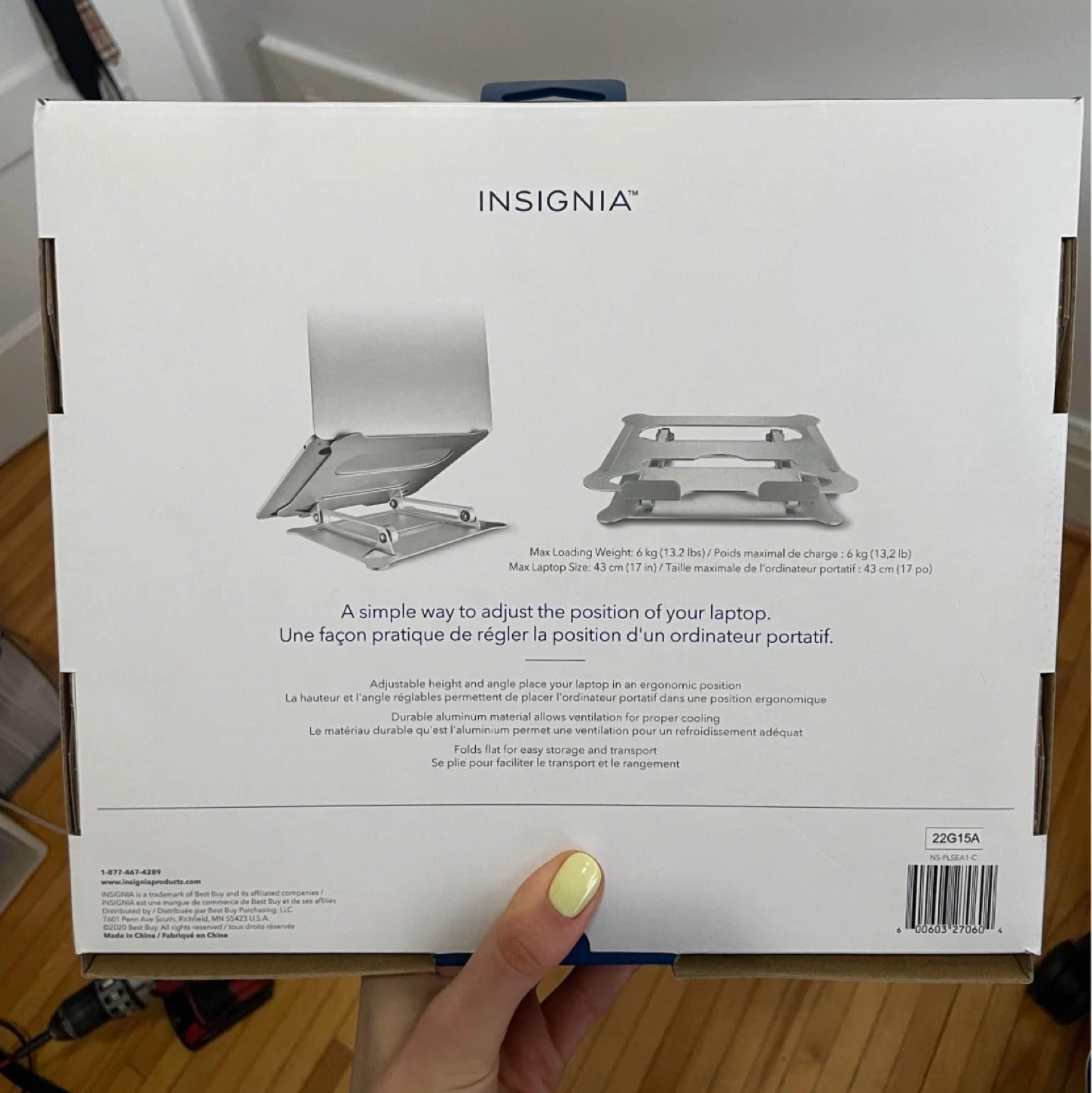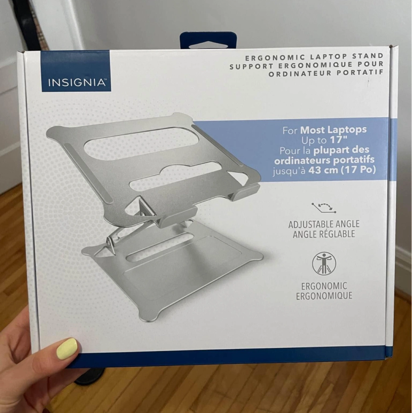 New without box fully adjustable laptop stand. Beautiful, sturdy adjustable stand but sadly just doesn’t work for my space. Purchased from Best Buy and I believe it retails for over $90.