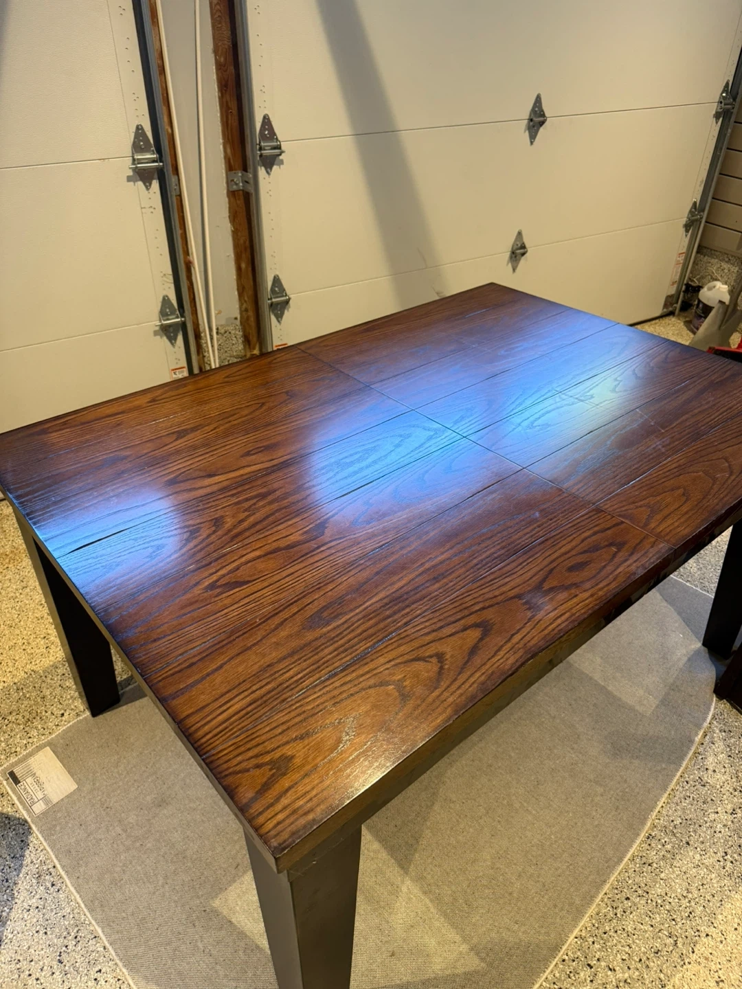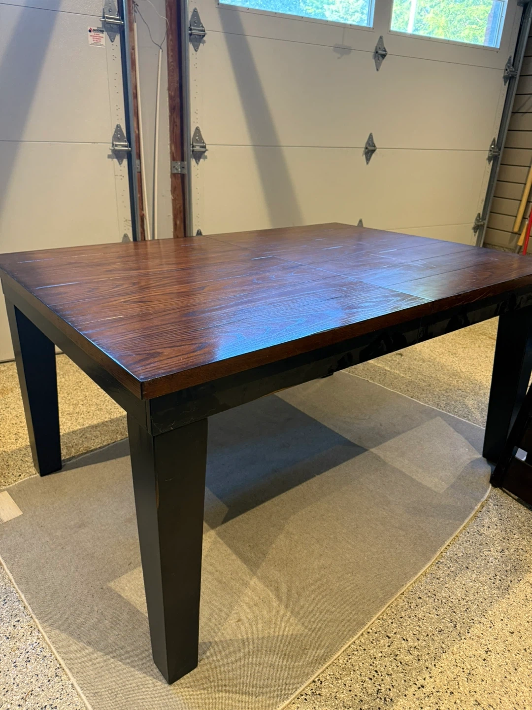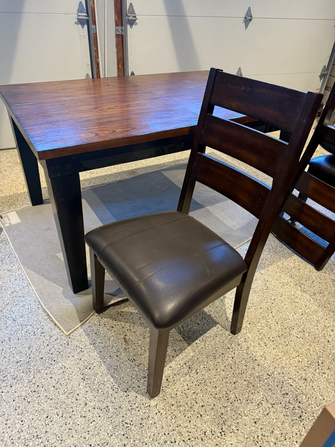 Selling an 6 piece dining table with leaf to make 8 person set and 8 chairs. The table has a dark wood finish on top with black legs. The chairs are upholstered with brown leather. Great condition and ready for a new home! Also comes with a matching sideboard *table and chairs easy to disassemble for transport*