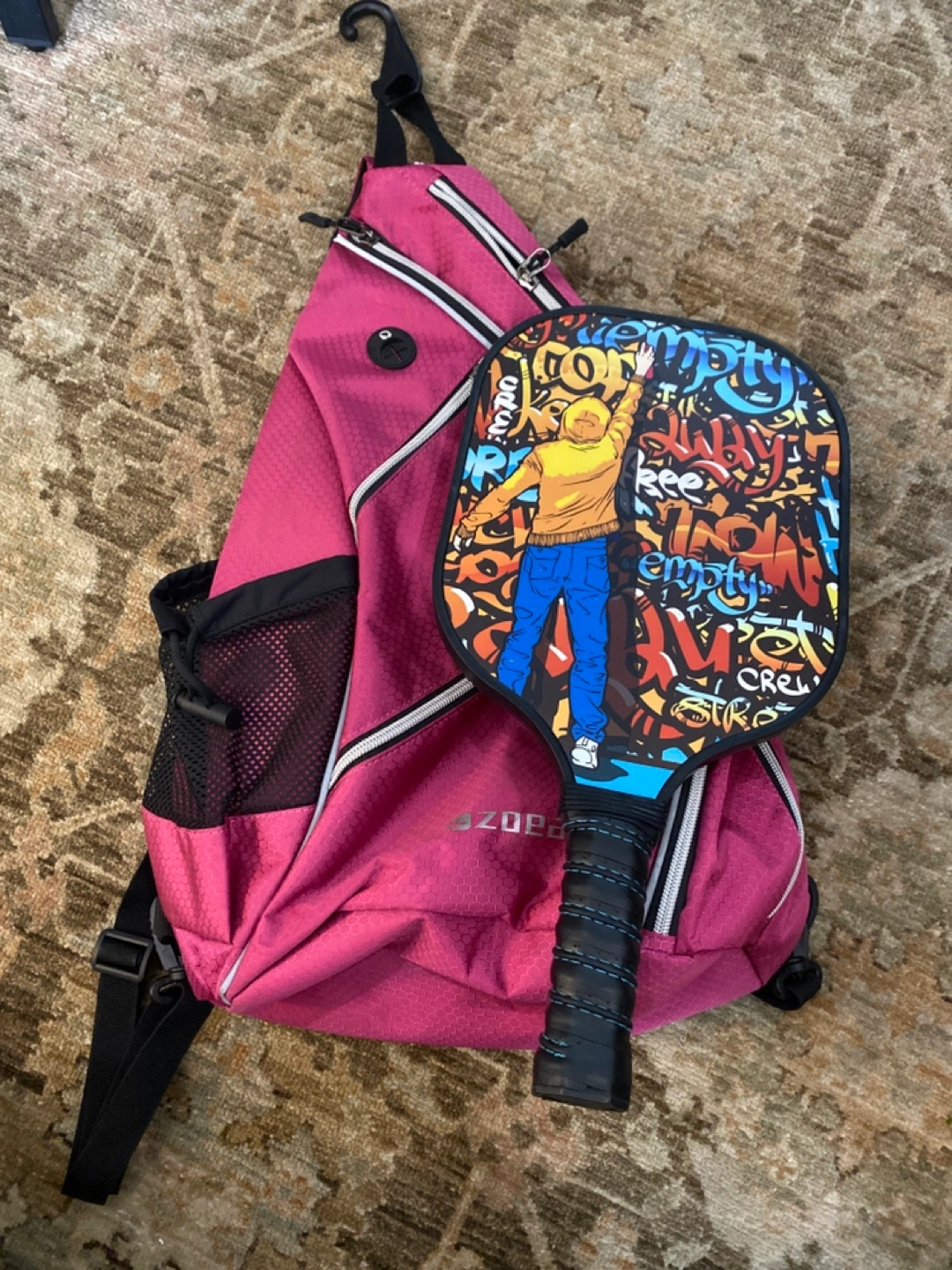 Selling a Zoea sling bag and a pickleball paddle with a cool graffiti design! The sling bag is a vibrant pink colour and has a handy mesh pocket. The paddle has a unique graphic on it.