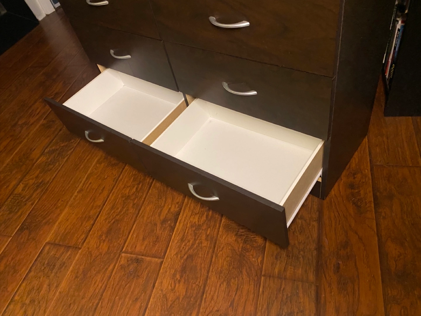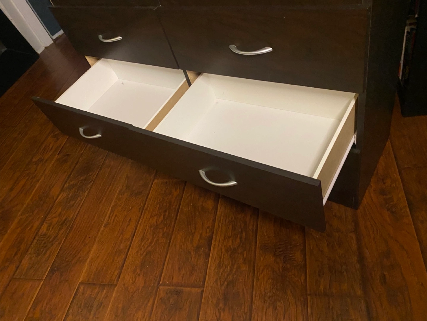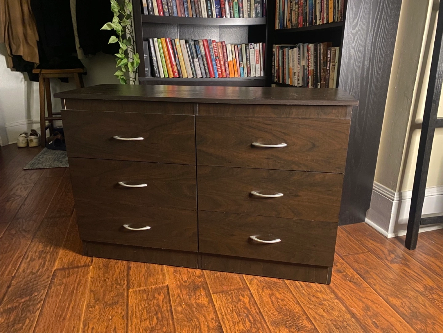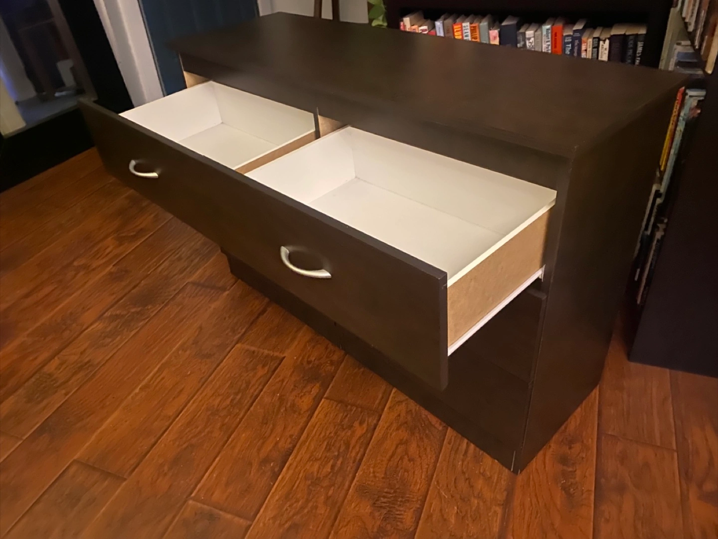 Long dresser in great shape. Sturdy. Modern styling. All the drawers slide in and out perfectly on metal tracks. Drawers come to a stop when fully retracted. All the drawers are clean. Smoke-free / pet-free household. No odours. Delivery is included in the price, available throughout HRM. $160 Exact Measurements: Height: 30.3 inches (or 2 FT & 6.3 inches). Width: 45.5 inches (or 3 FT & 9.5 inches). Depth: 15.5 inches (or 1 FT & 3.5 inches). *** Fine print stuff: Delivery Only. Free delivery within HRM only. Item is released from secure storage. Right to refuse on delivery. This item includes delivery/handling by 2 people to carefully place it where you ask.