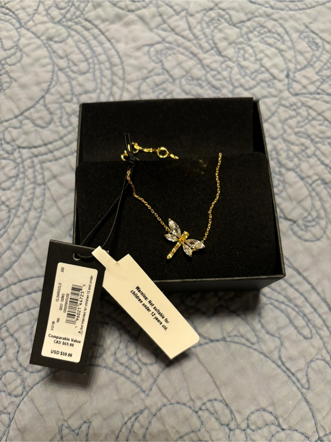 This is a really pretty dragonfly gold bracelet. It comes with a gift box. Retails for $69 CAD.