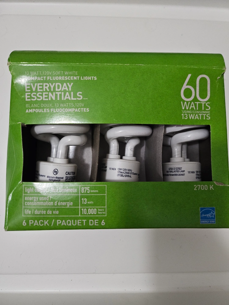 Selling a 6-pack of Everyday Essentials compact fluorescent lights. These are 13-watt, 120V soft white bulbs. They use 13 watts of energy and have a life of 10,000 hours. Each bulb emits 875 lumens and has a colour temperature of 2700K. Great for everyday use!