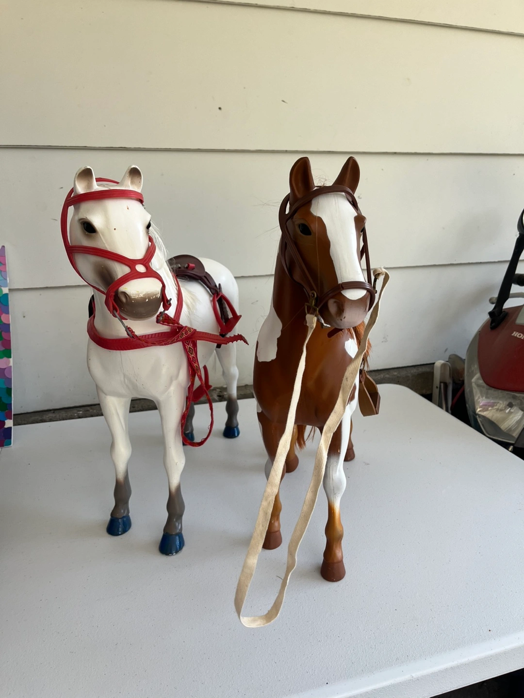 Two American Girl horses are ready for a new home! One is brown and white, and the other is white with red tack. White $10 Brown $10 - sold