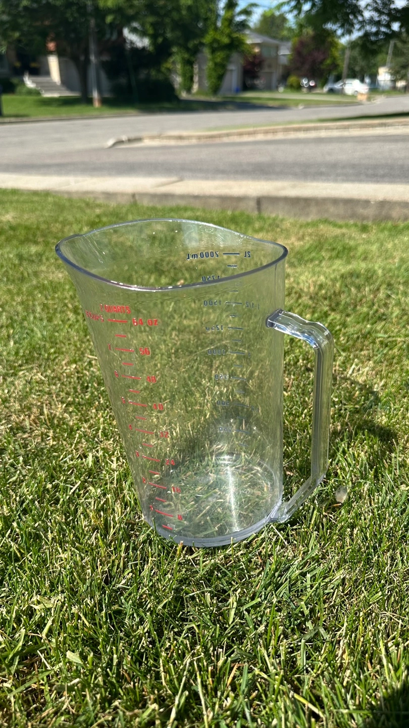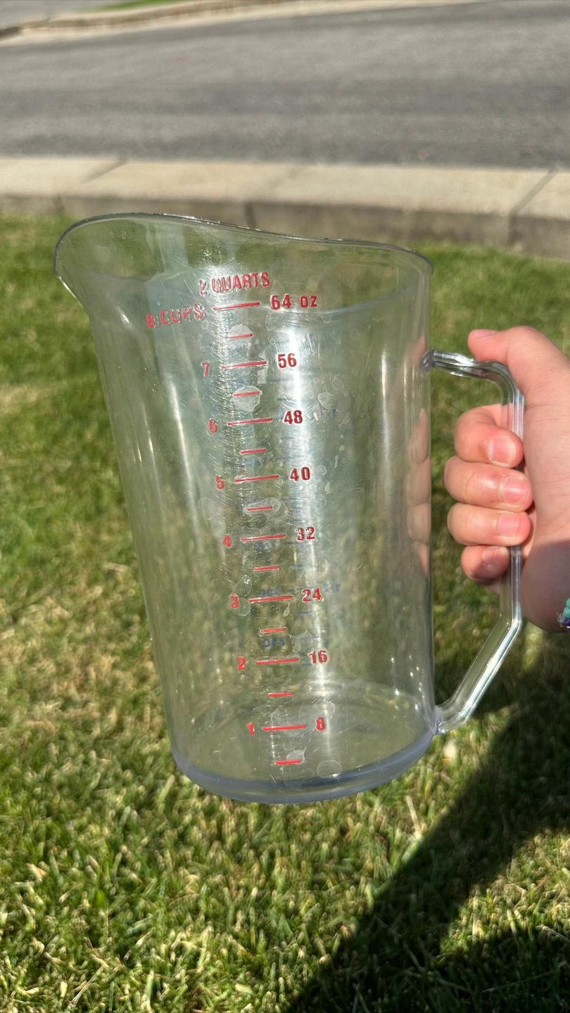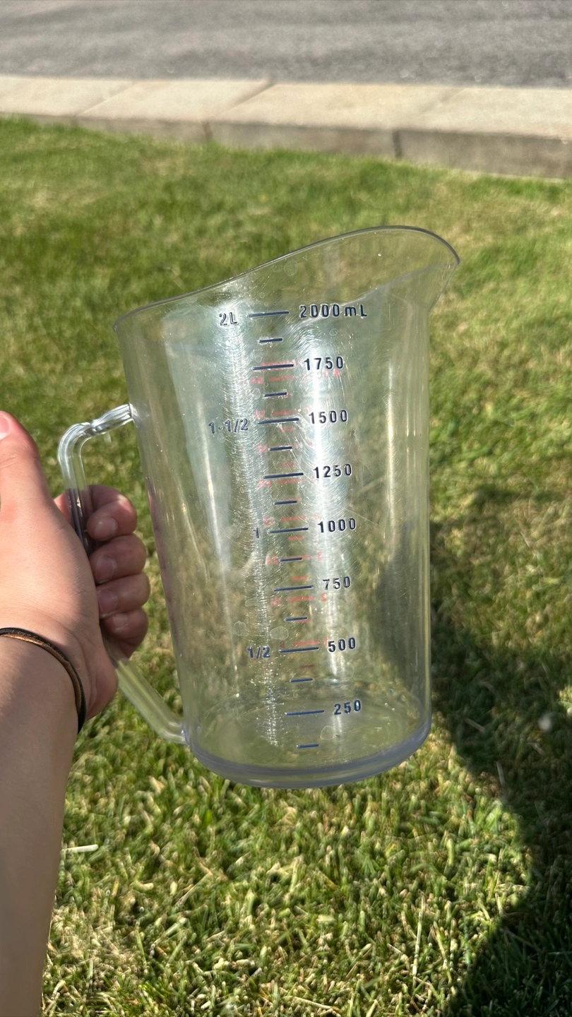 Selling a clear measuring cup, perfect for all your baking and cooking needs! It has both metric (mL) and imperial (oz, cups, quarts) measurements marked clearly on the side. It's a 2-litre capacity cup, so it's great for larger recipes