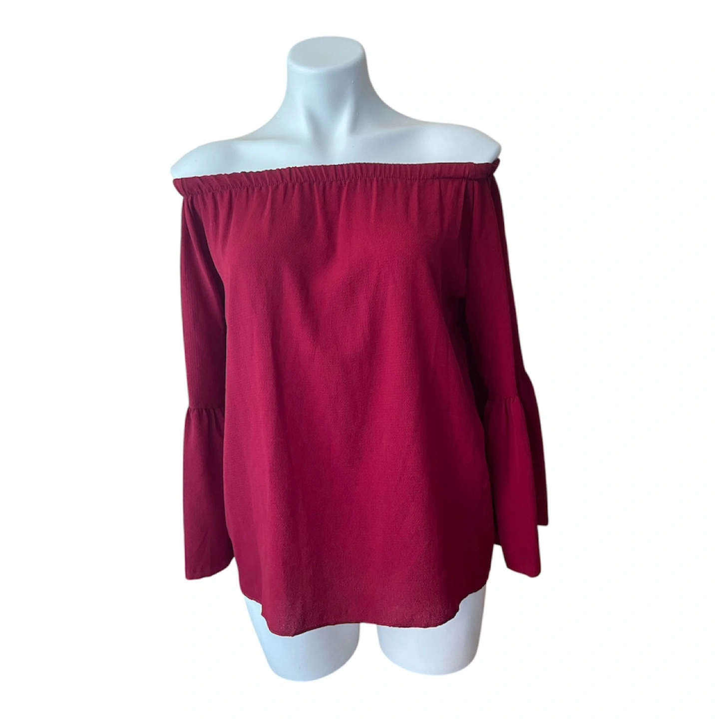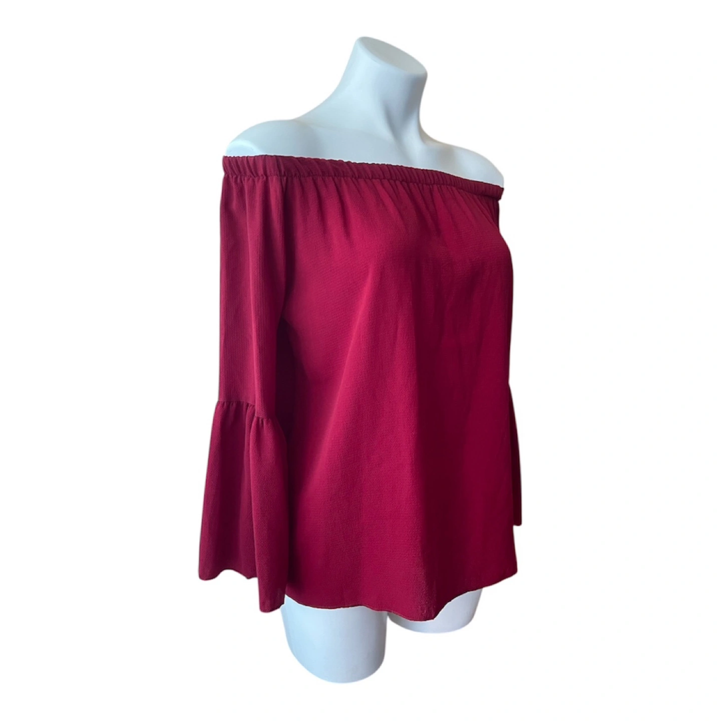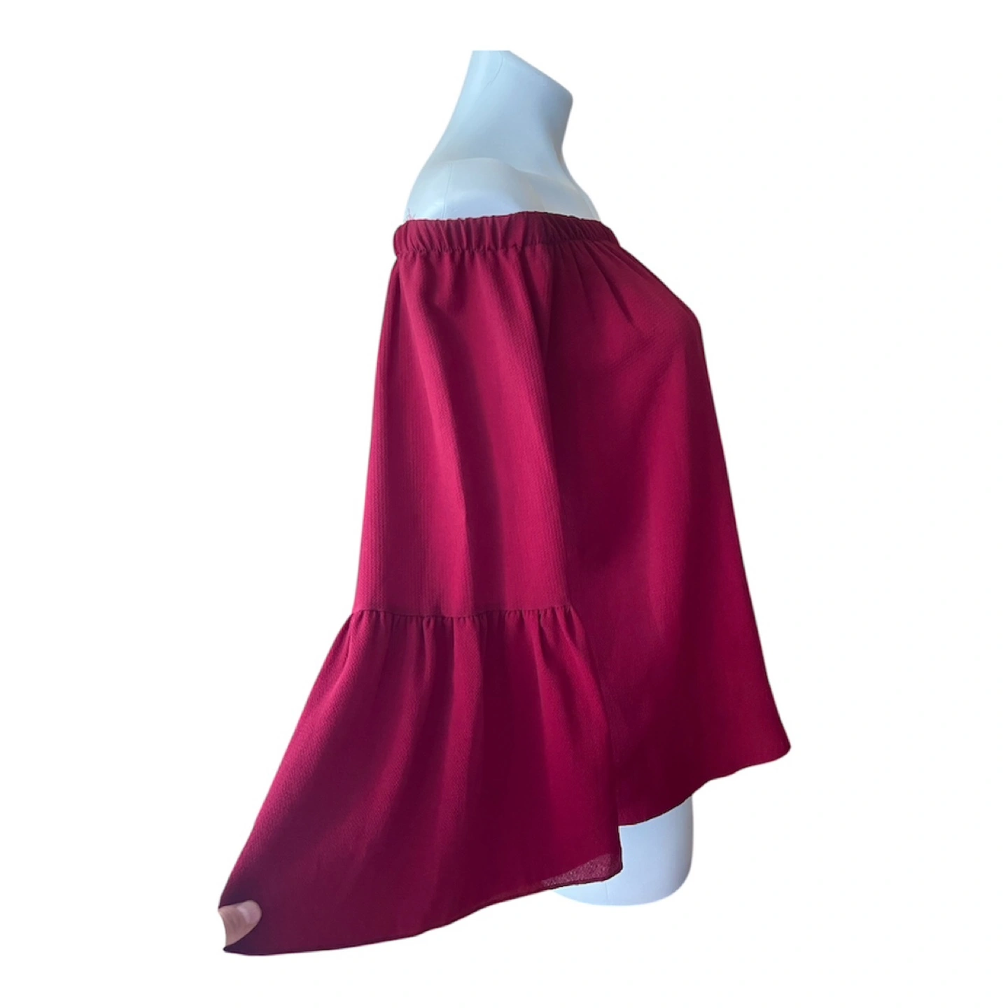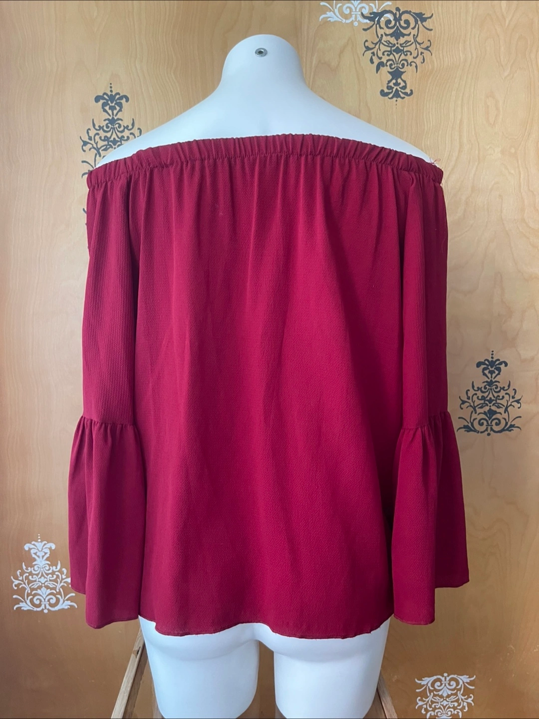 NEW Y2K Style Off The Shoulder Burgundy Blouse Bell Sleeves S/M Condition: 10/10. No Stains/Rips/Tears. Measurements (Inches): **Mannequin is overall size medium **Clothing measured on flat surface - ONLY LEFT TO RIGHT - NOT ALL AROUND CIRCUMFERENCE Size: S/M Shoulder to shoulder: 20 Bust: 20 Waist: 25 Hips: 25 Sleeve Length: 20 Armpit Width: 10 Length from shoulder to bottom hem: 20 Style Details: Off the shoulder - elasticity hemline to adjust to your size & comfort Relaxed fit Long bell sleeves - flared Color: dark red/burgundy