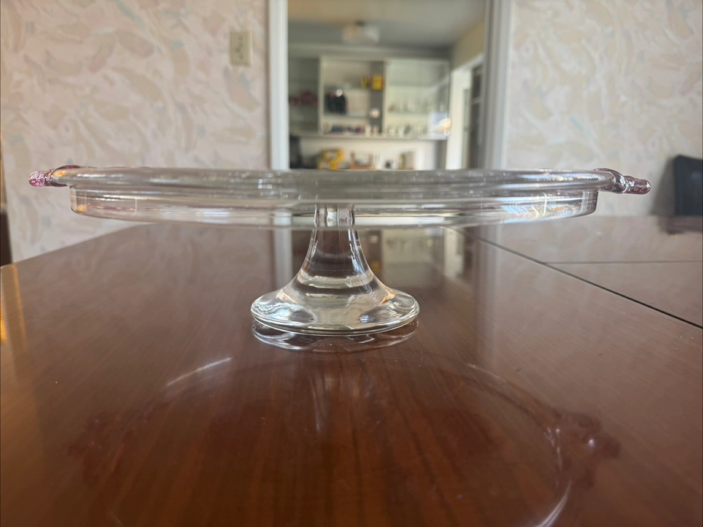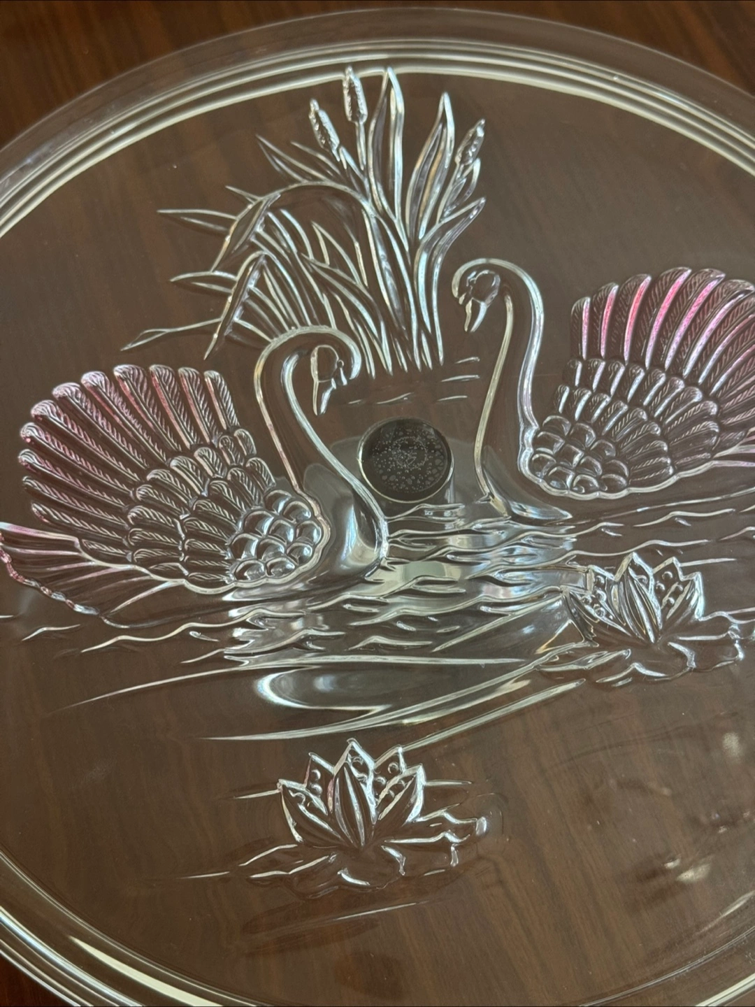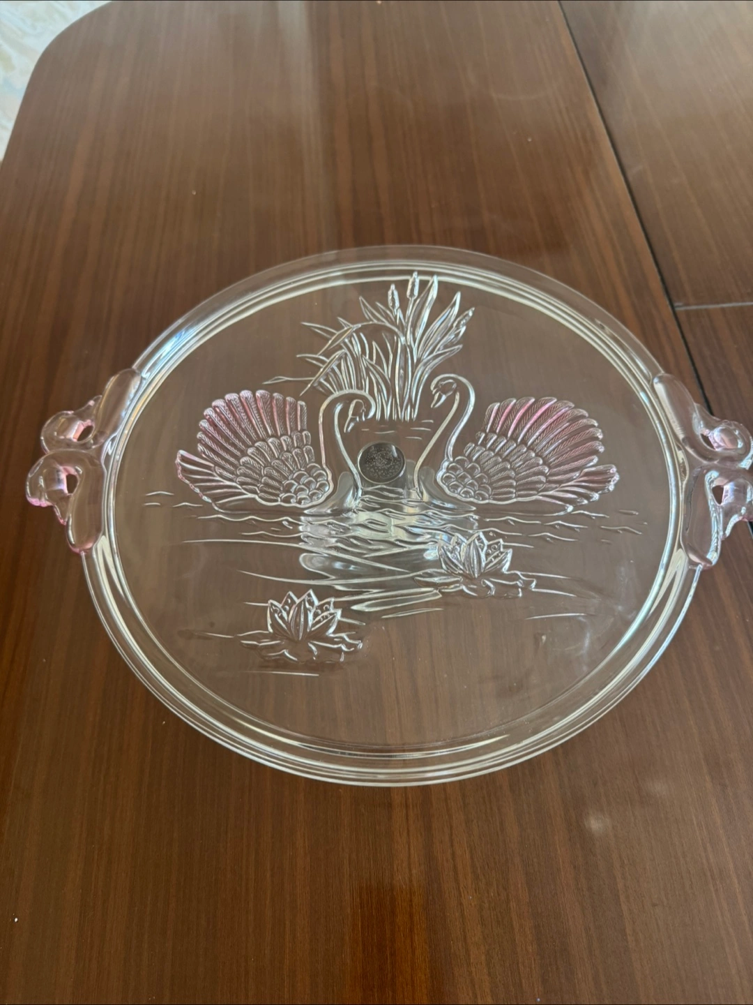 Selling a beautiful vintage glass cake stand featuring an elegant swan design. It's perfect for displaying your favourite cakes or desserts at your next gathering! The glass is clear with a delicate pink accents. It's in great condition and ready to add a touch of vintage charm to your kitchen or dining room MOVING SOON — please check other listings, the more you take off my hands, the more I’ll discount it :)