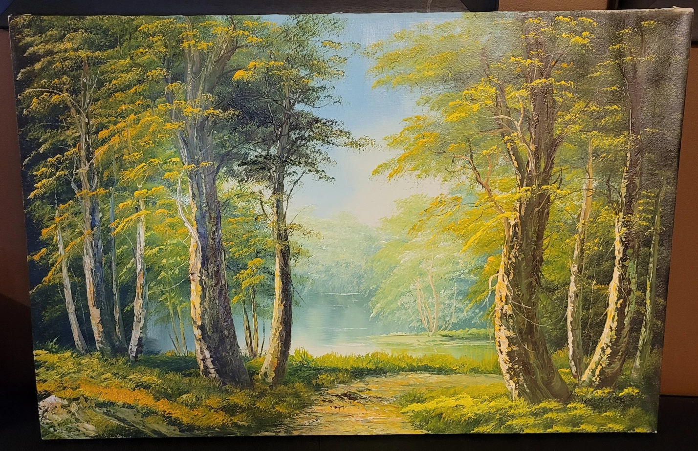A lovely landscape painting is up for grabs! It depicts a serene forest scene with a small lake in the background. Perfect for adding a touch of nature to your home
