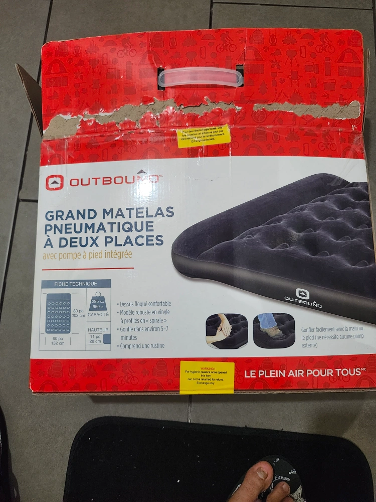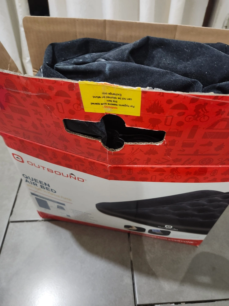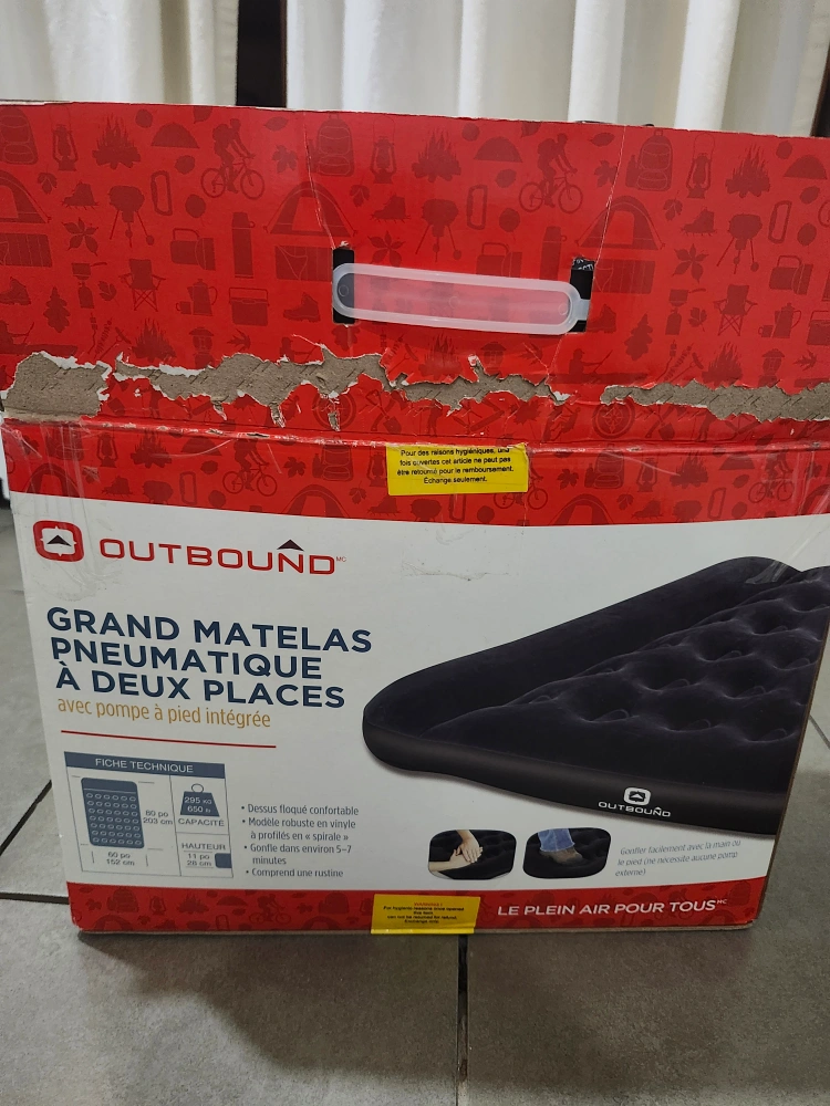 Selling an Outbound queen air bed! It comes with a built-in foot pump for easy inflation. The box is included, though it's a little beat up. The air bed itself is in great condition and ready for your next camping trip or guest it has stains from keeping it but overall it's perfectly in good shape