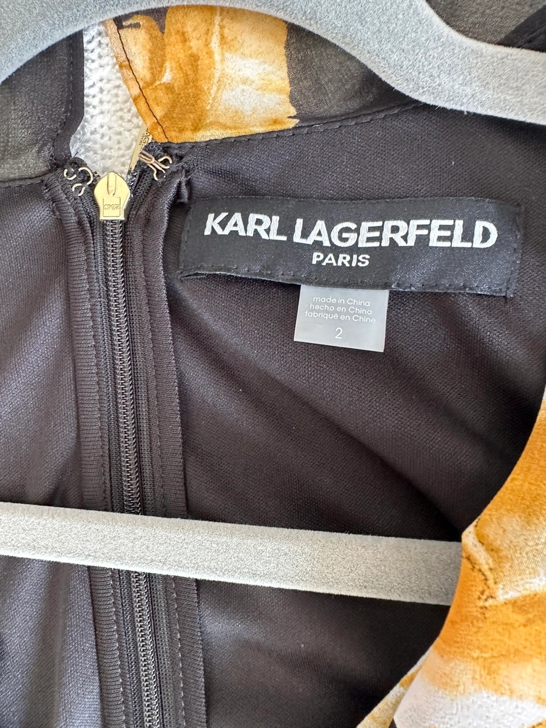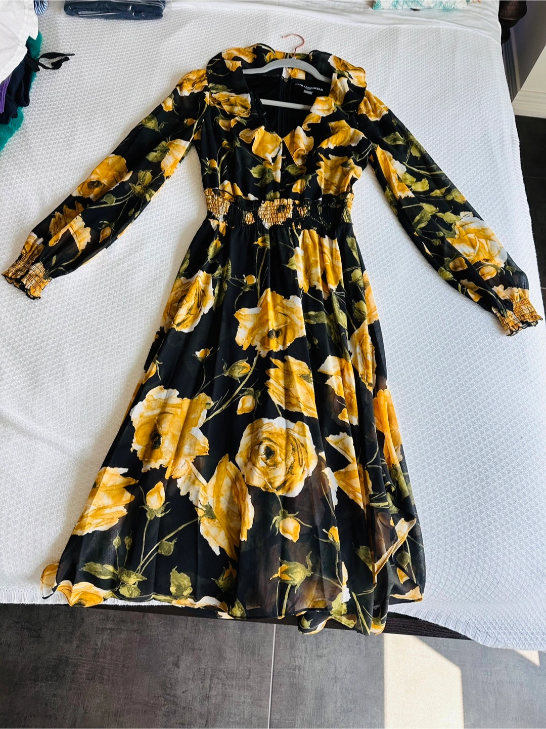 Selling a beautiful Karl Lagerfeld Paris dress in size 2. It features a lovely floral pattern with yellow roses on a black background. The dress has long sleeves and a flattering silhouette. Perfect for any occasion! Used only once in a cruise.