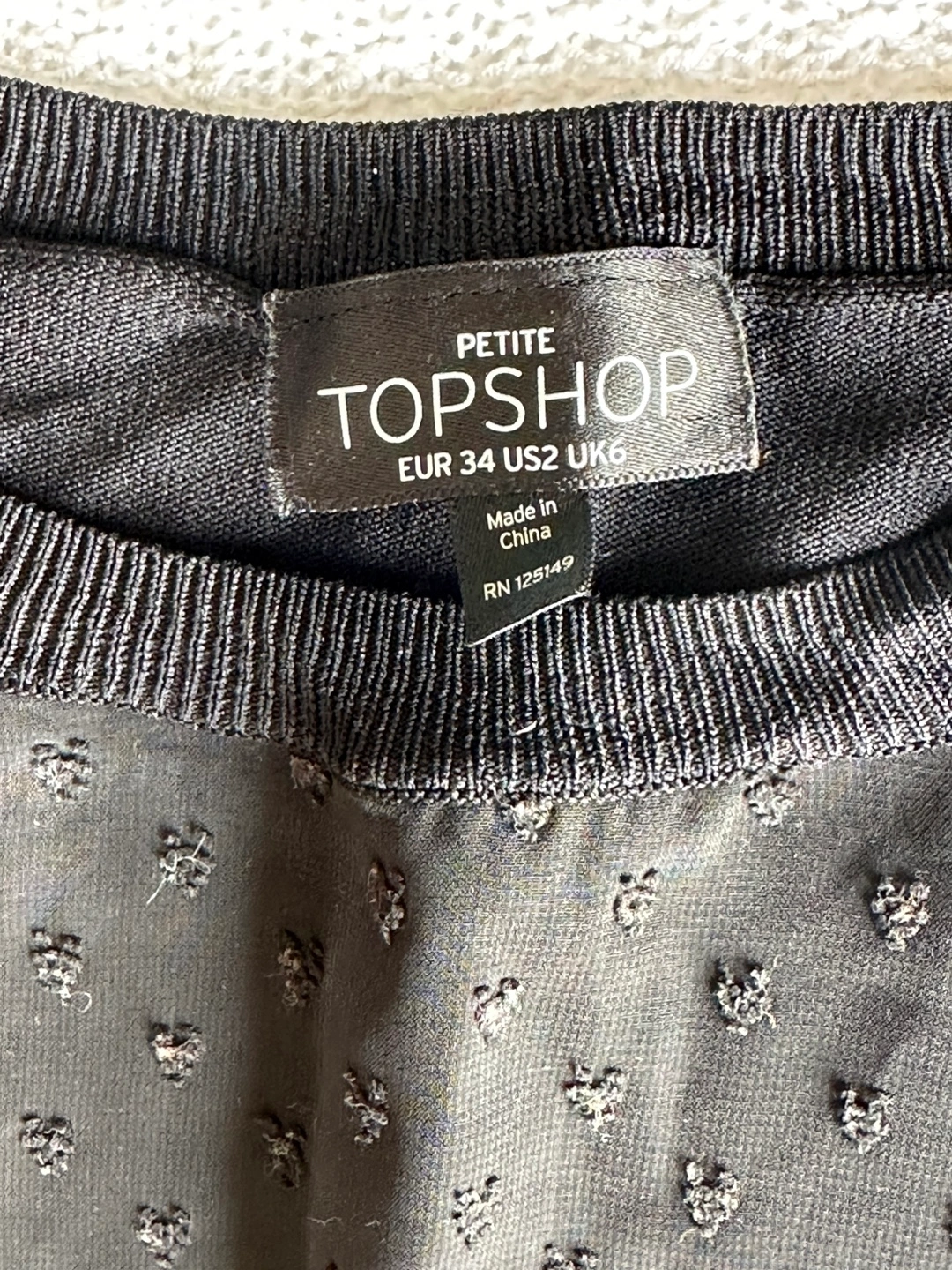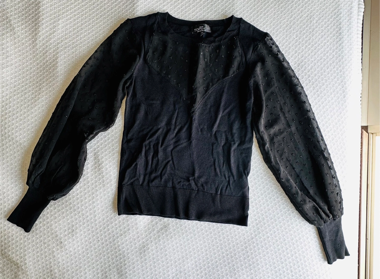Selling a cute Topshop Petite black blouse. It's in great condition and features sheer, dotted sleeves. Size is US 2 / UK 6 / EUR 34.