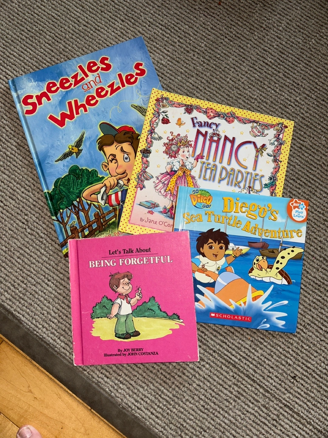 Selling a bundle of kids' hardcover books in good condition! Includes: - Sneeze and Wheezles by Marion Passey - Diego's Sea Turtle Adventure - Fancy Nancy Tea Parties by Jane O'Connor - Let's Talk About Being Forgetful by Joy Berry