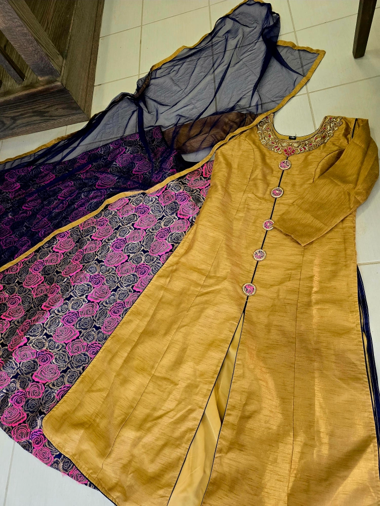 Selling a beautiful gold salwar kameez with a dupatta. The kameez has a unique button design and intricate detailing around the neckline. The dupatta is a lovely complement with its floral pattern and sheer fabric. Perfect for a special occasion or adding a touch of elegance to your wardrobe!