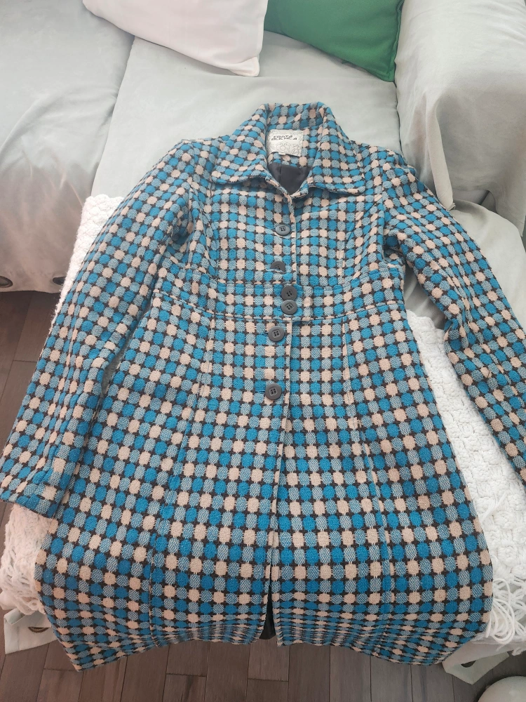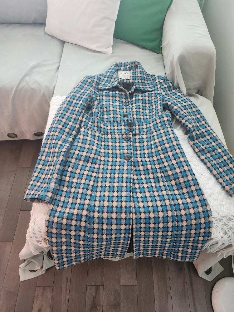 Check out this stylish coat! It has a unique plaid pattern in shades of blue, beige, and black. The wool blend material makes it warm and cozy for cooler weather. It's in great condition and ready for a new home!