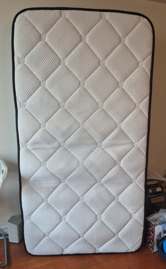 Selling a mattress with a white quilted pattern and black trim. It's in good condition and ready for a new home. Only available for pick up at the my place's lobby near college station.