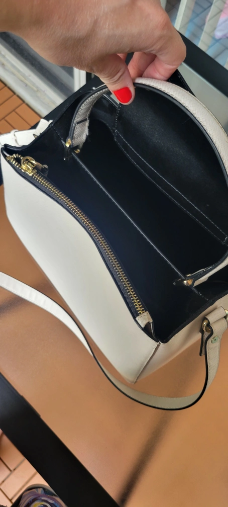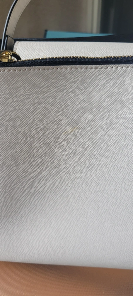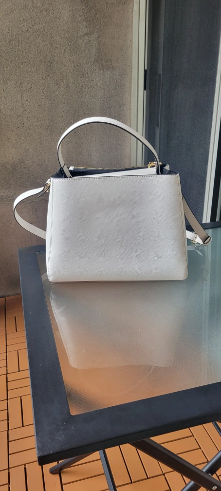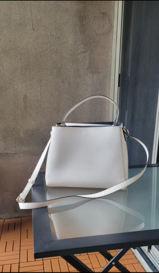 Here's a cute satchel in a lovely white colour! It's perfect for everyday use or for dressing up an outfit. It's never been used and is ready for a new home! Has two small light yellow stains on it from storage. Please see pics.